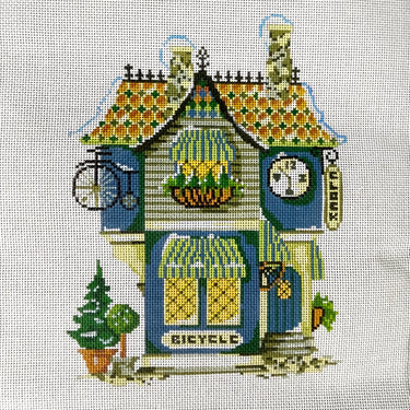Bicycle and Clock Shop handpainted needlepoint canvas, #KWV11-18, from the Kelly Clark Christmas Village. Retail $150.