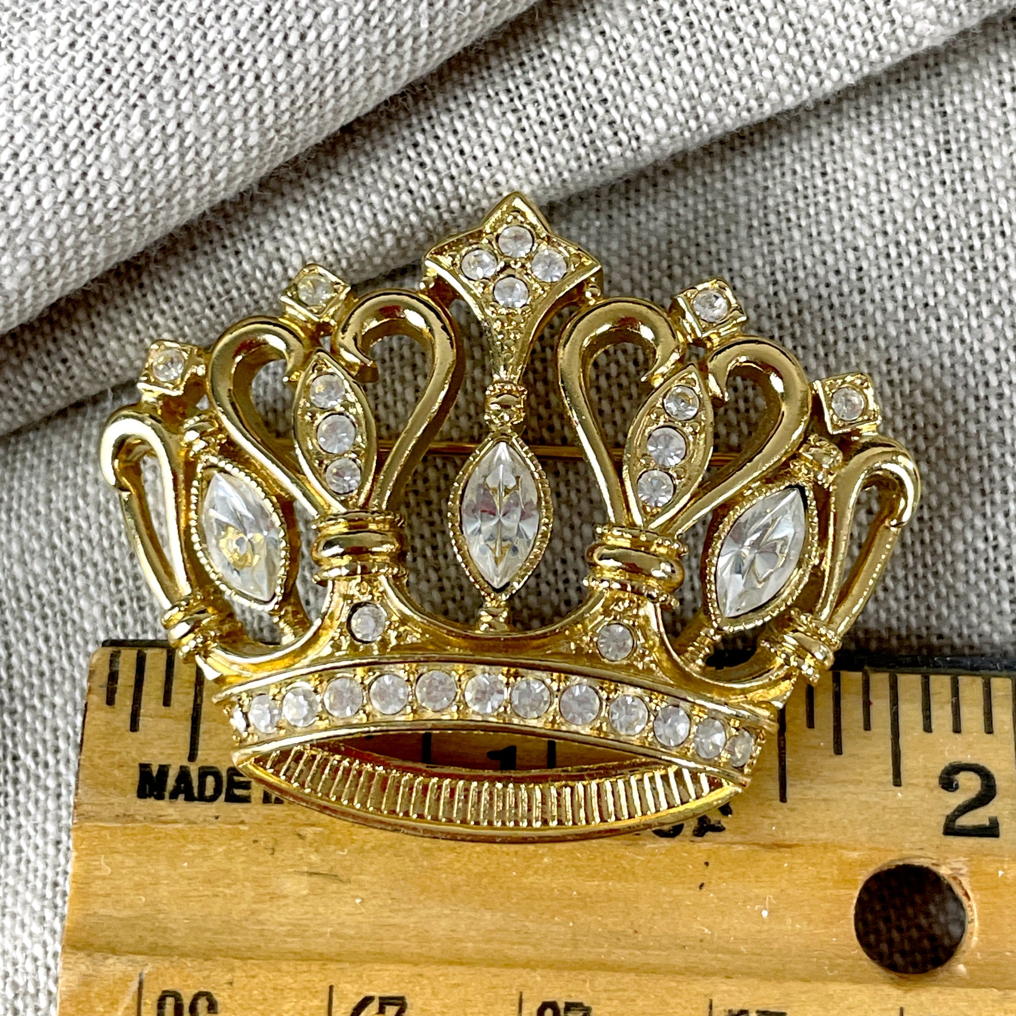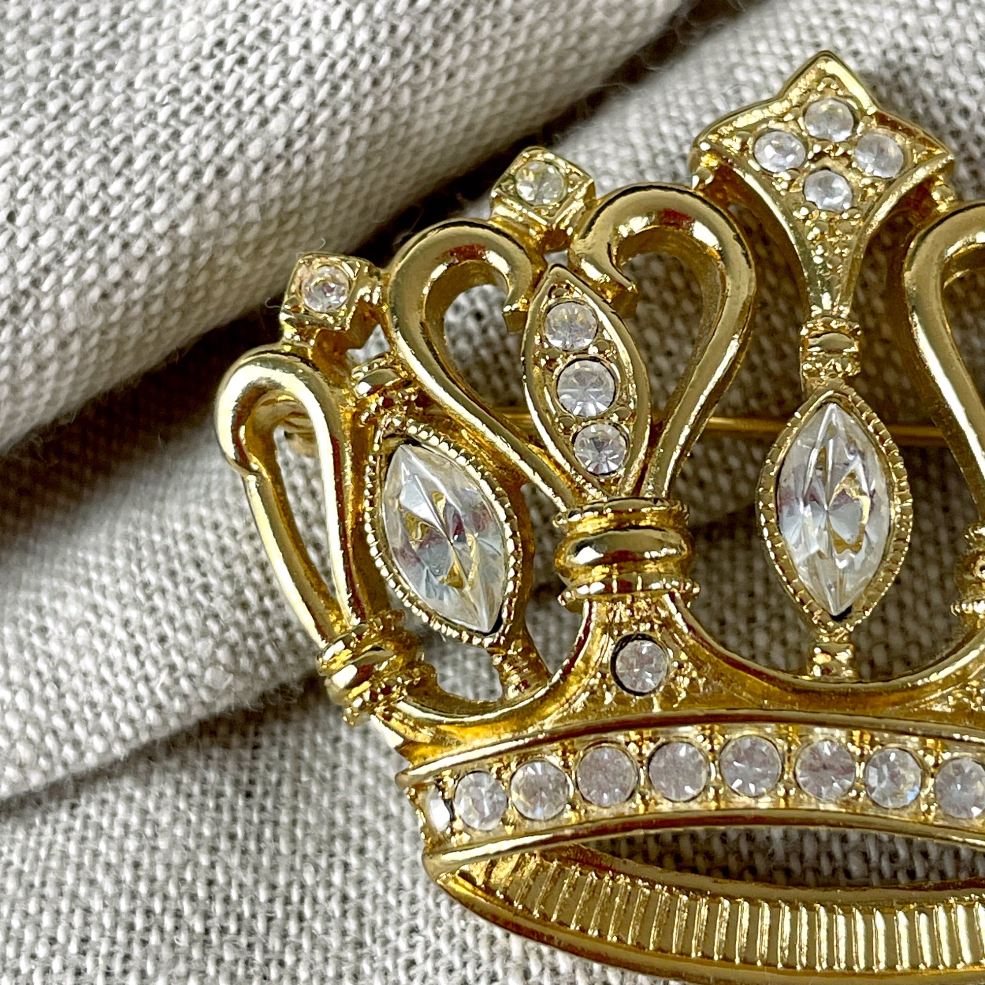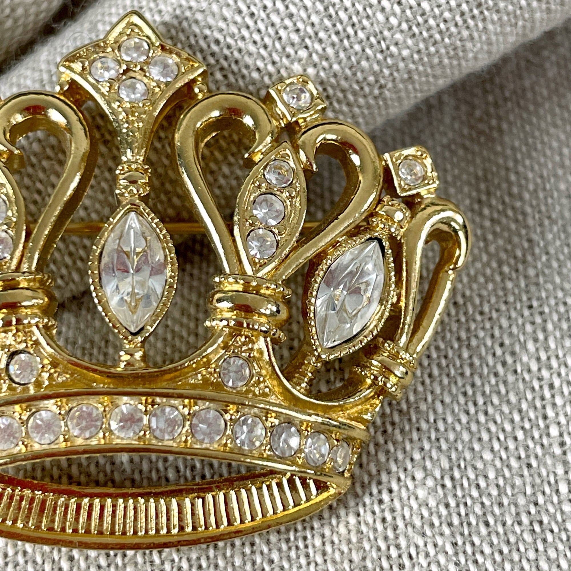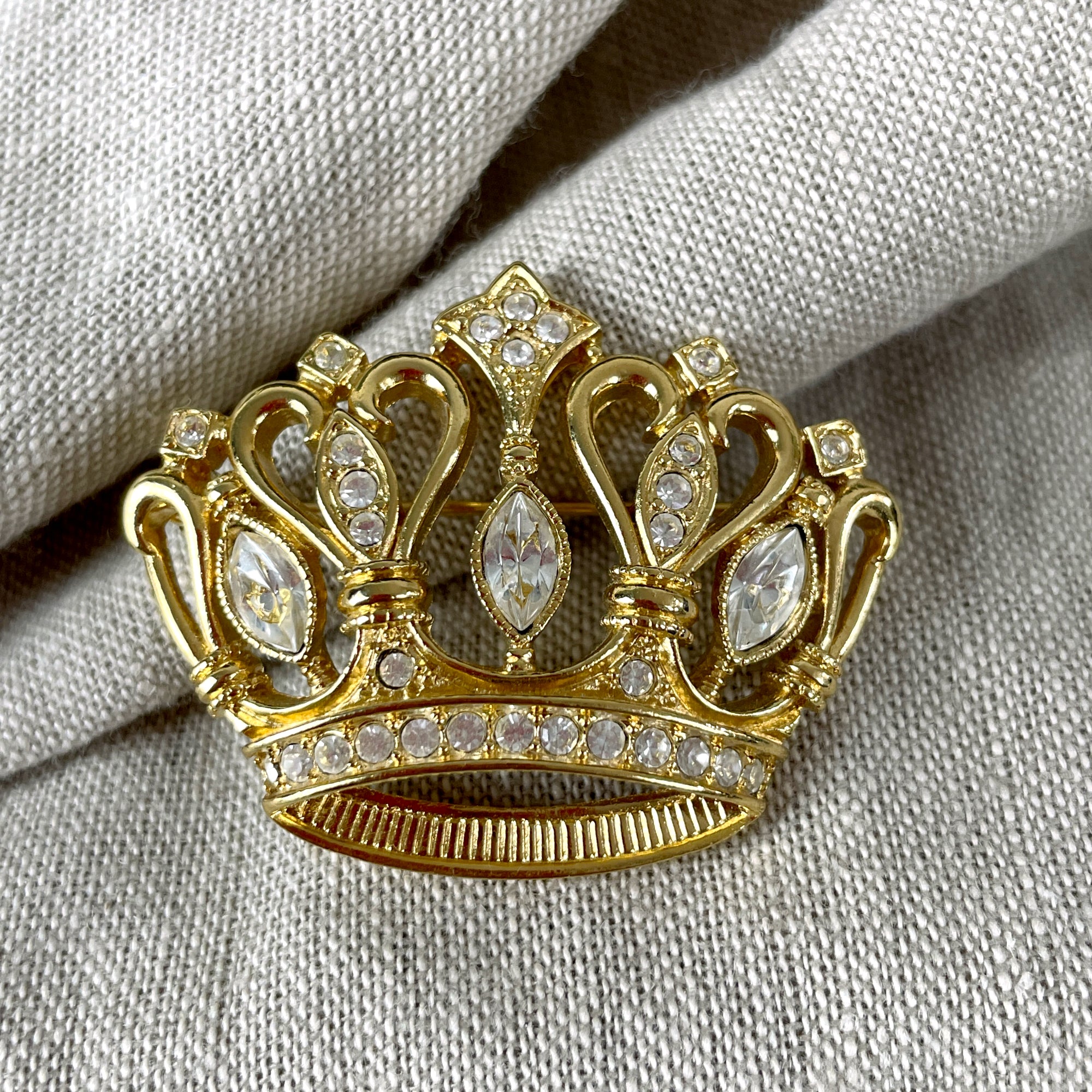 Kenneth Jay Lane goldtone metal crown brooch with clear crystals/rhinestones. Made by Avon in the 1980s.