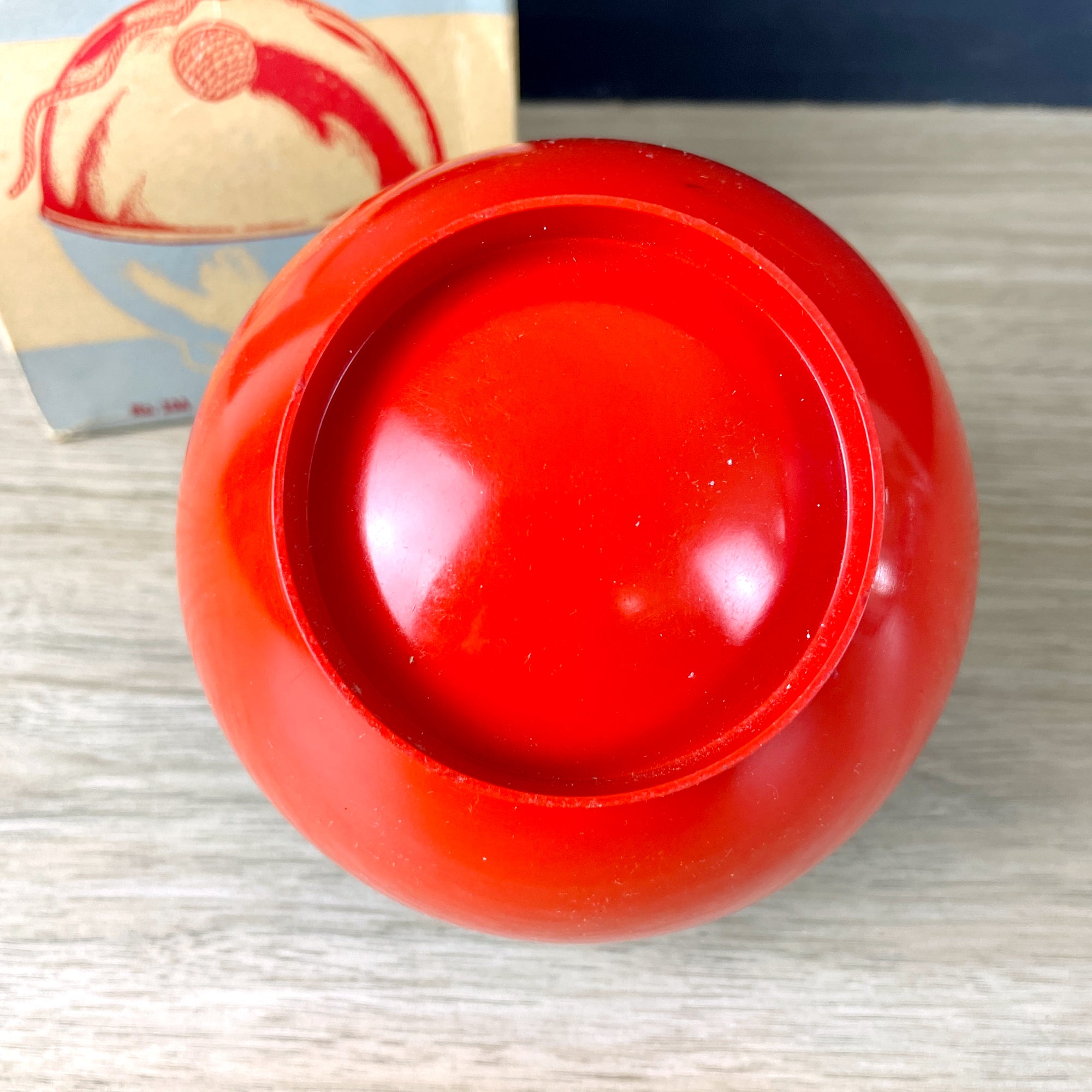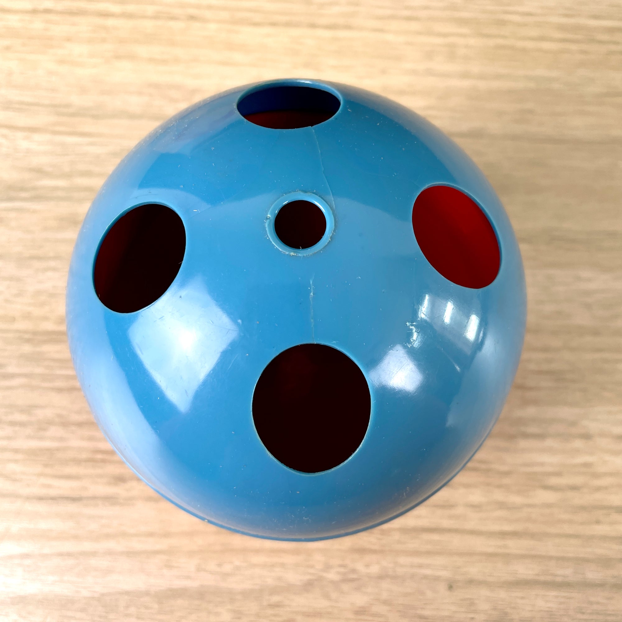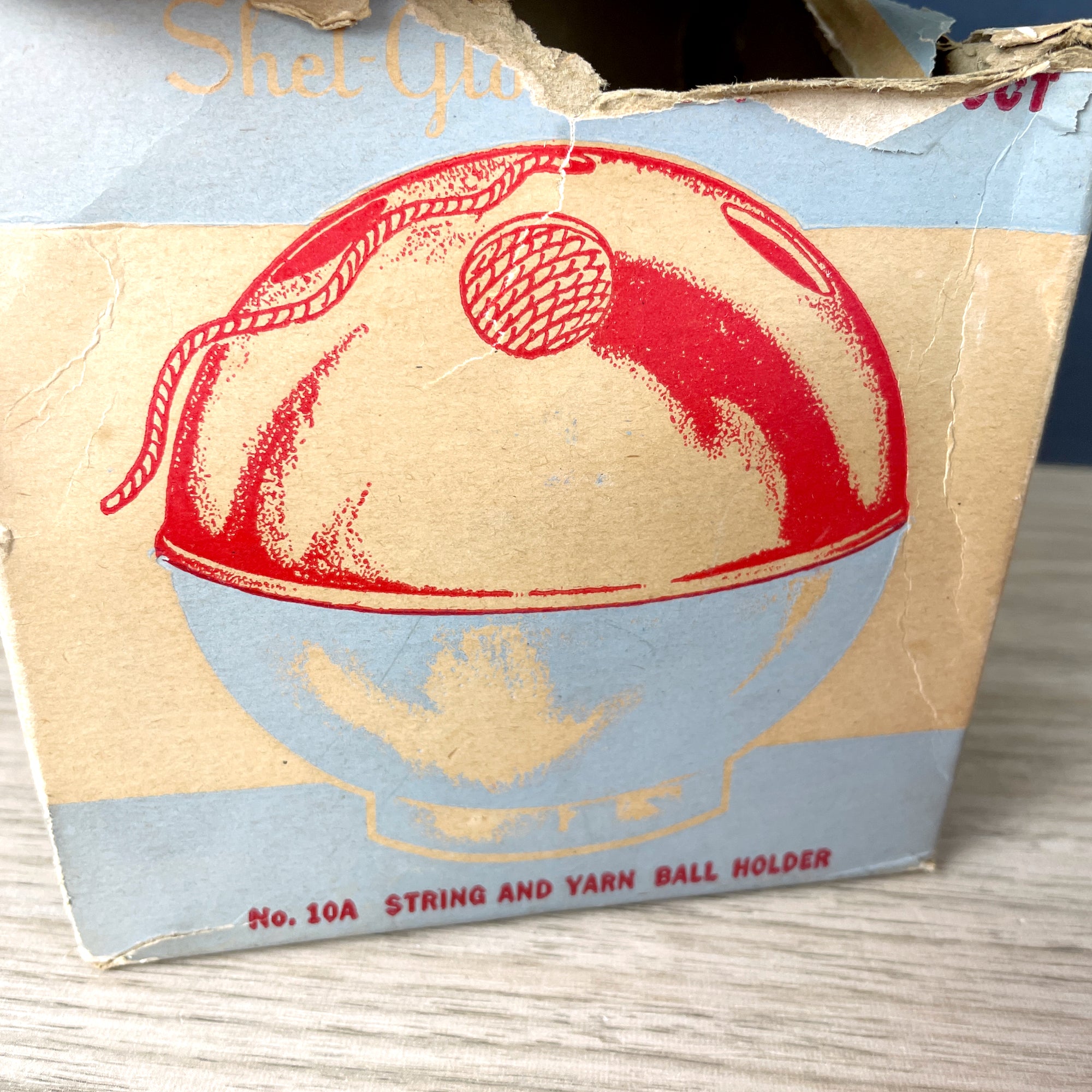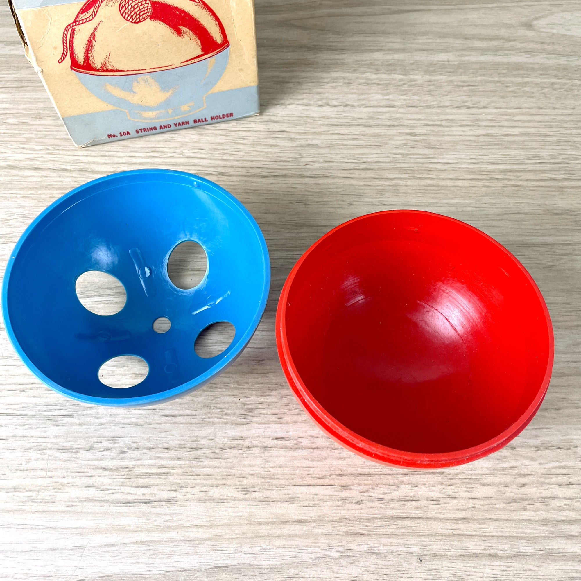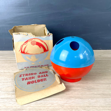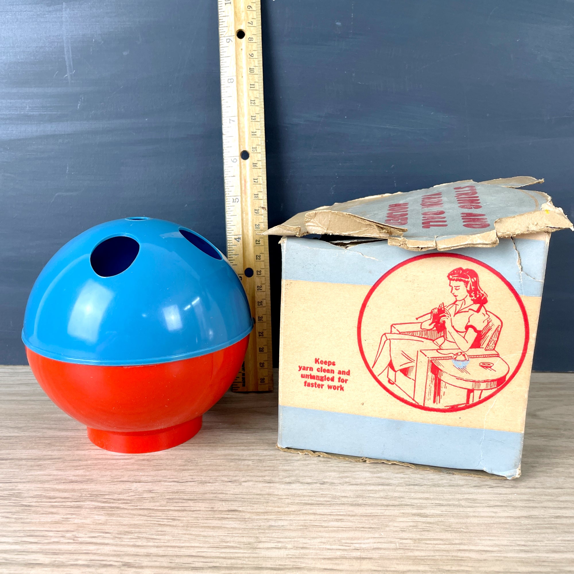 Vintage two part hard plastic ball with holes in the top to keep your string or yarn from getting unruly. Pop the ball inside, thread it to the outside and you have the best mannered fiber you've ever met.