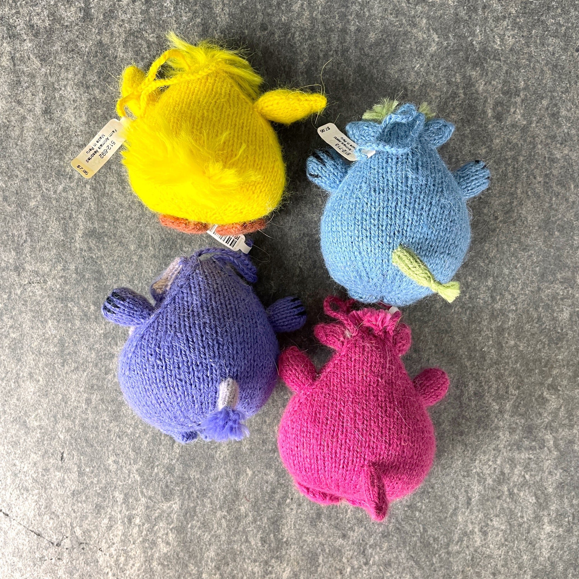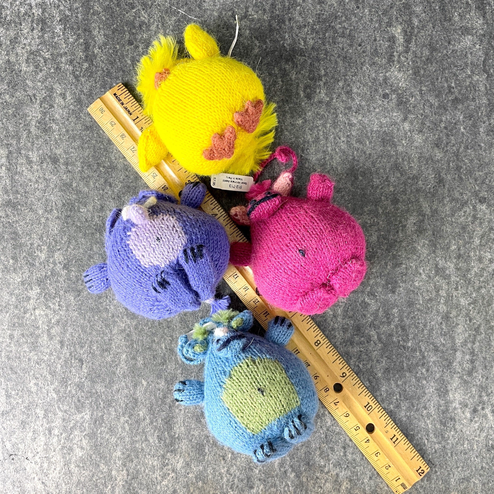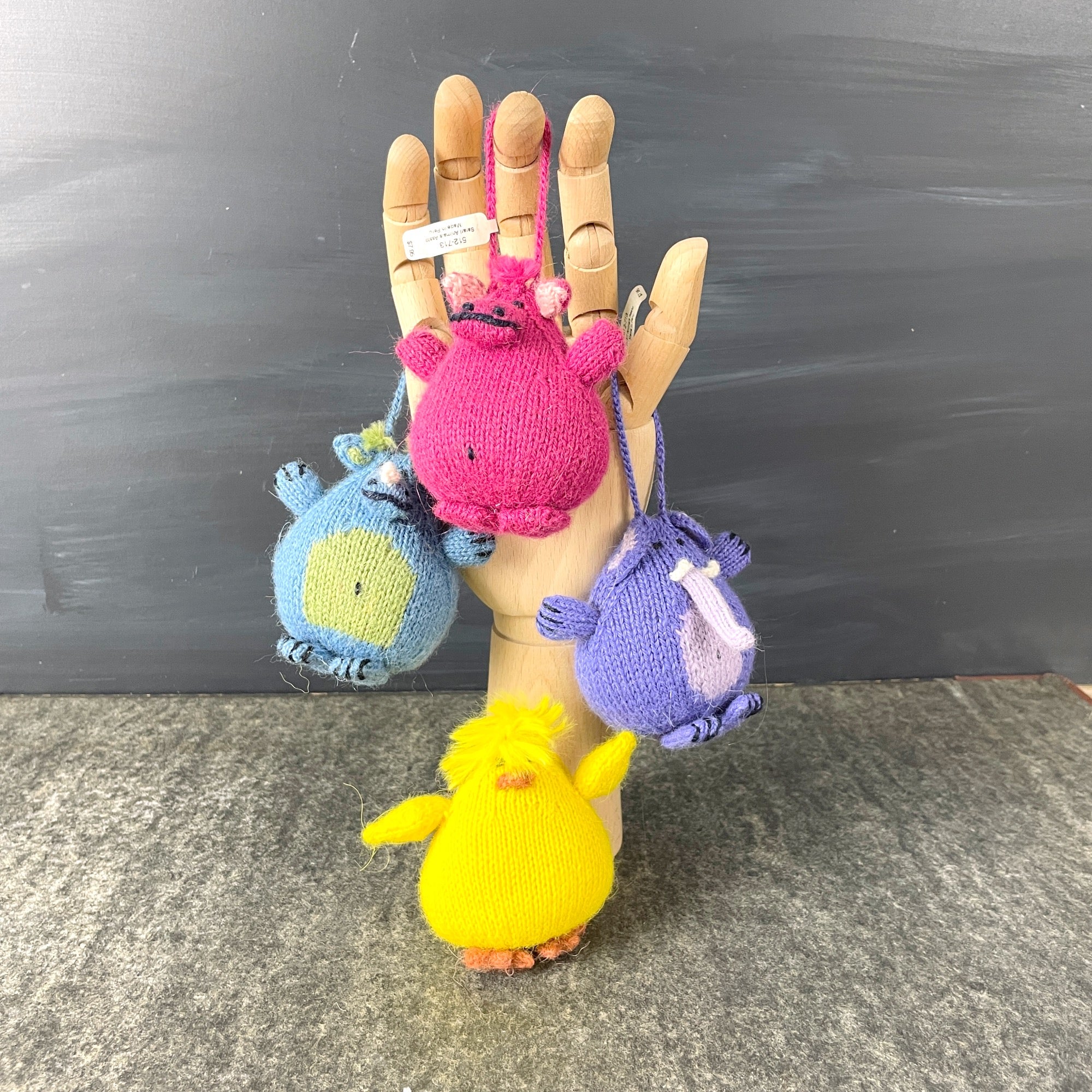 Four jolly knit animal ornaments from Crate and Barrel, new with tags. Three knit safari animals and one farm animal. Made in Peru. Original price $7.95
