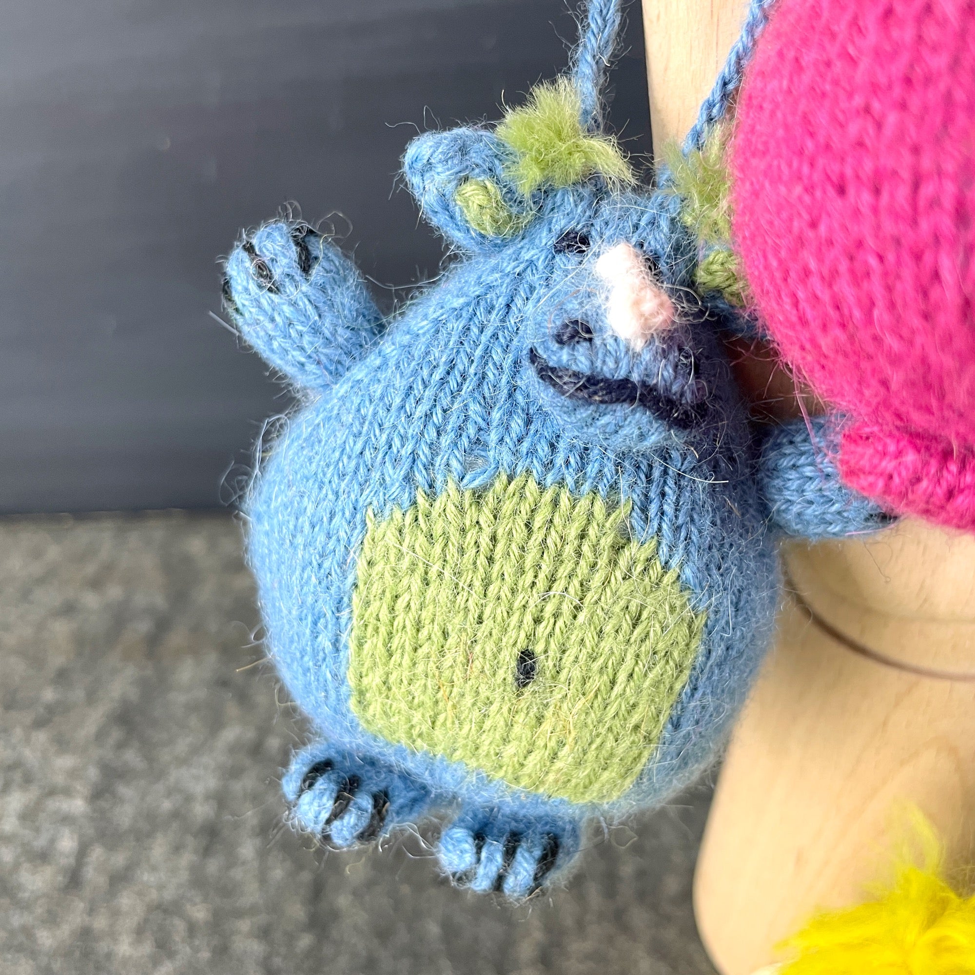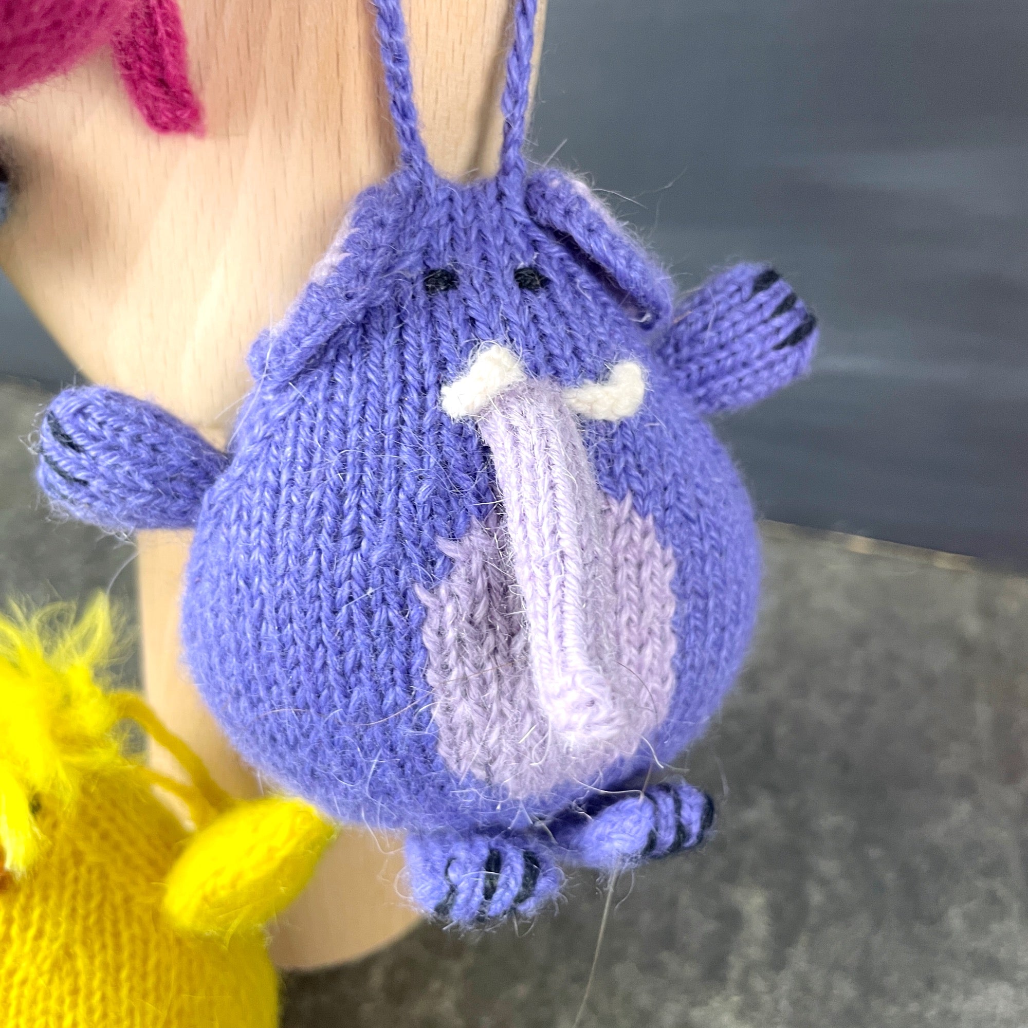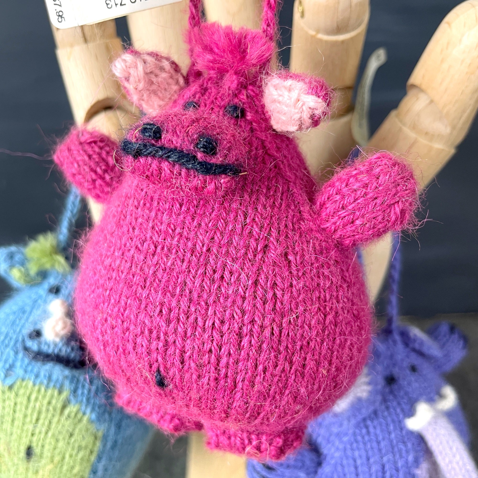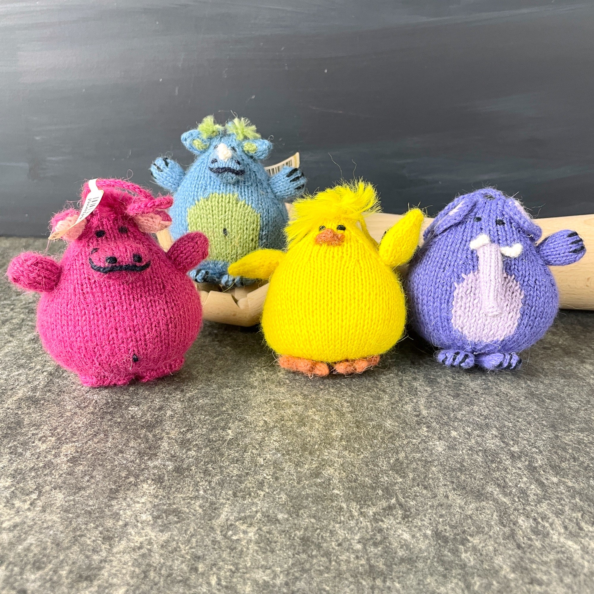 Four jolly knit animal ornaments from Crate and Barrel, new with tags. Three knit safari animals and one farm animal. Made in Peru. Original price $7.95