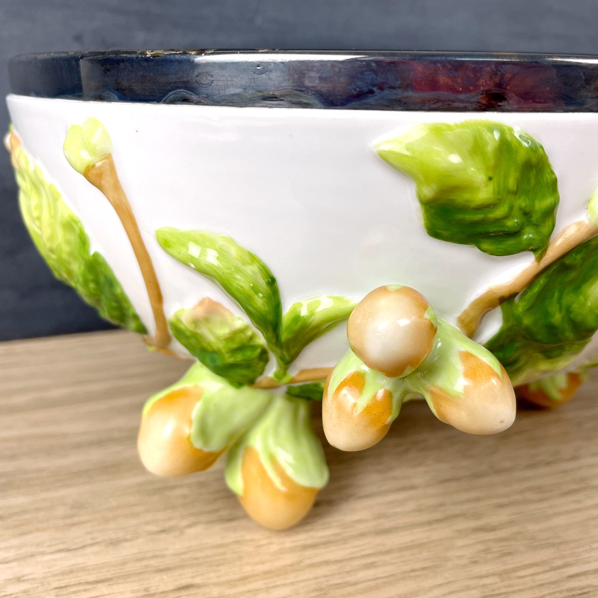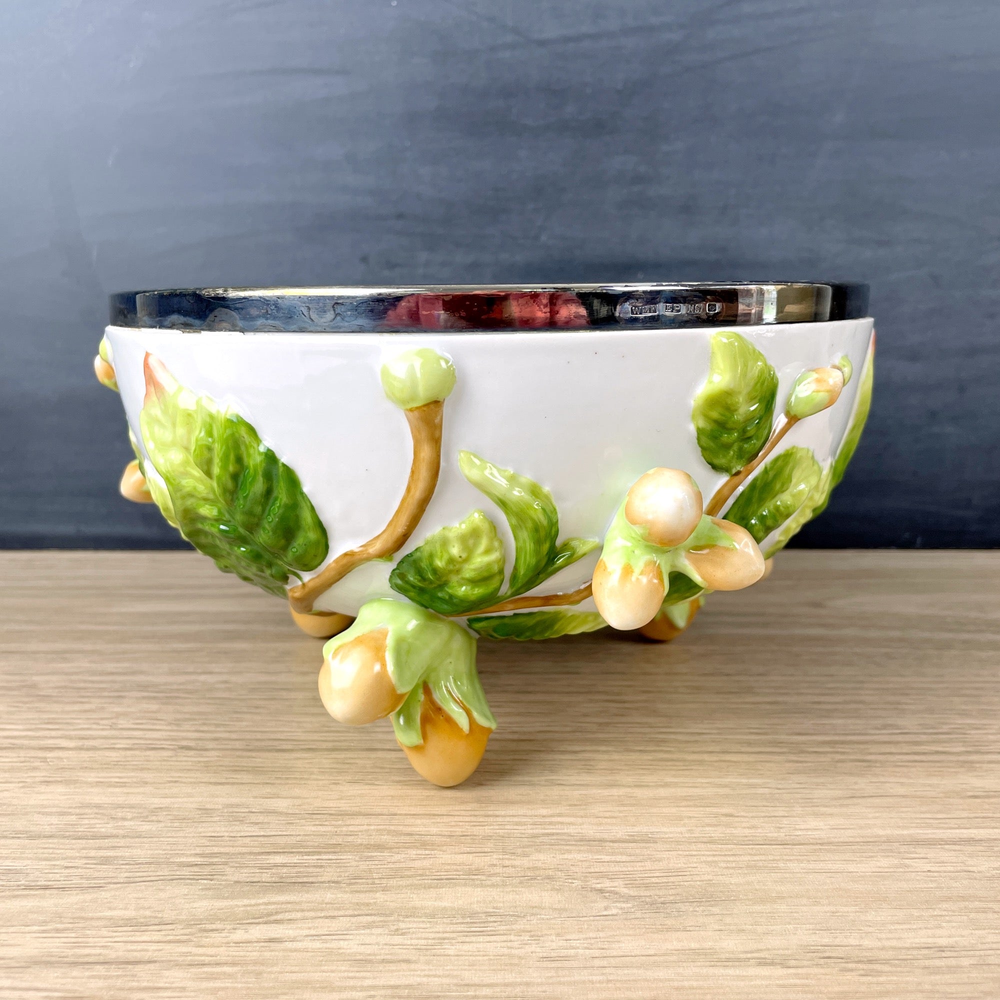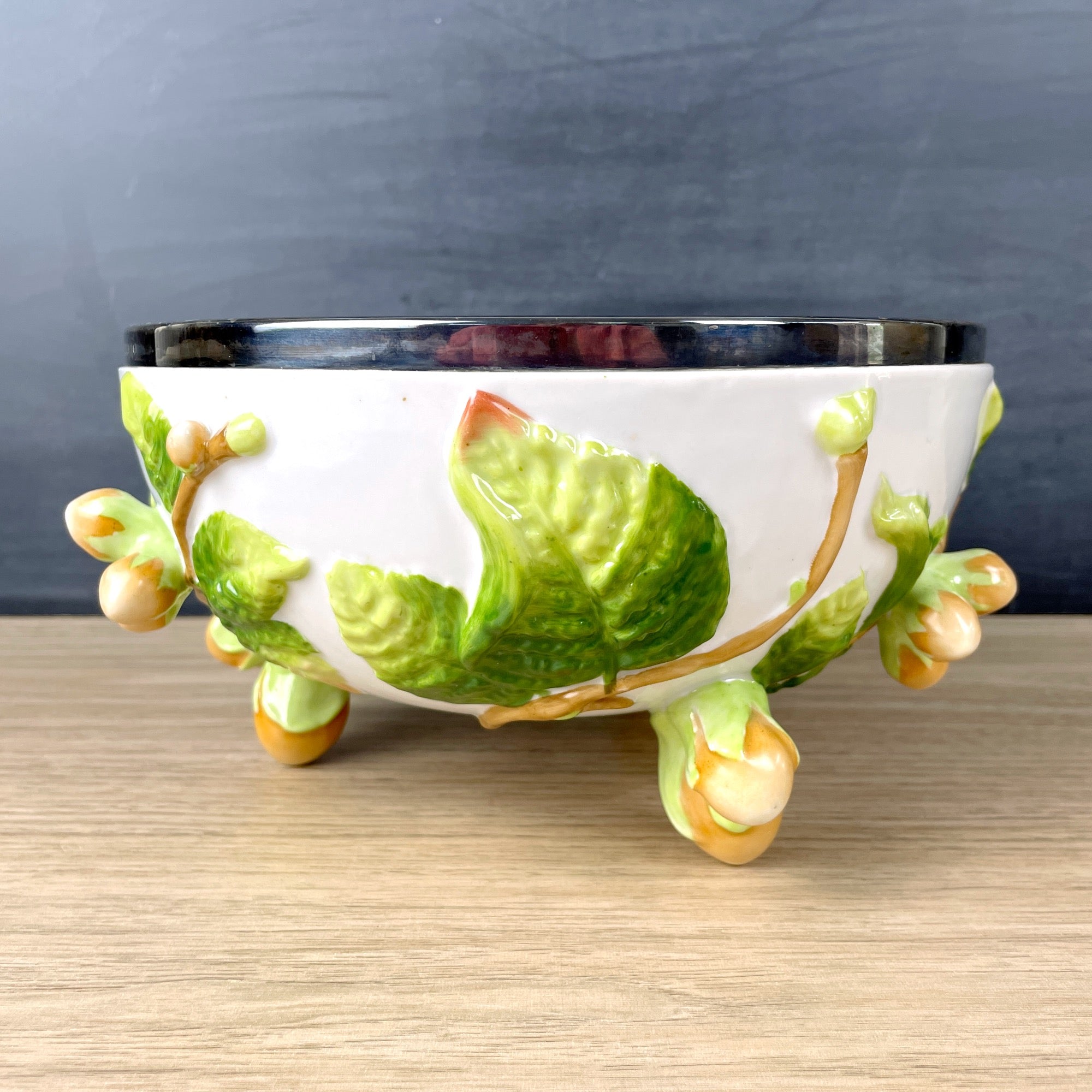 A German pottery majolica-style salad bowl by German makers Musterschutz from the 1920s or 1930s. The body is decorated with green leaves with orange raised kumquats. Feet are also juicy kumquats. Metal rim on top is marked WMF EPNS .