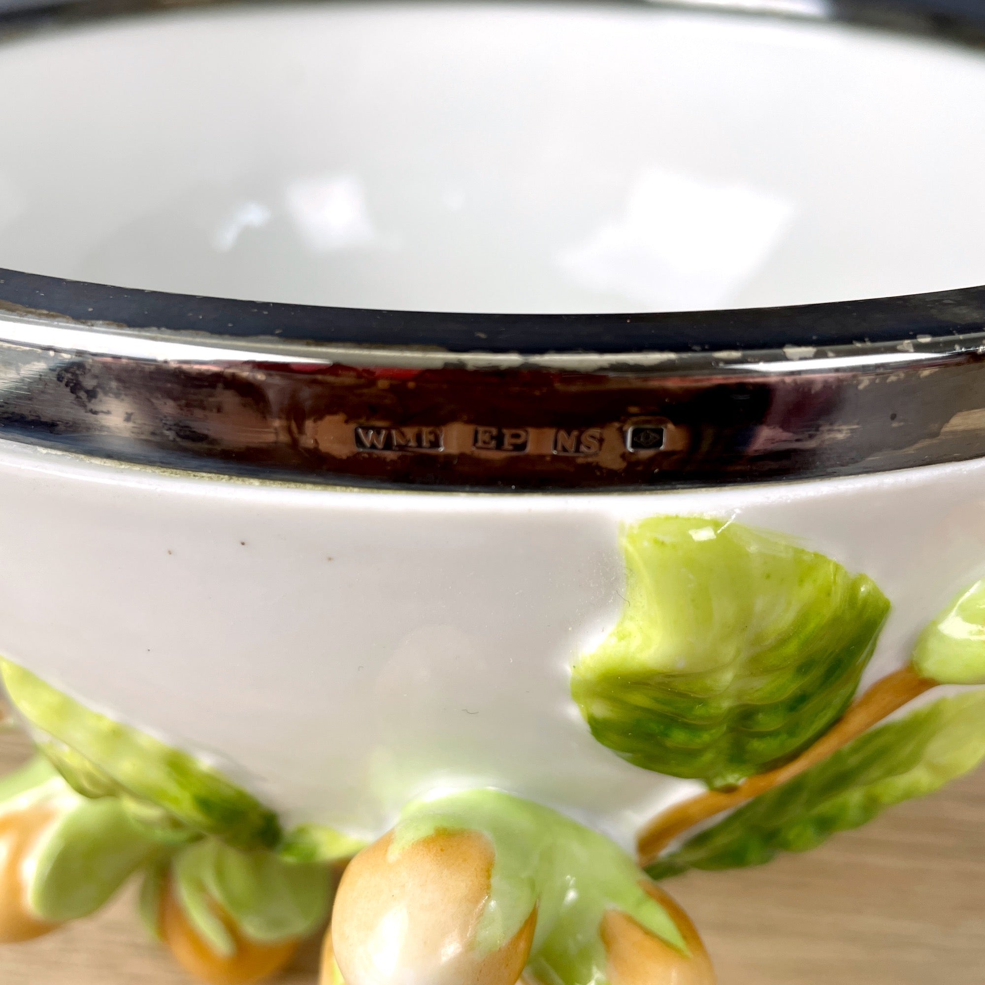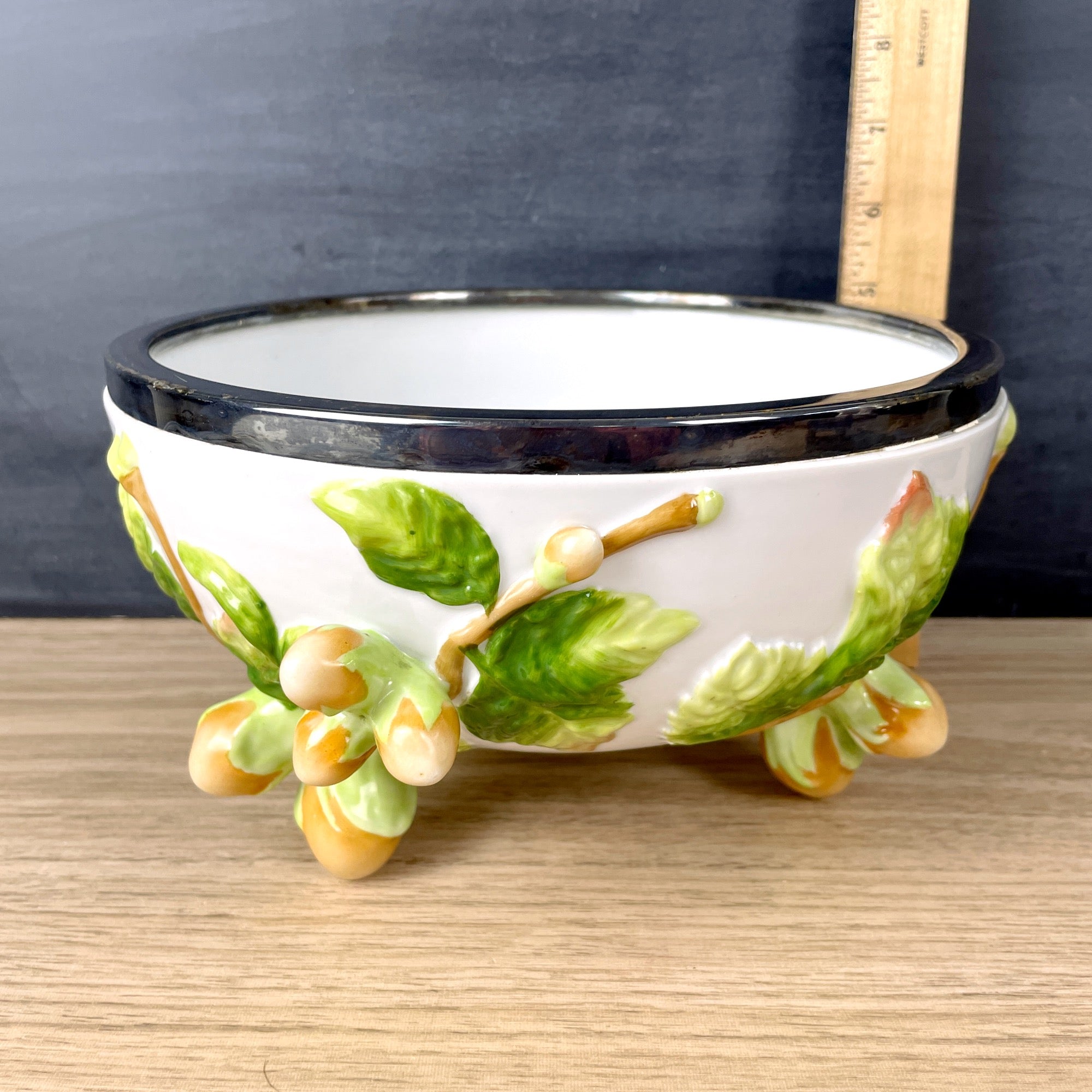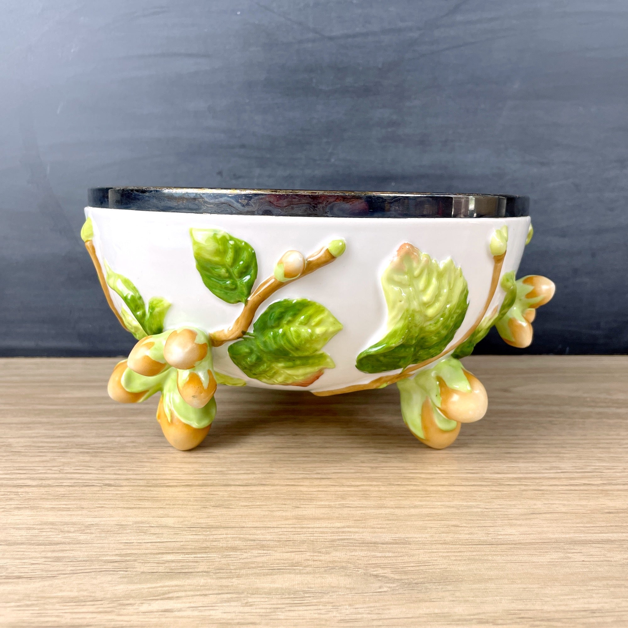 A German pottery majolica-style salad bowl by German makers Musterschutz from the 1920s or 1930s. The body is decorated with green leaves with orange raised kumquats. Feet are also juicy kumquats. Metal rim on top is marked WMF EPNS .