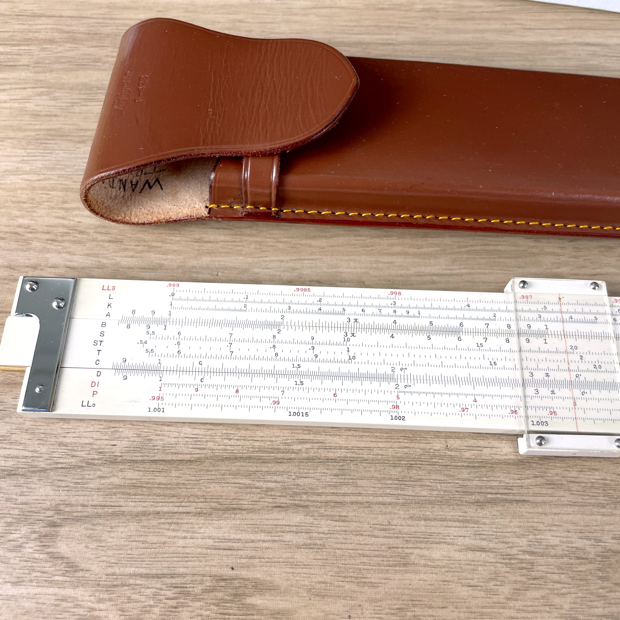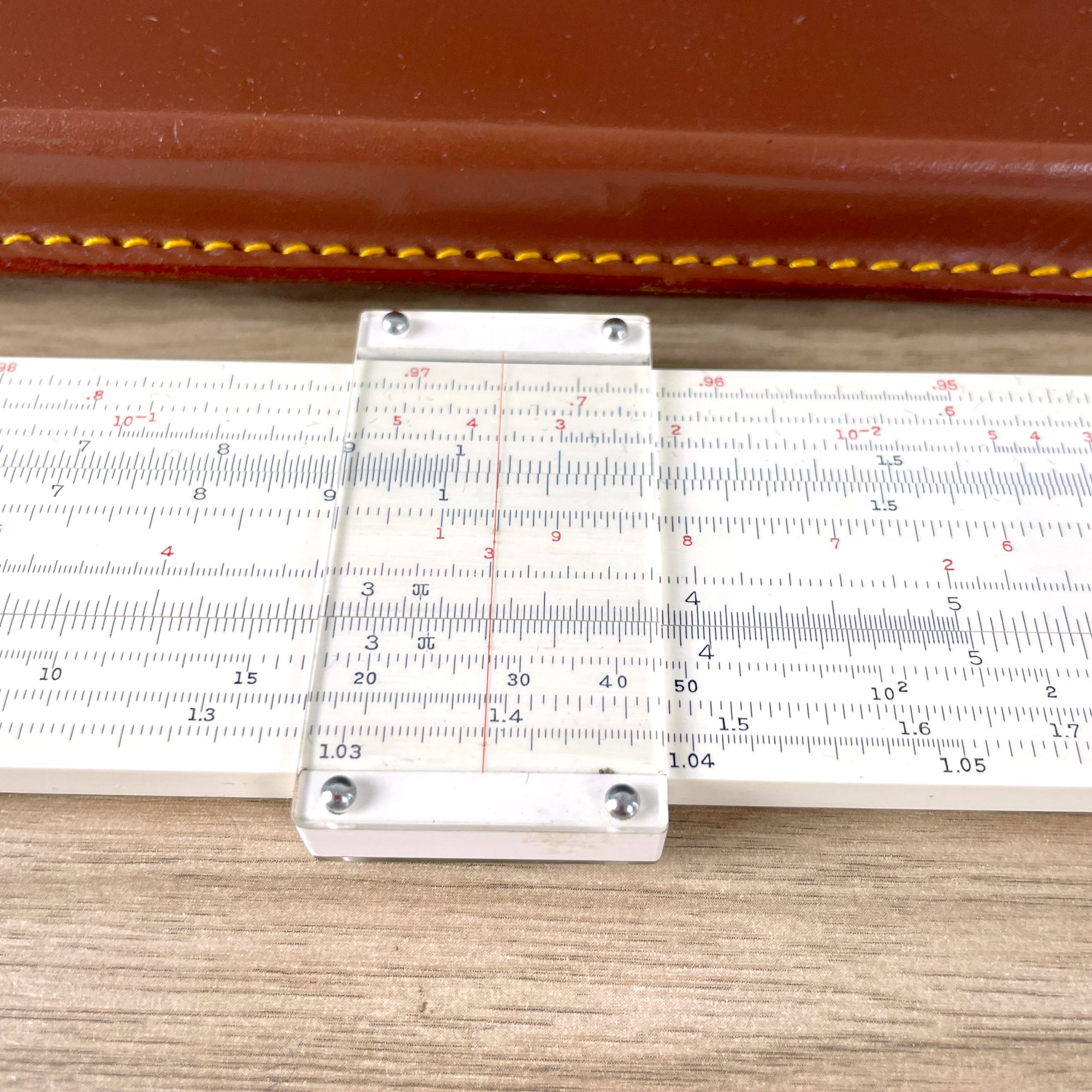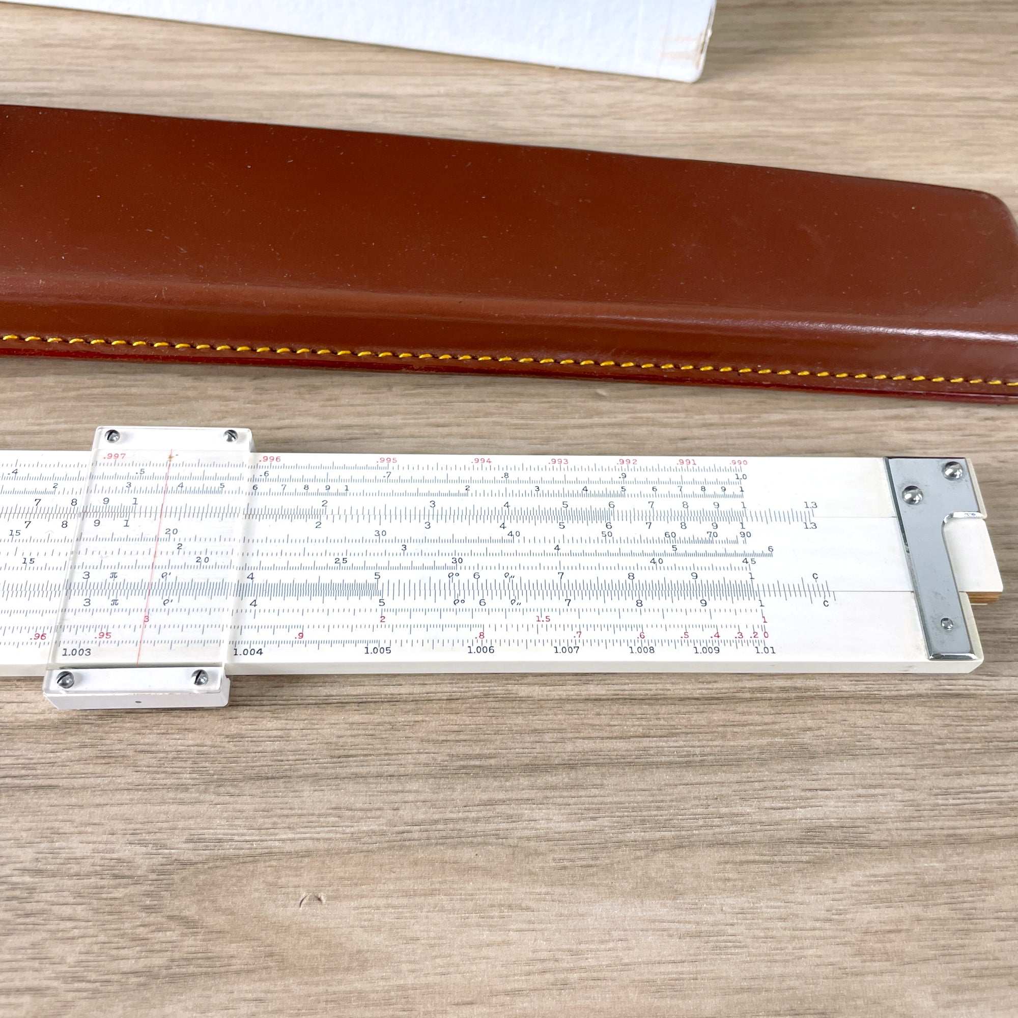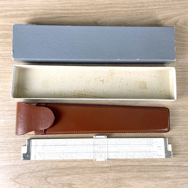 CONDITION Slide rule is in very good condition. Leather case has creasing at the fold and some wear marks. There is writing inside from the previous owner. The cardboard box has discoloration inside and the edges have some wear and tear, one corner has been repaired, but all the remaining seams and corners are intact.