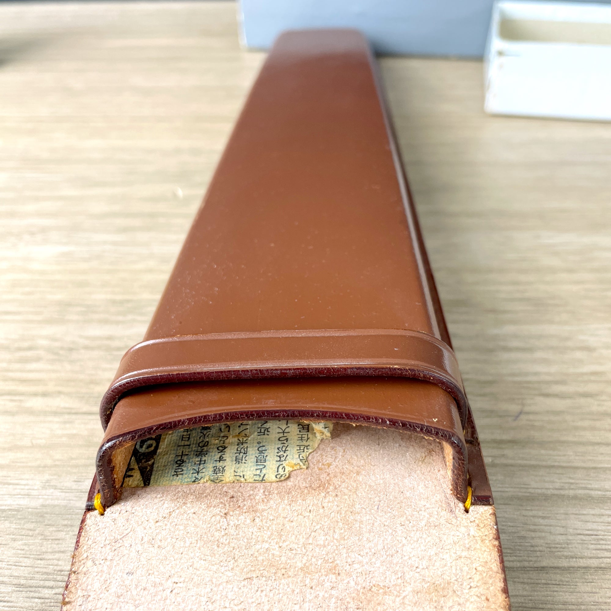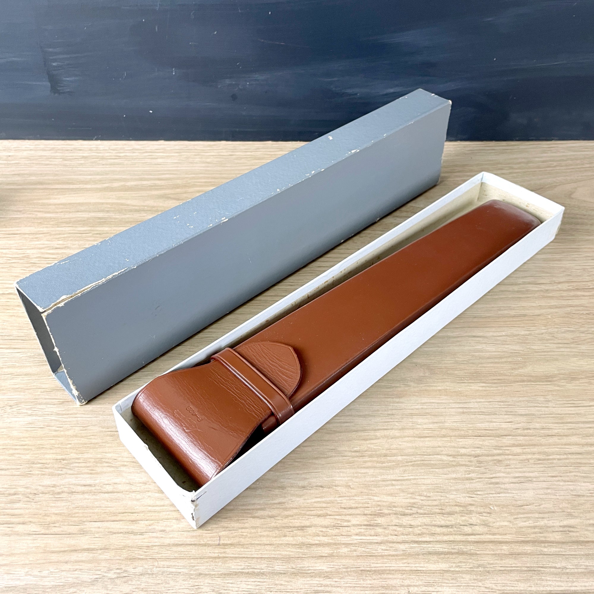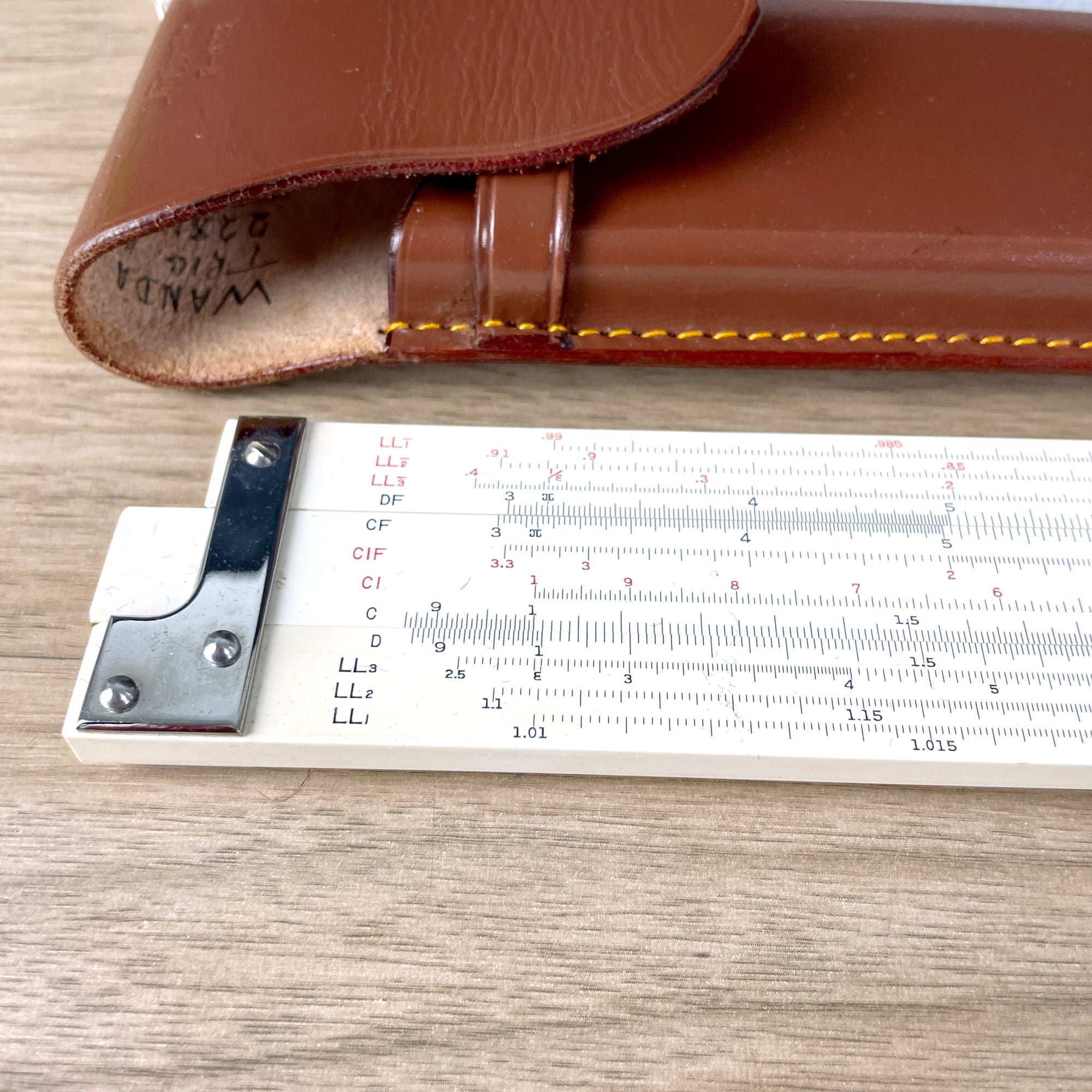 CONDITION Slide rule is in very good condition. Leather case has creasing at the fold and some wear marks. There is writing inside from the previous owner. The cardboard box has discoloration inside and the edges have some wear and tear, one corner has been repaired, but all the remaining seams and corners are intact.