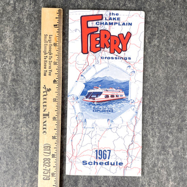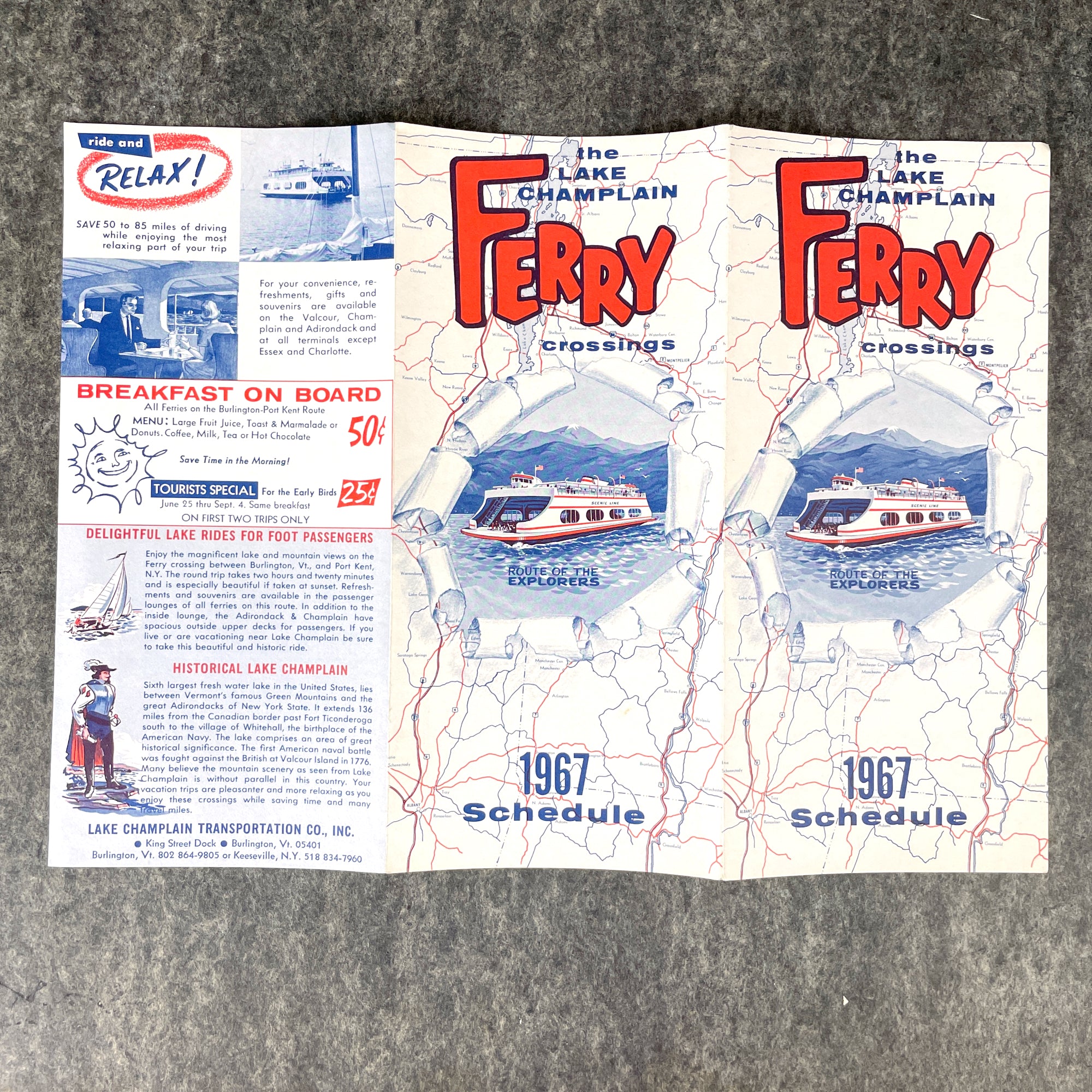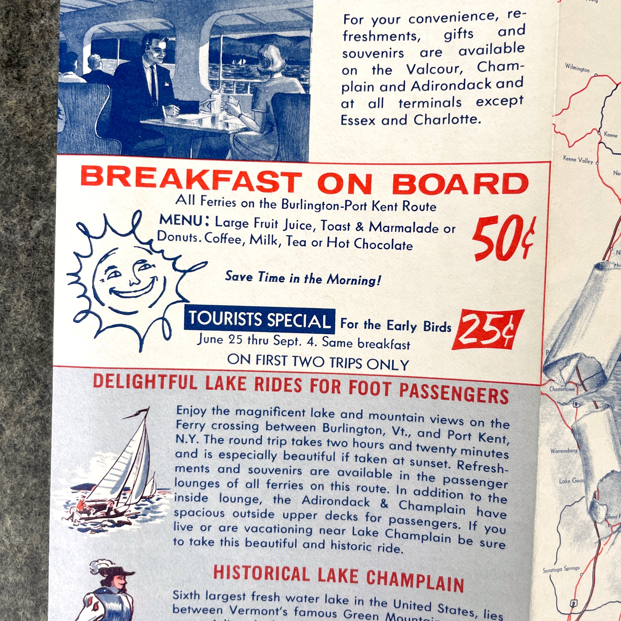 Vintage 1967 trifold brochure with the Lake Champlain Ferry crossings schedule. Two colors, blue and red, on off white paper. Don't miss that 50¢ breakfast! Yum!