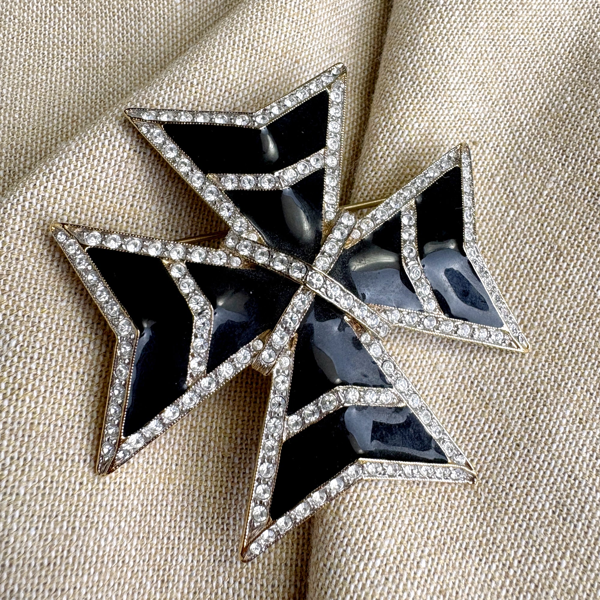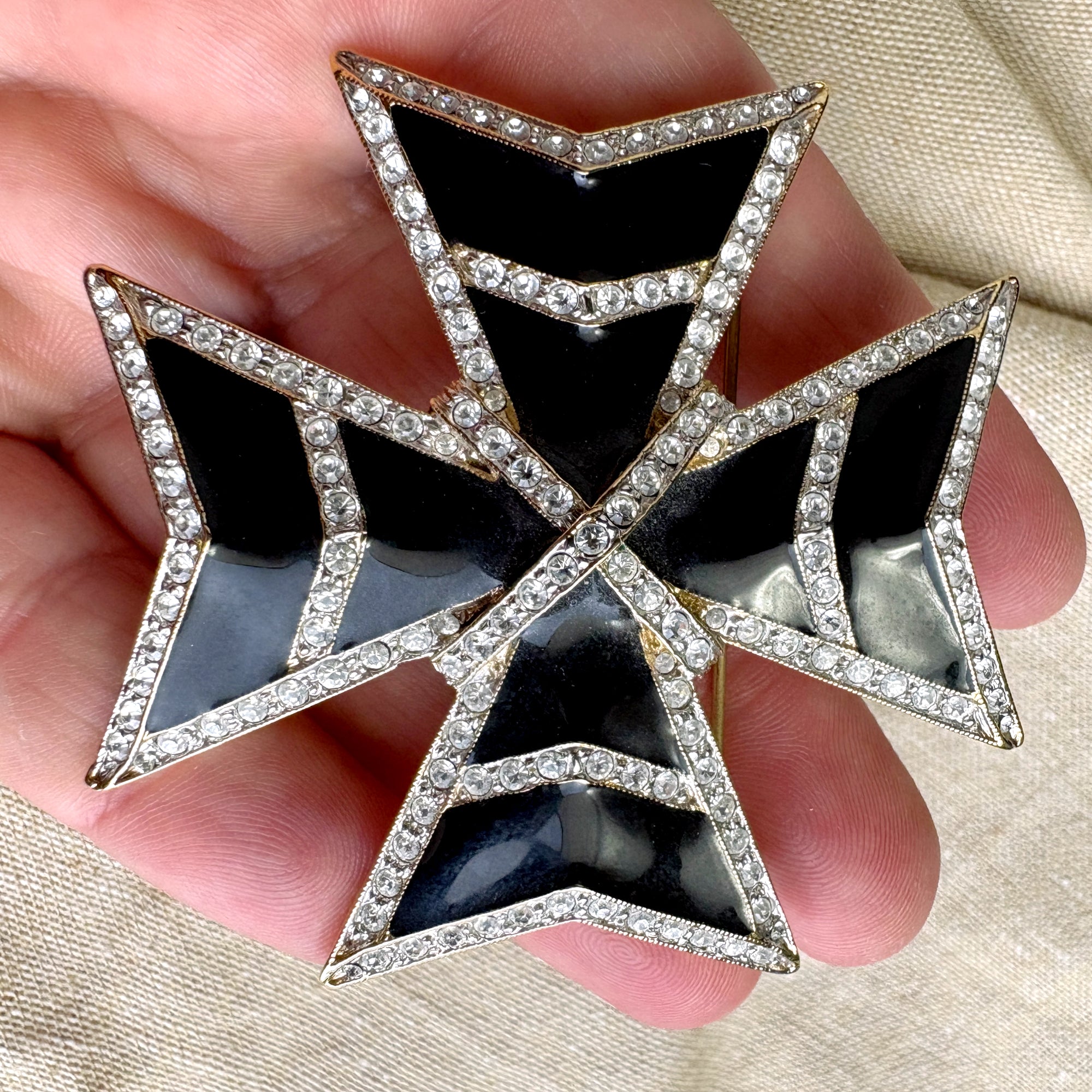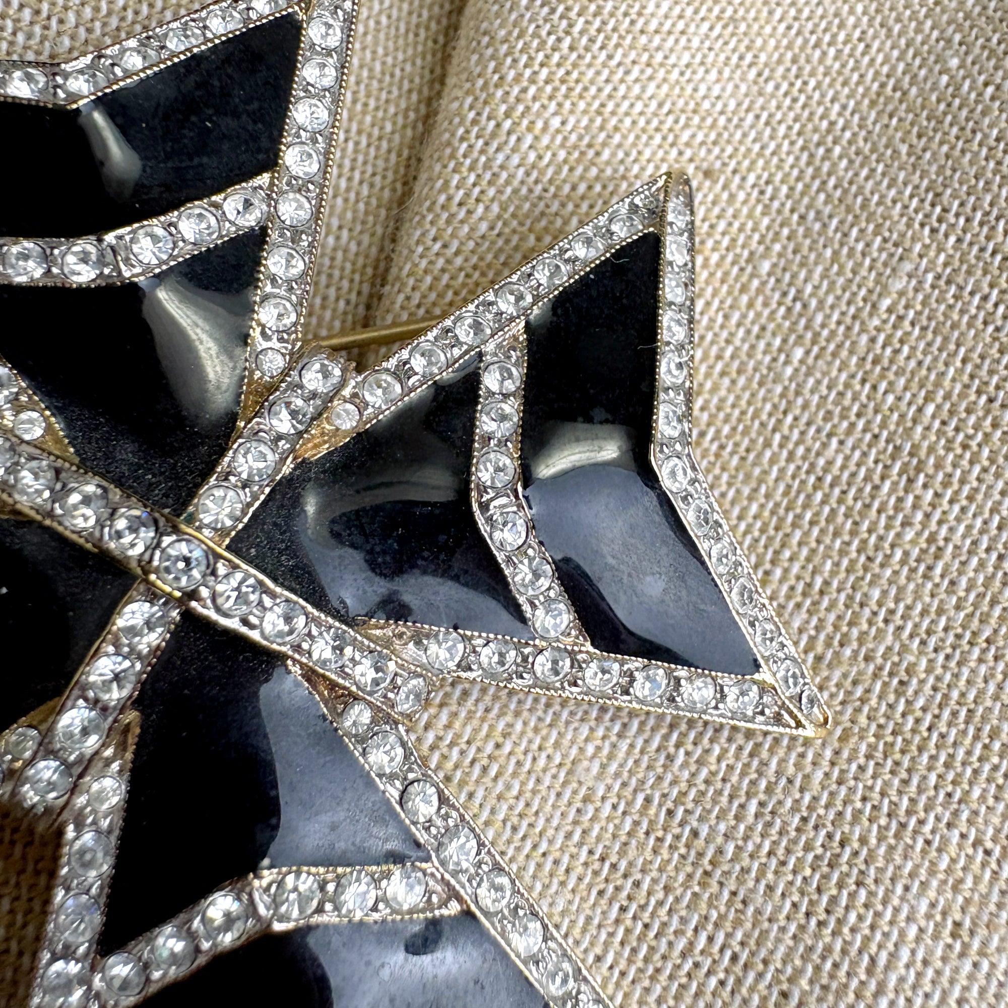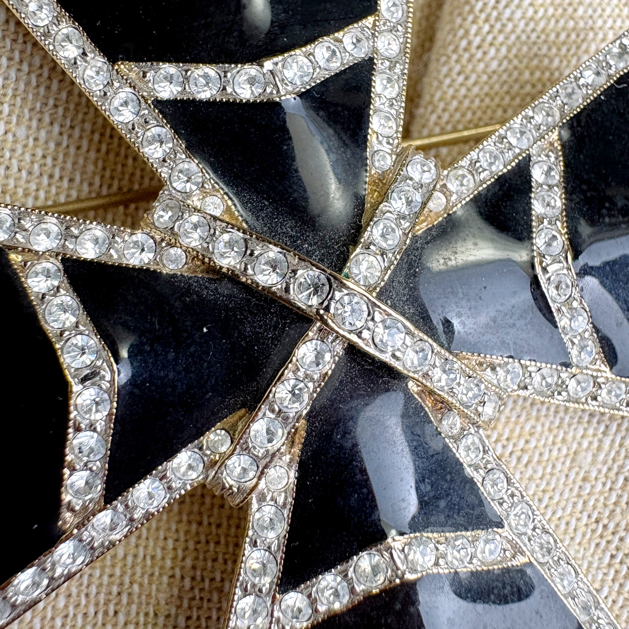 Landau crystal and black enamel / resin Maltese Cross brooch