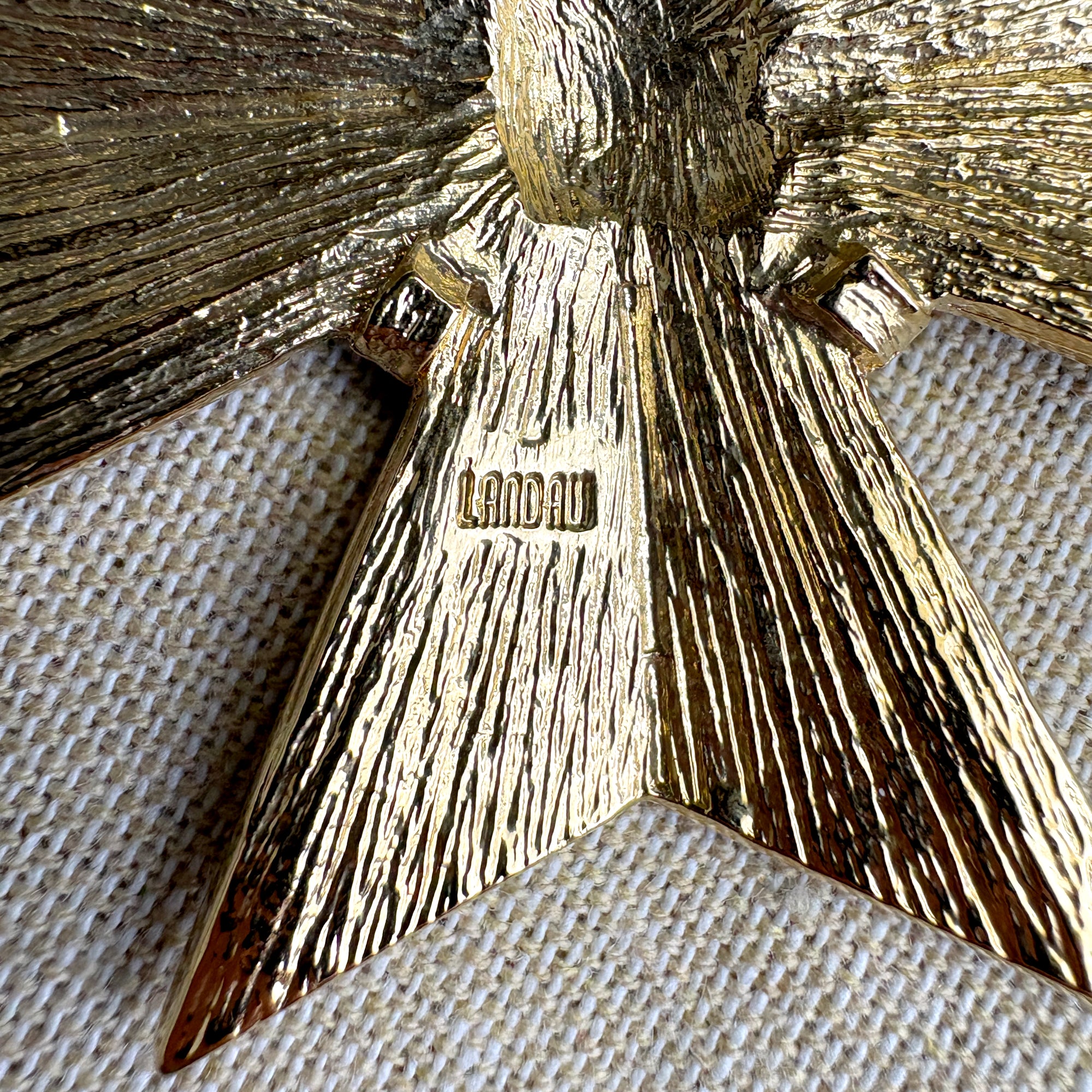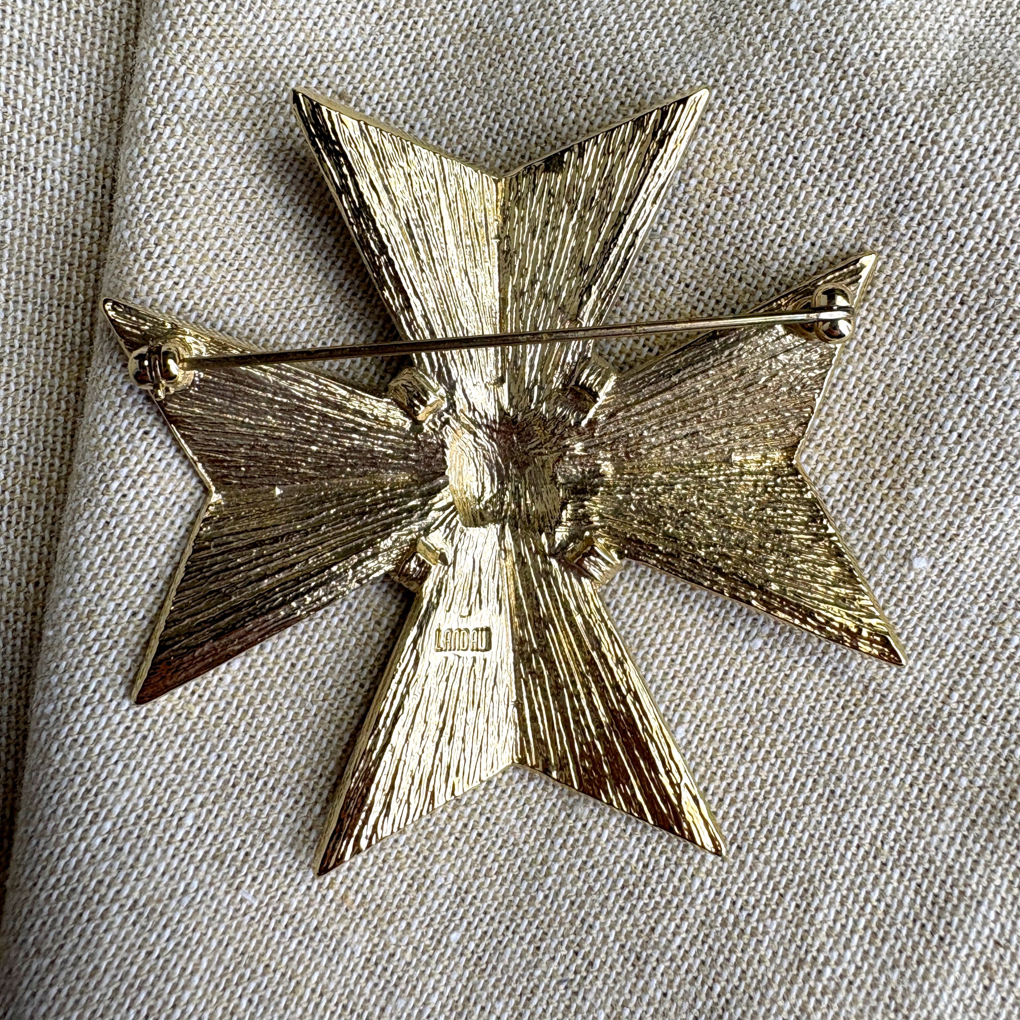 Elegant large Maltese Cross brooch by Landau.  Black enamel or resin accented with small crystals between tiny beaded gold edging on a goldtone back.  Marked LANDAU.