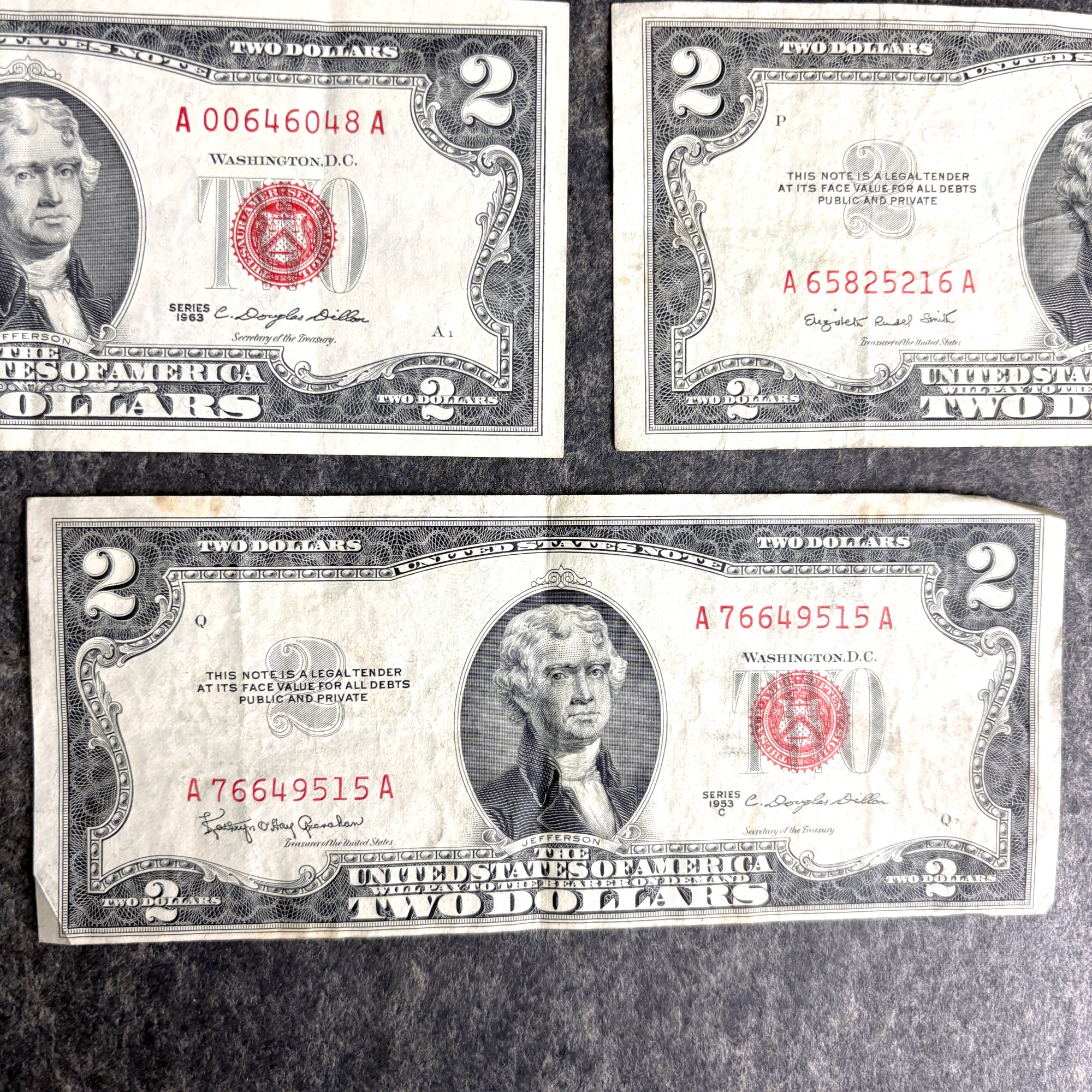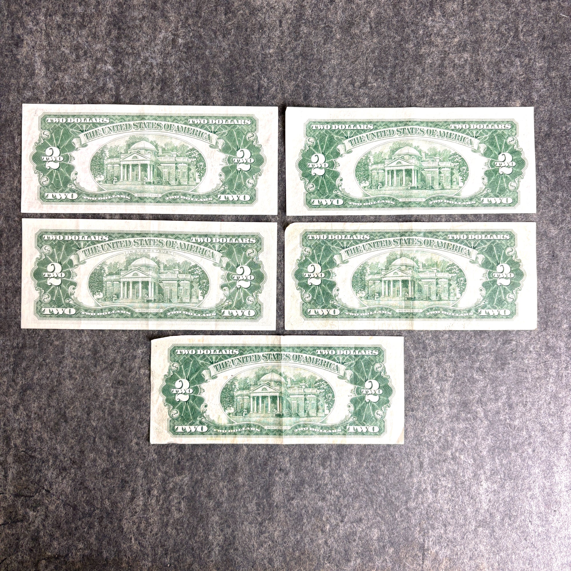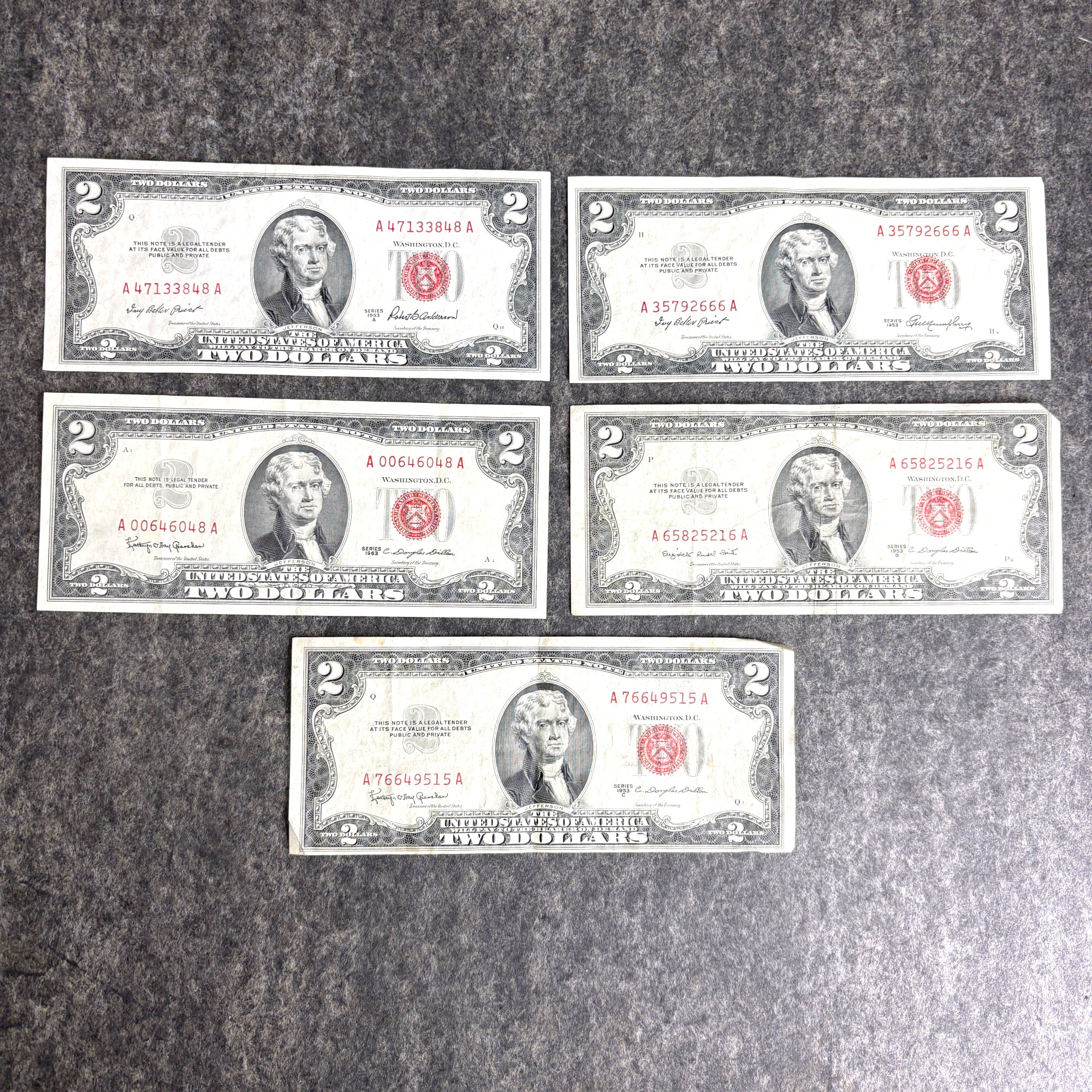 5 Vintage Red Seal $2 Bills – 1953 to 1963 Series – U.S. Note Circulated Legal Tender