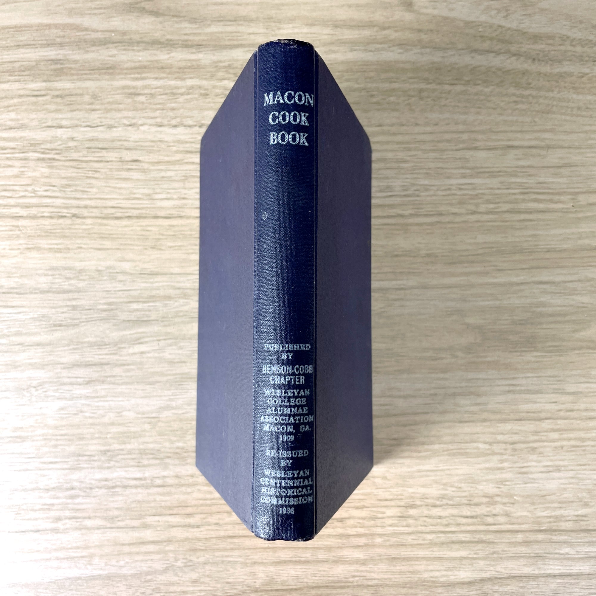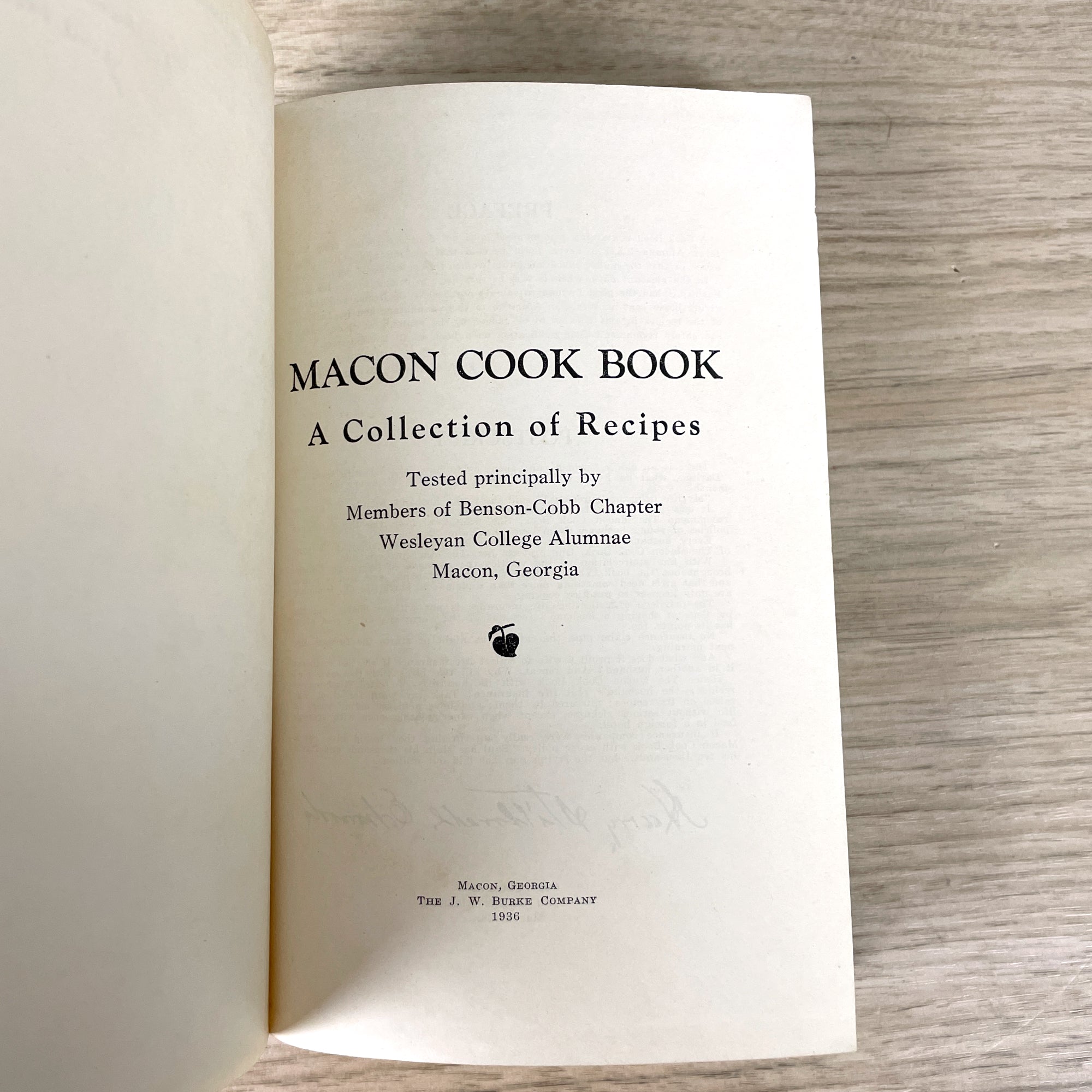 "Macon Cook Book: A Collection of Recipes" tested principally by Members of the Benson-Cobb Chapter, Wesleyan College Alumnae, Macon, GA. 1936. Contains "500 good old Southern recipes." Hardcover. Originally published in 1909. Also has a section on housekeeping.