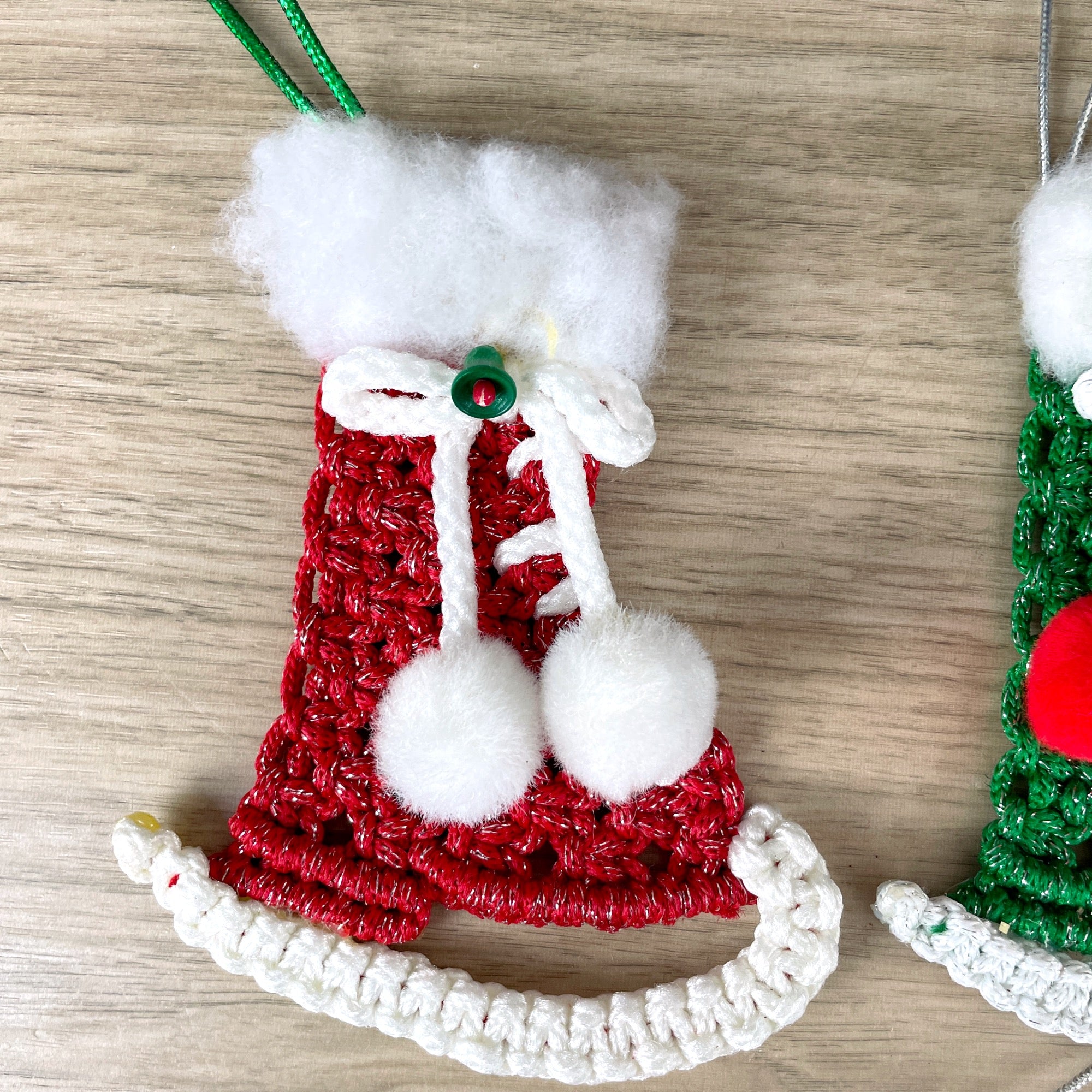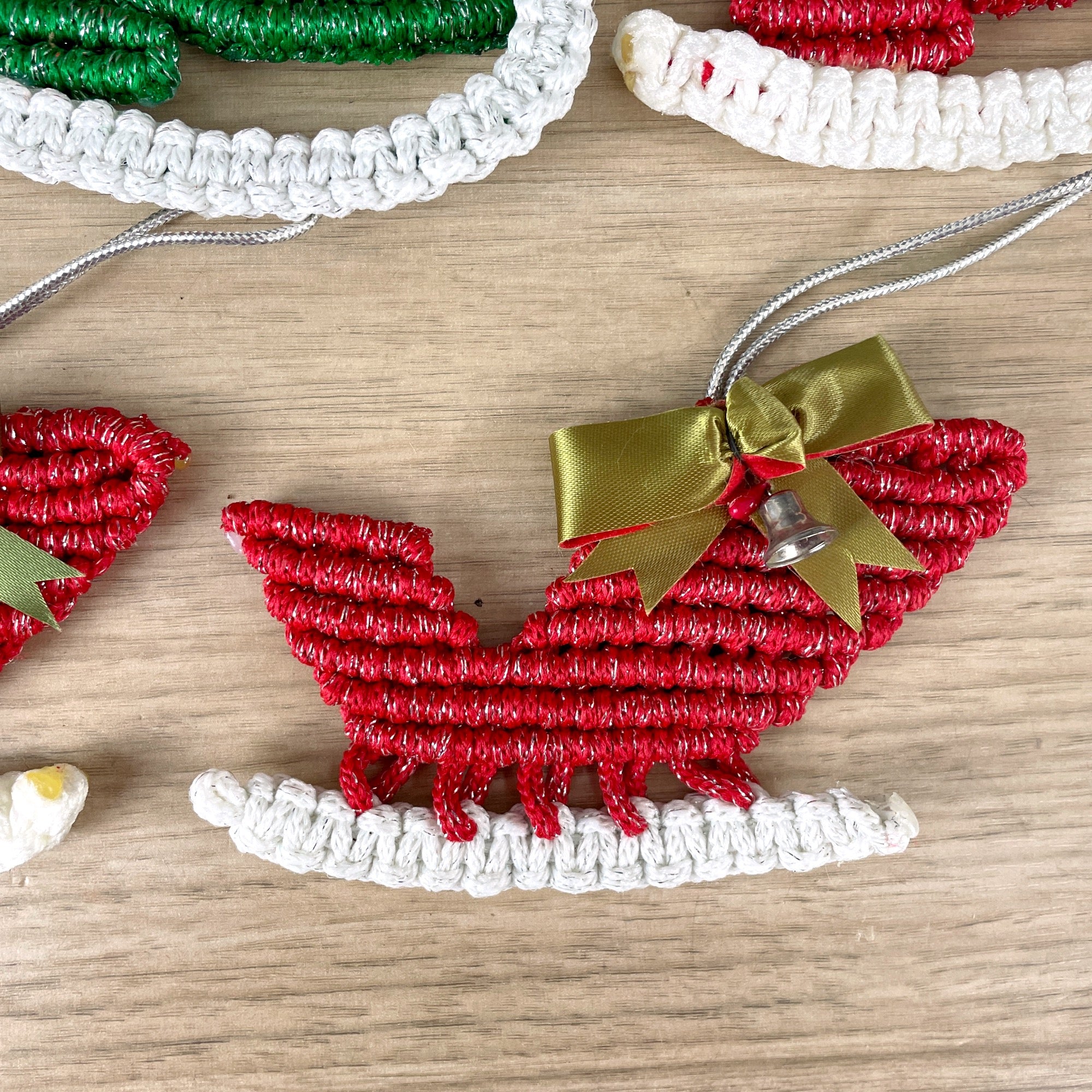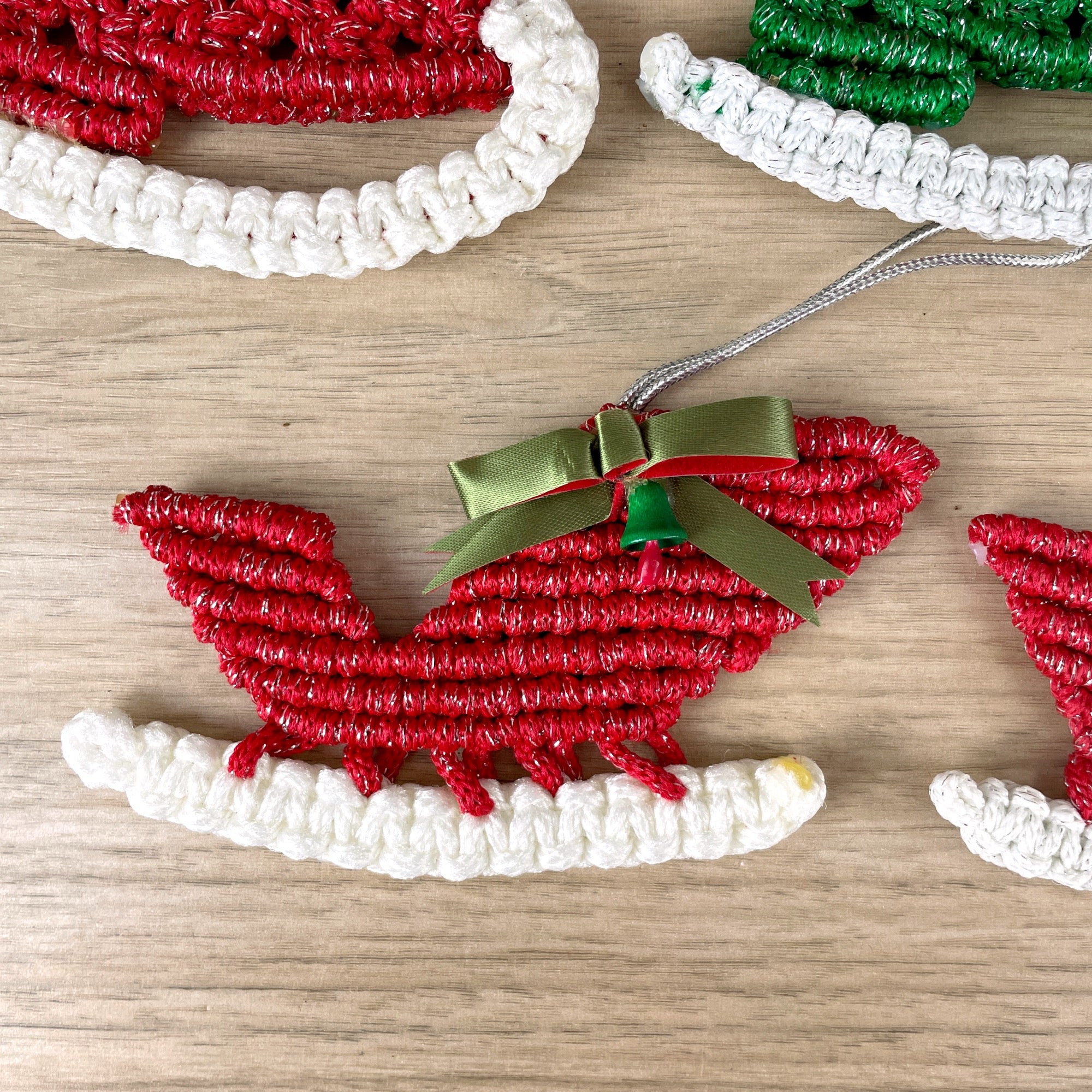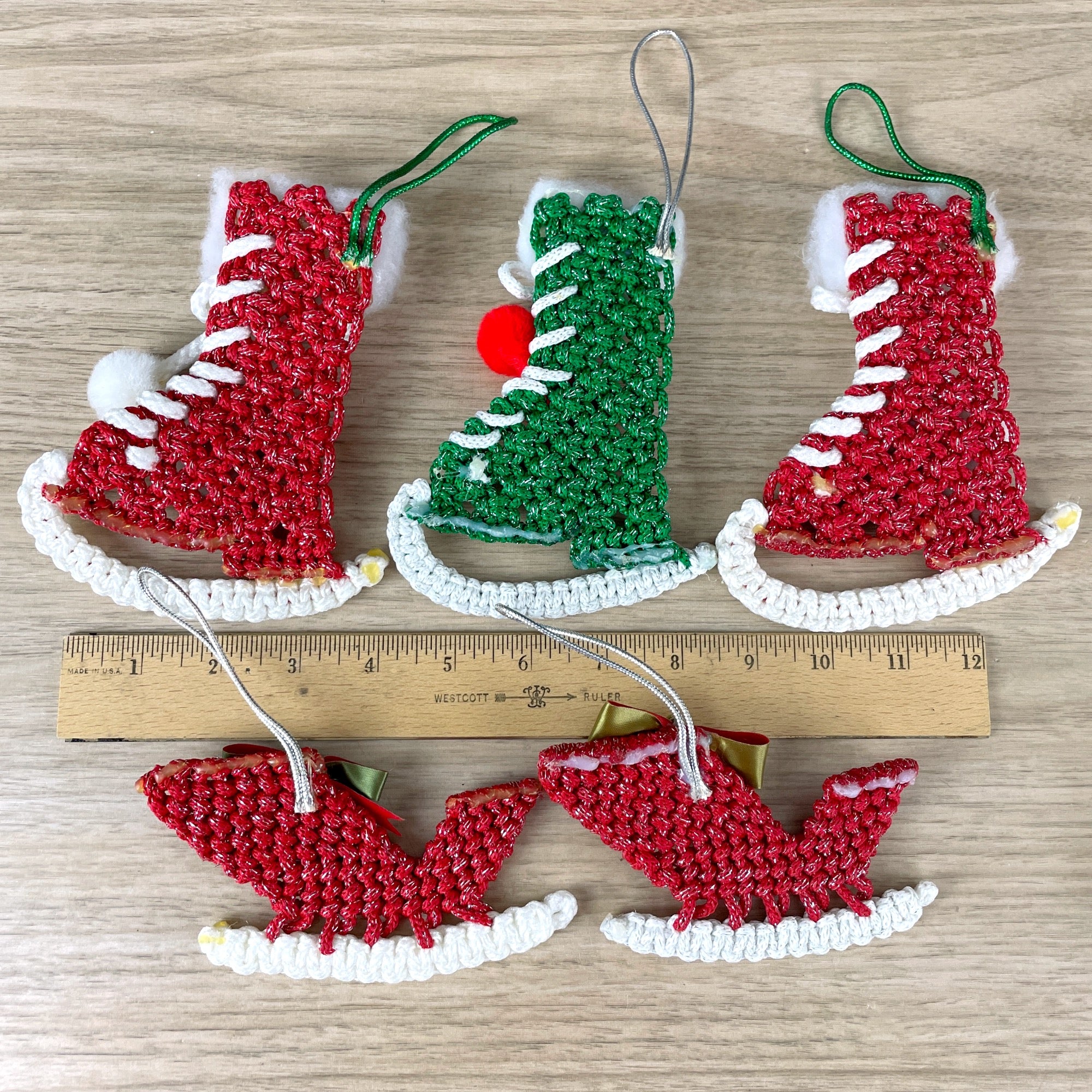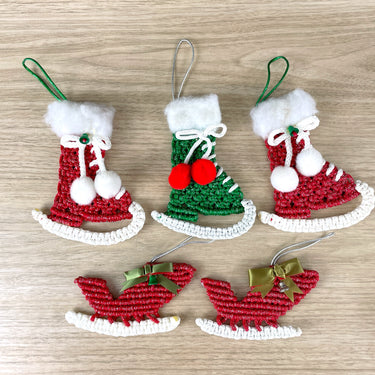 Set of 5 glittery macrame Christmas ornaments. There are 2 red ice skates decorated with ties and bells, 2 red sleighs with ribbons and bells, and a green ice skate with ties and pompoms. Absolutely adorable as ornaments or package tie-ons.