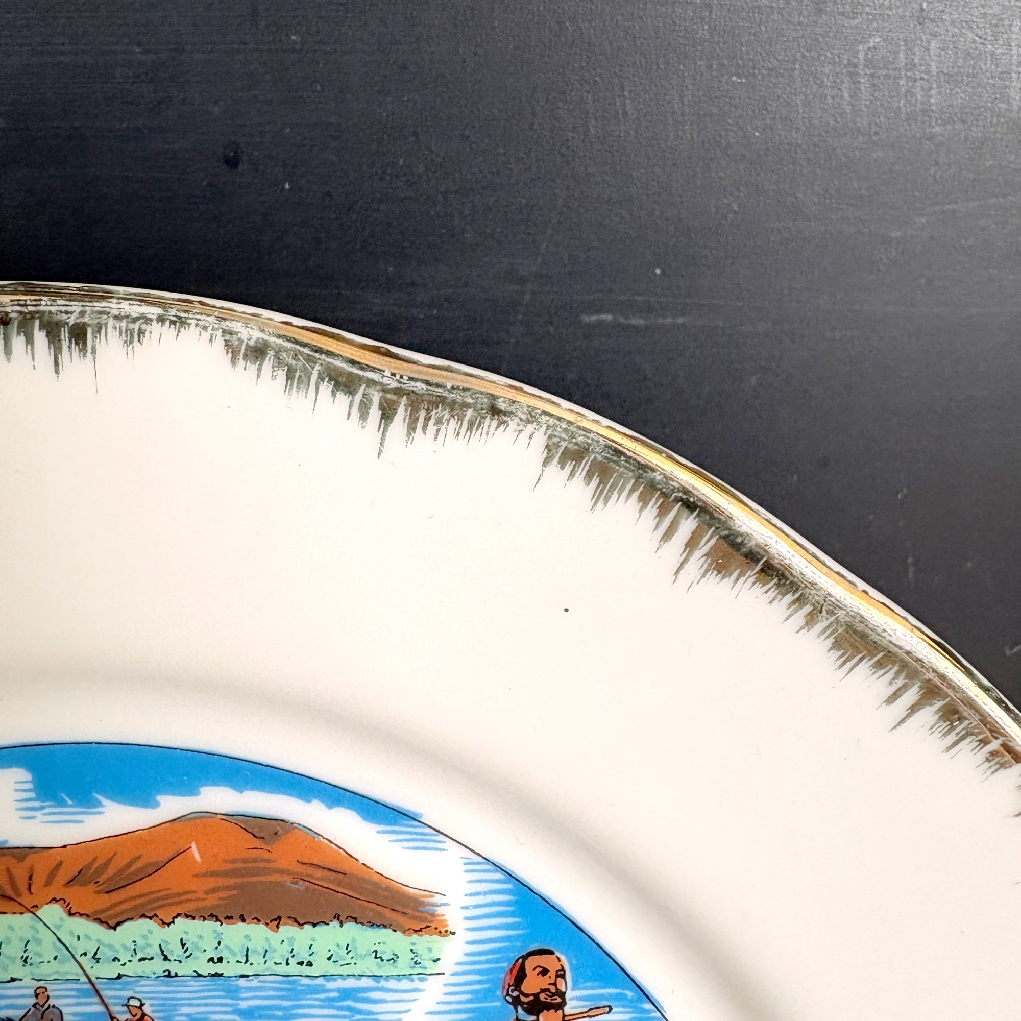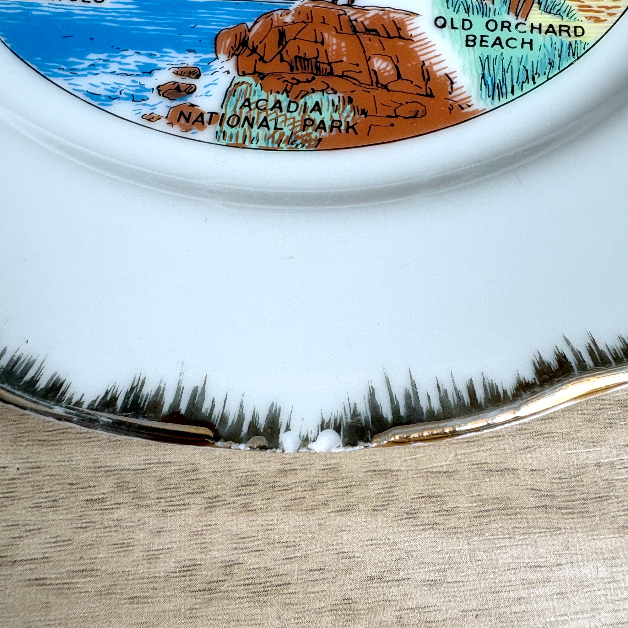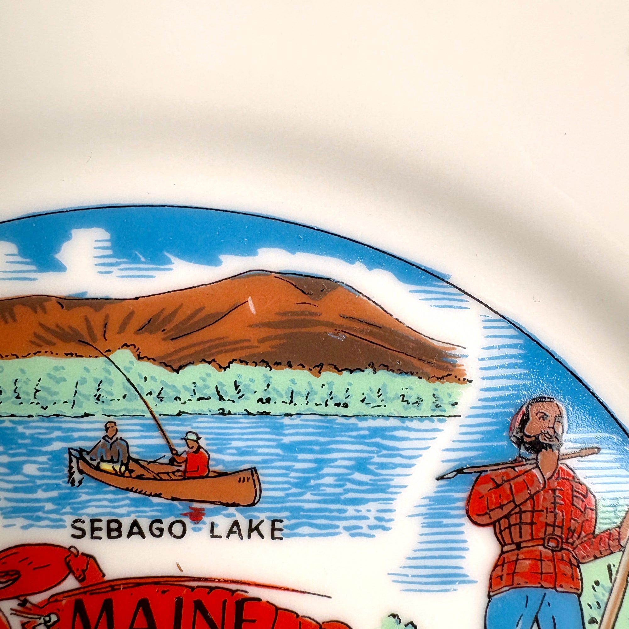 CONDITION Very good. Slight wear on the outside border of the painted design. Two small chips on the bottom of the rim. A small scratch in the paint on the mountains of Sebago Lake.