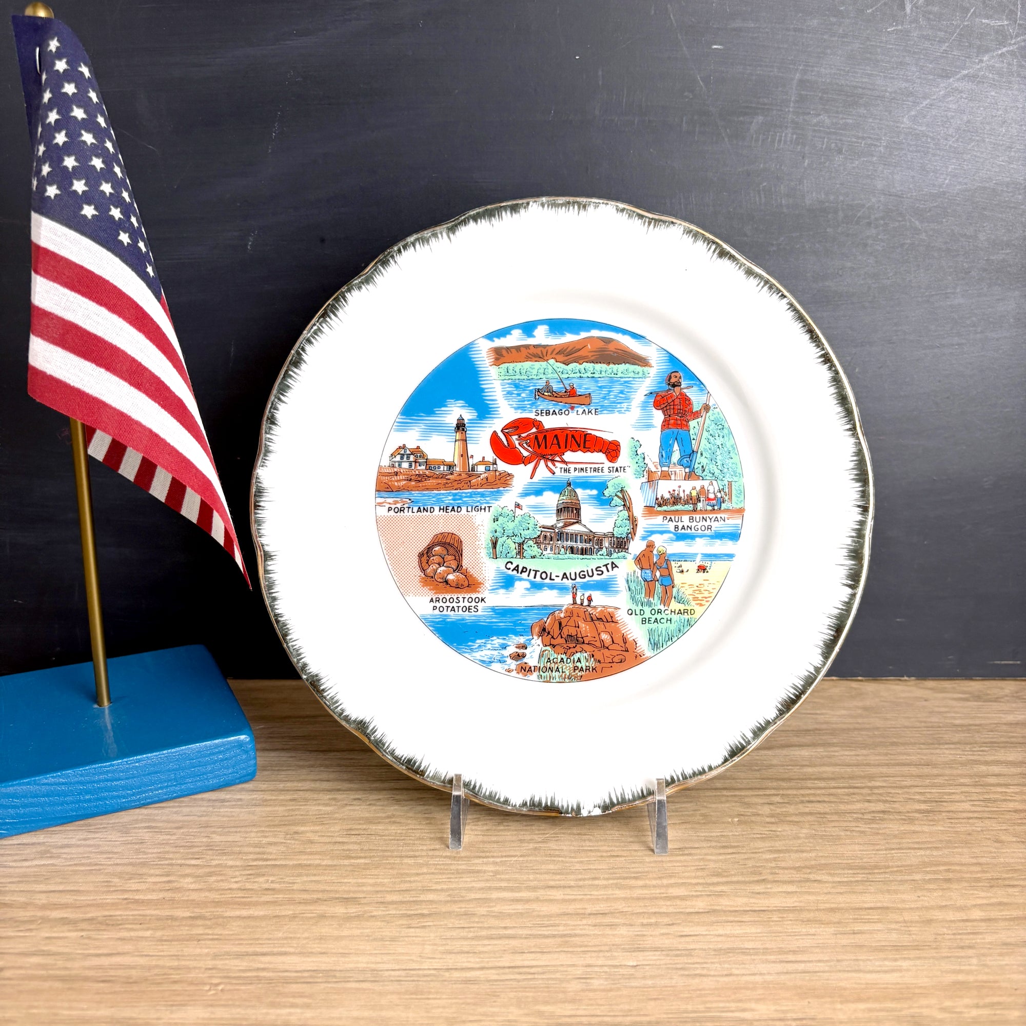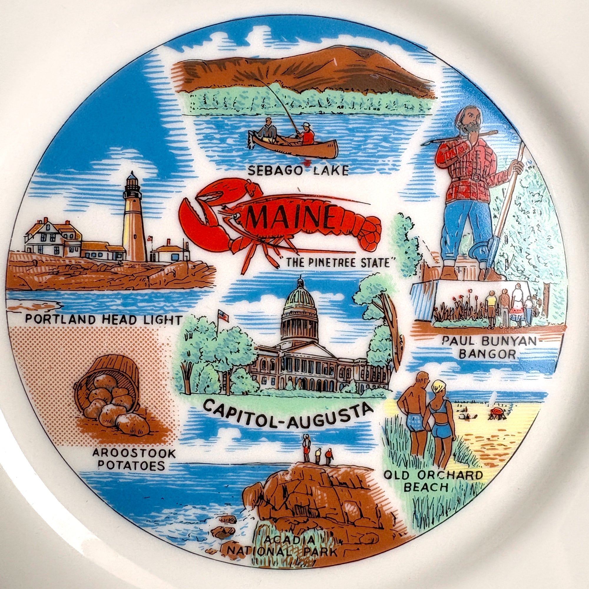 Vintage 1960s Maine souvenir state plate. The center image depicts the Capitol of Augusta surrounded by images of: