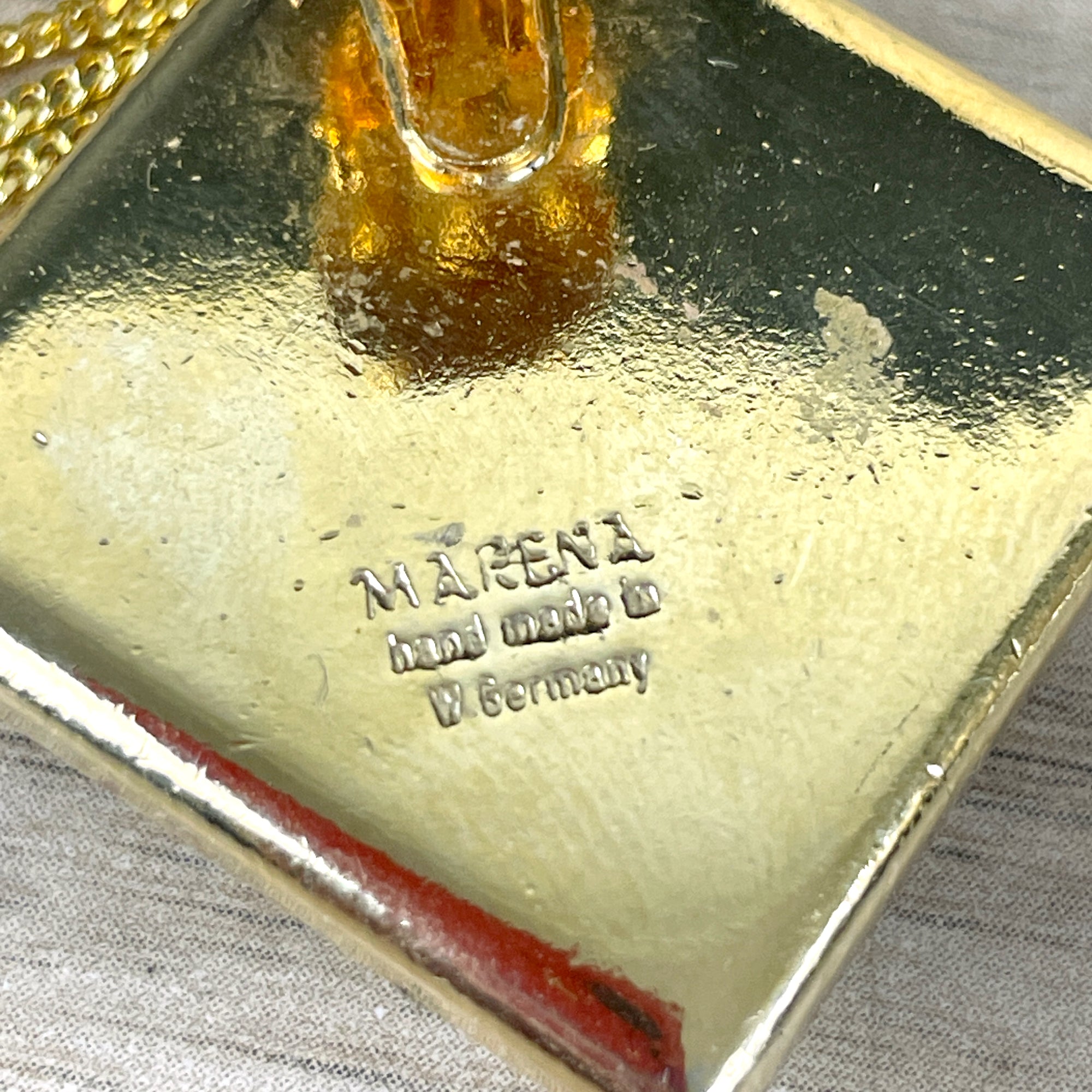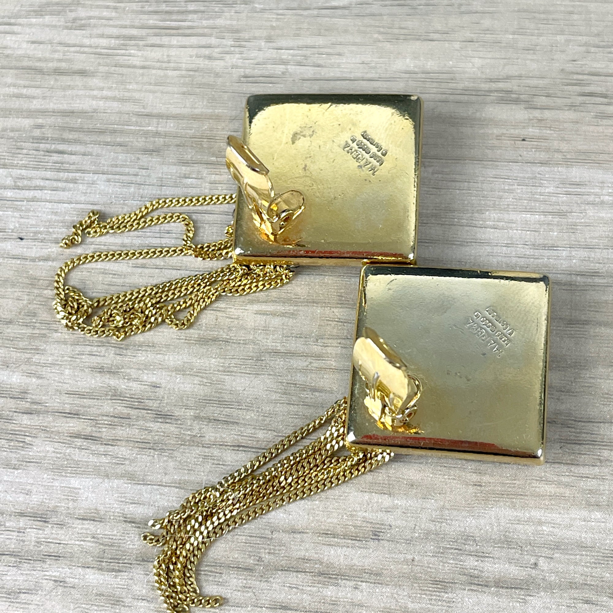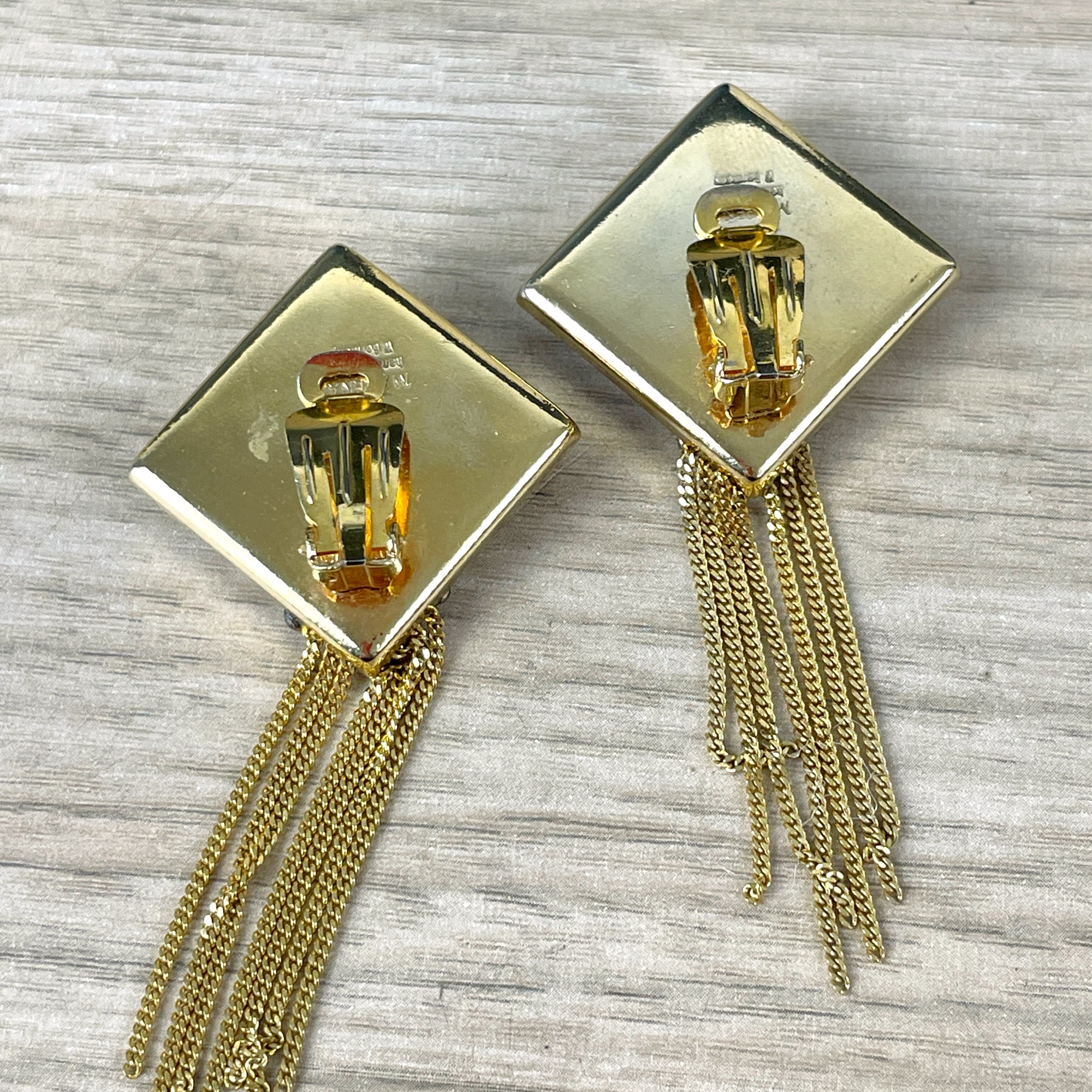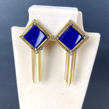 Marena clip on earrings - W Germany vintage. 18k gold plated clip on earrings with a square large royal blue stone, accent stones and drop chains. Handmade. Although not marked as such, most Marena pieces were 18k gold plated.