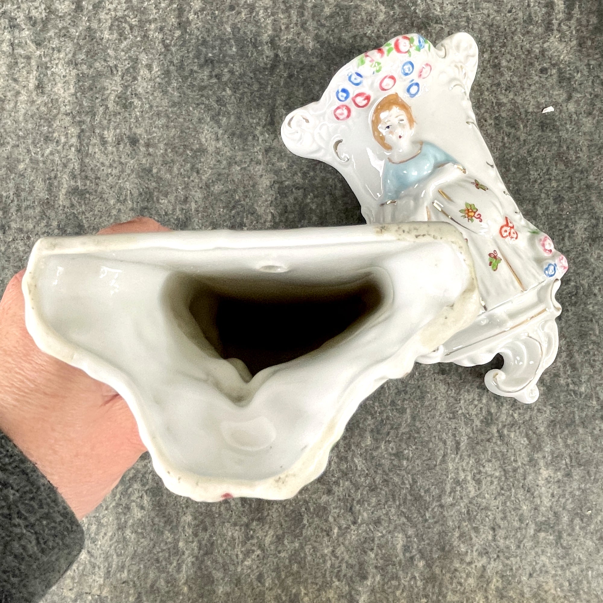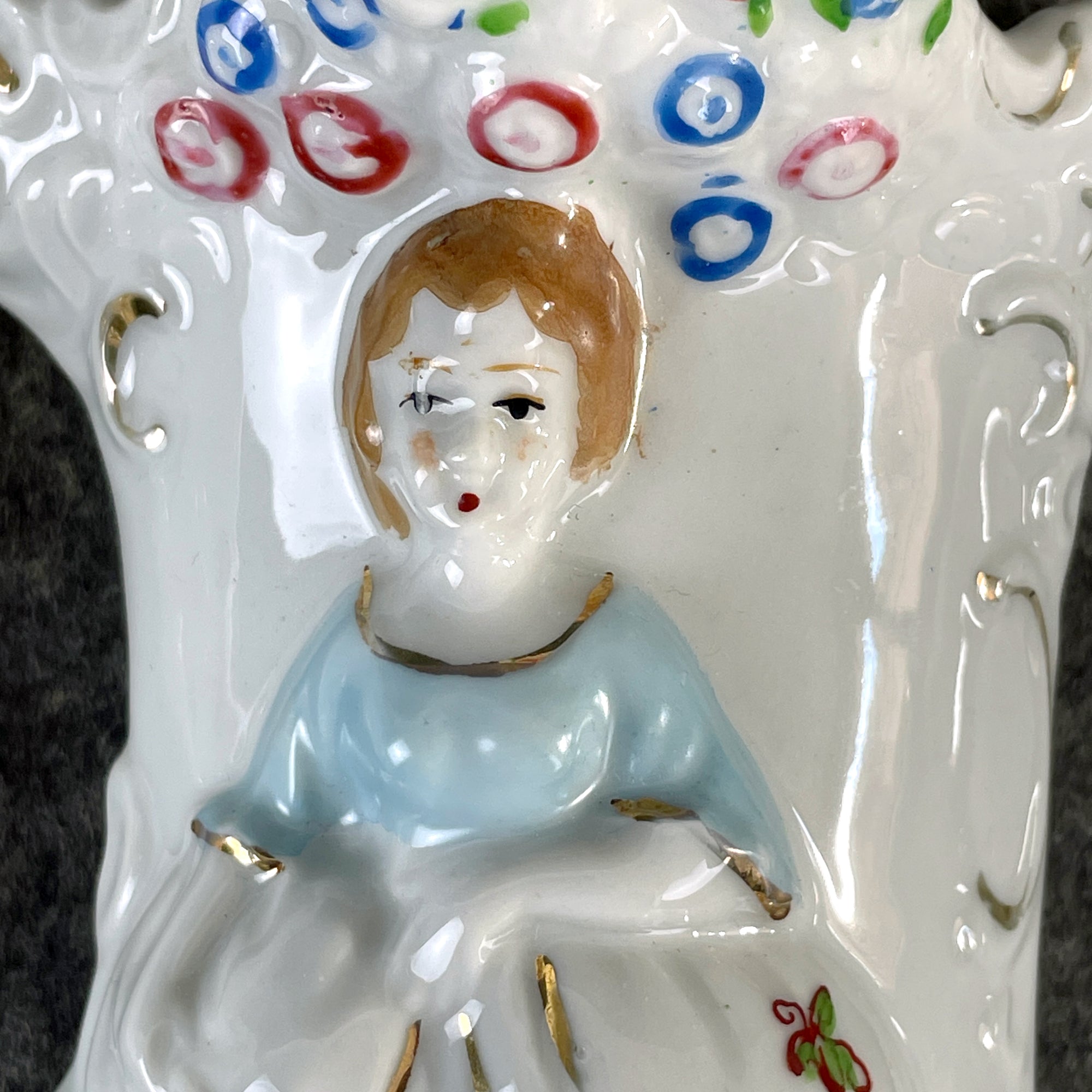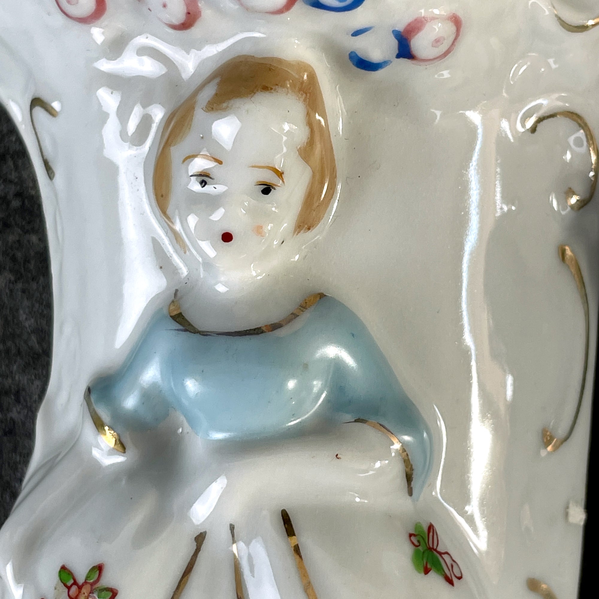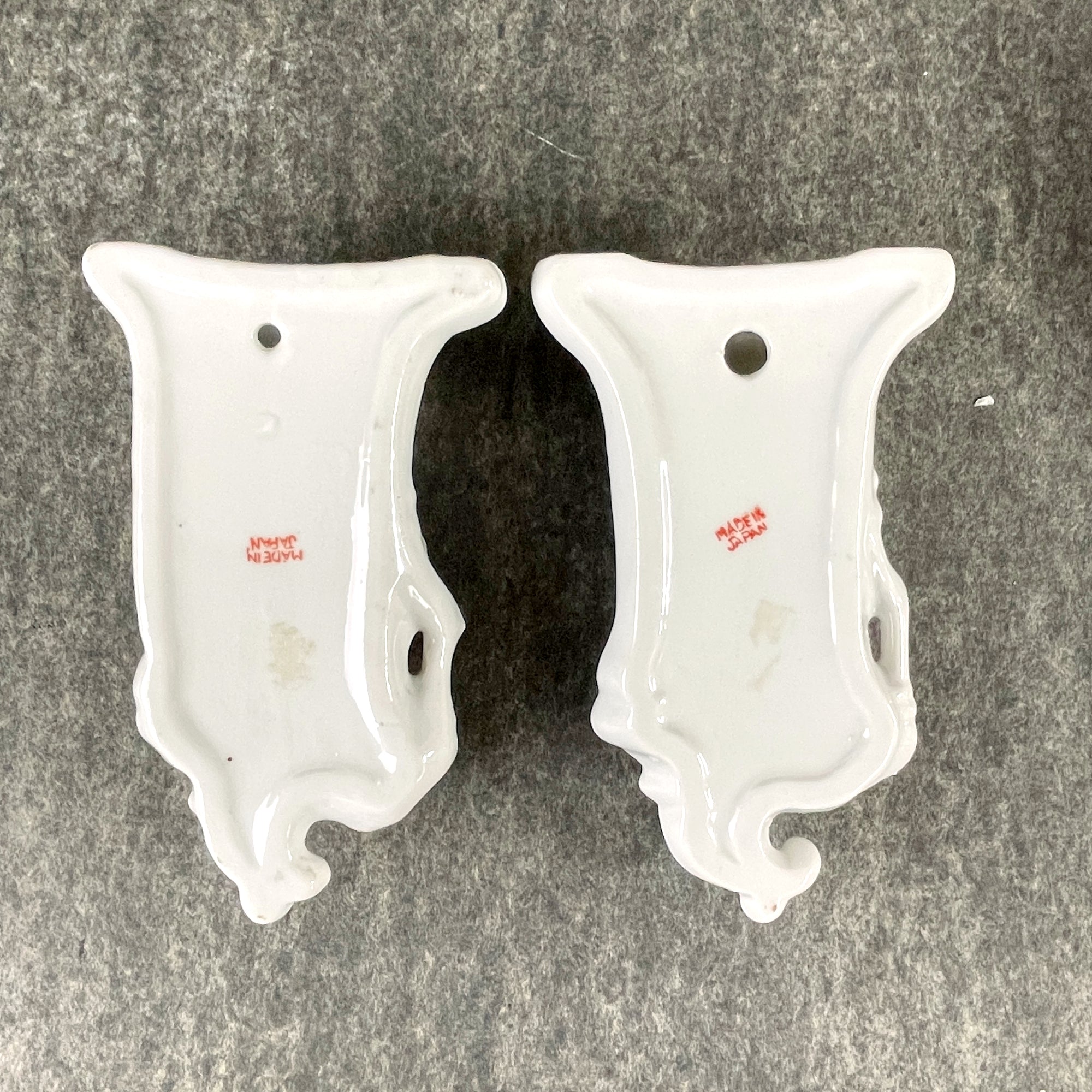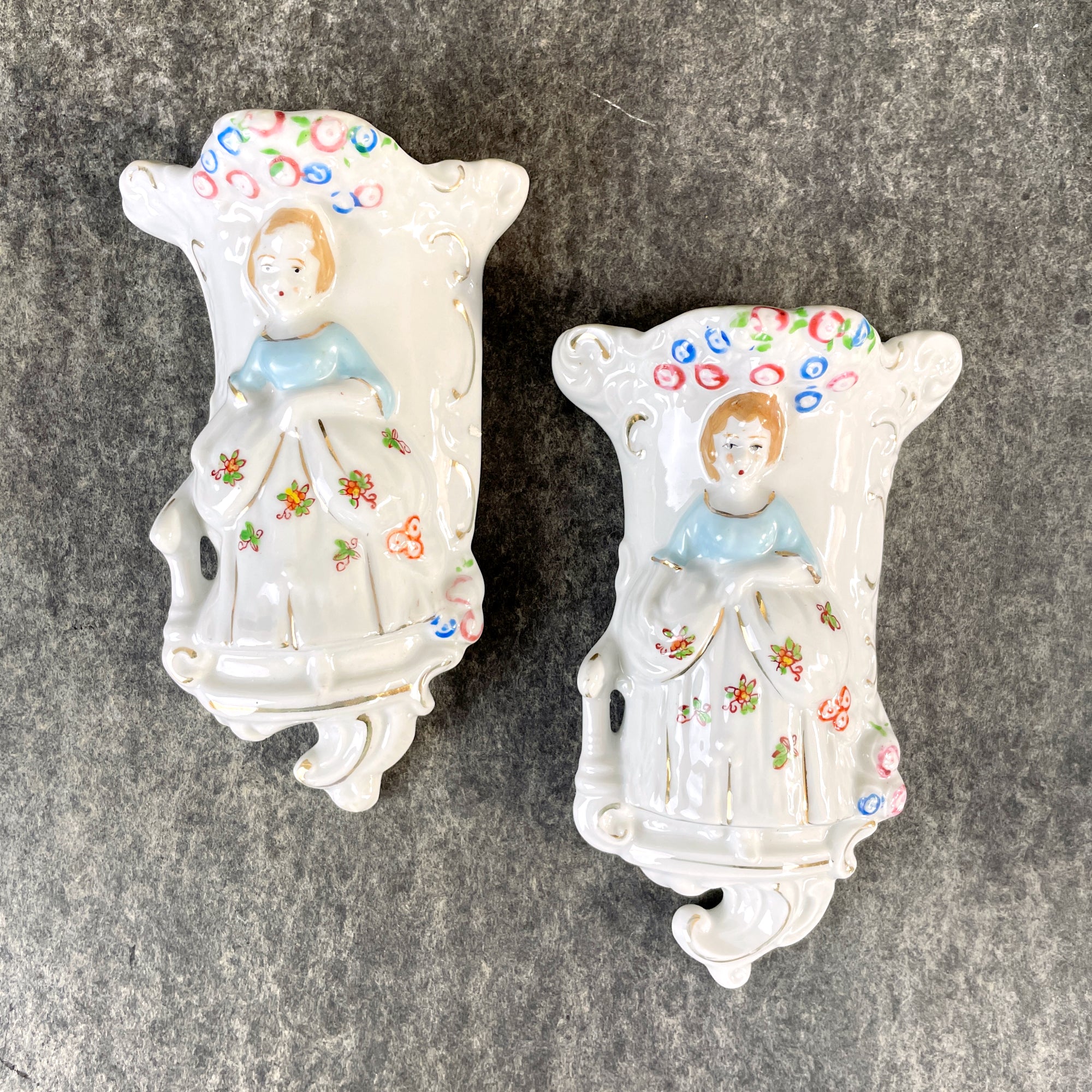 Pair of matching crinoline lady wall pockets. White china pockets with ladies and flowers in relief. Flourish at the bottom. Hole in back for hanging. Painted and applied decoration. Decor quality, not fine porcelain.