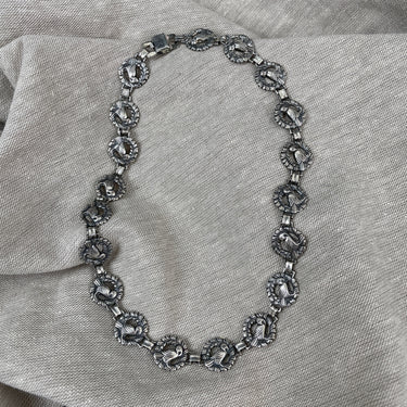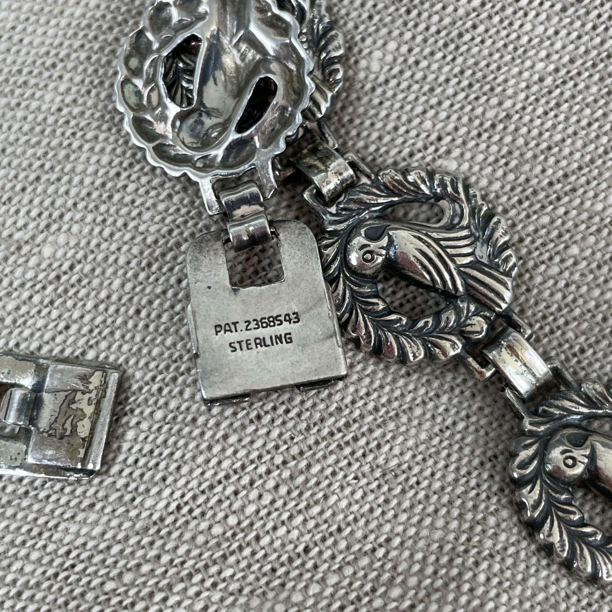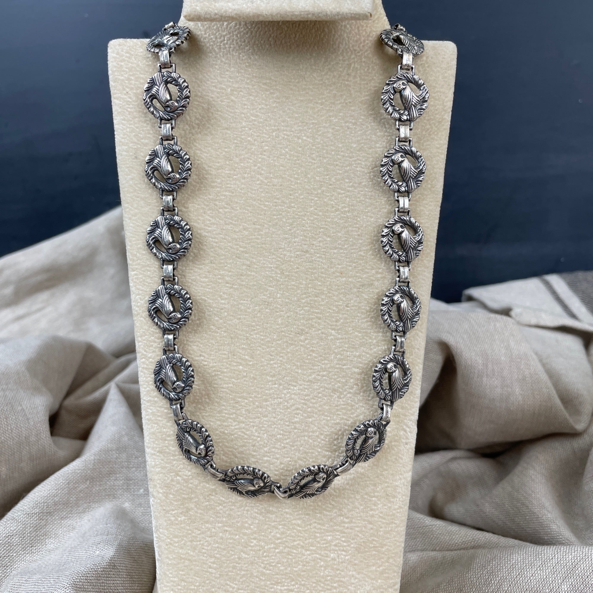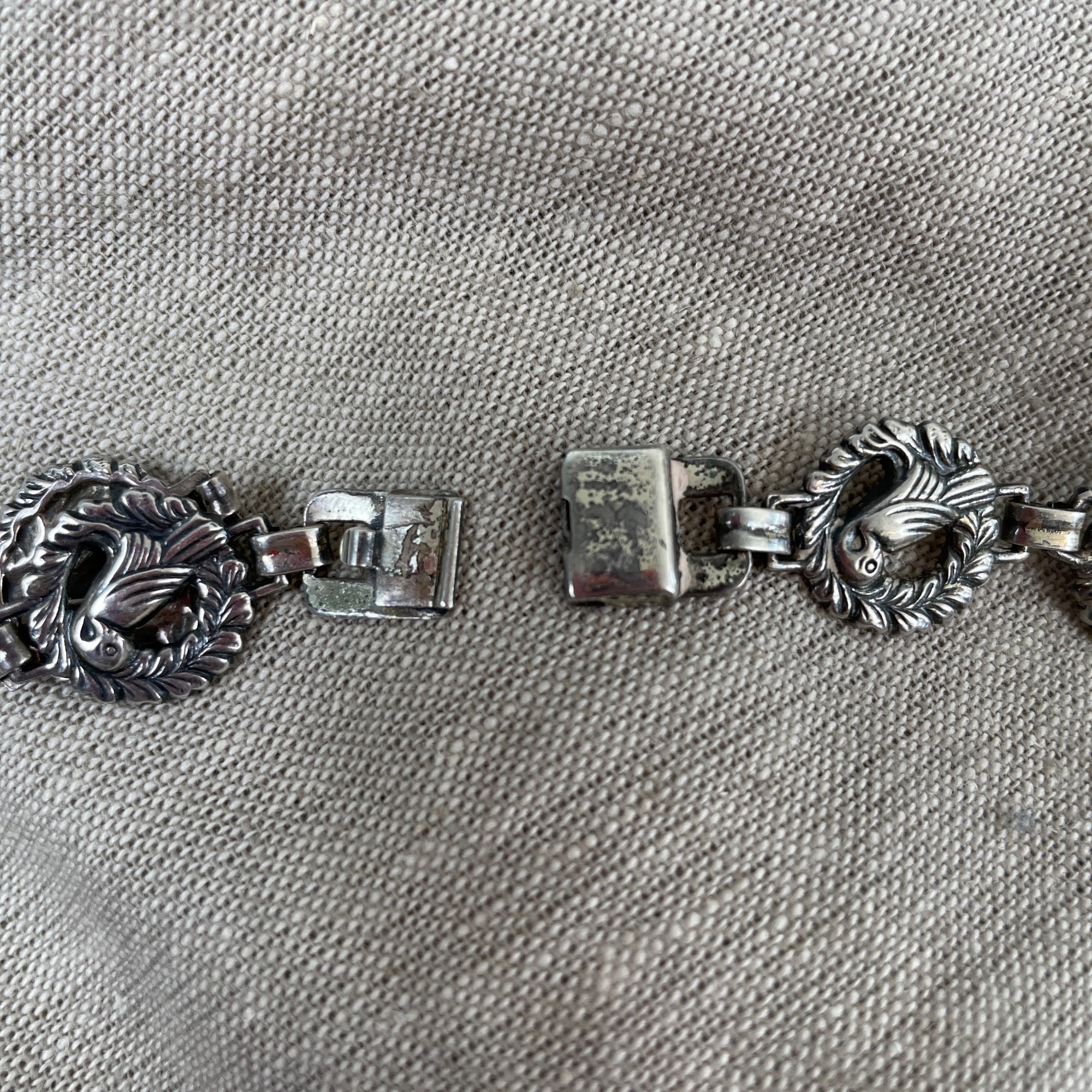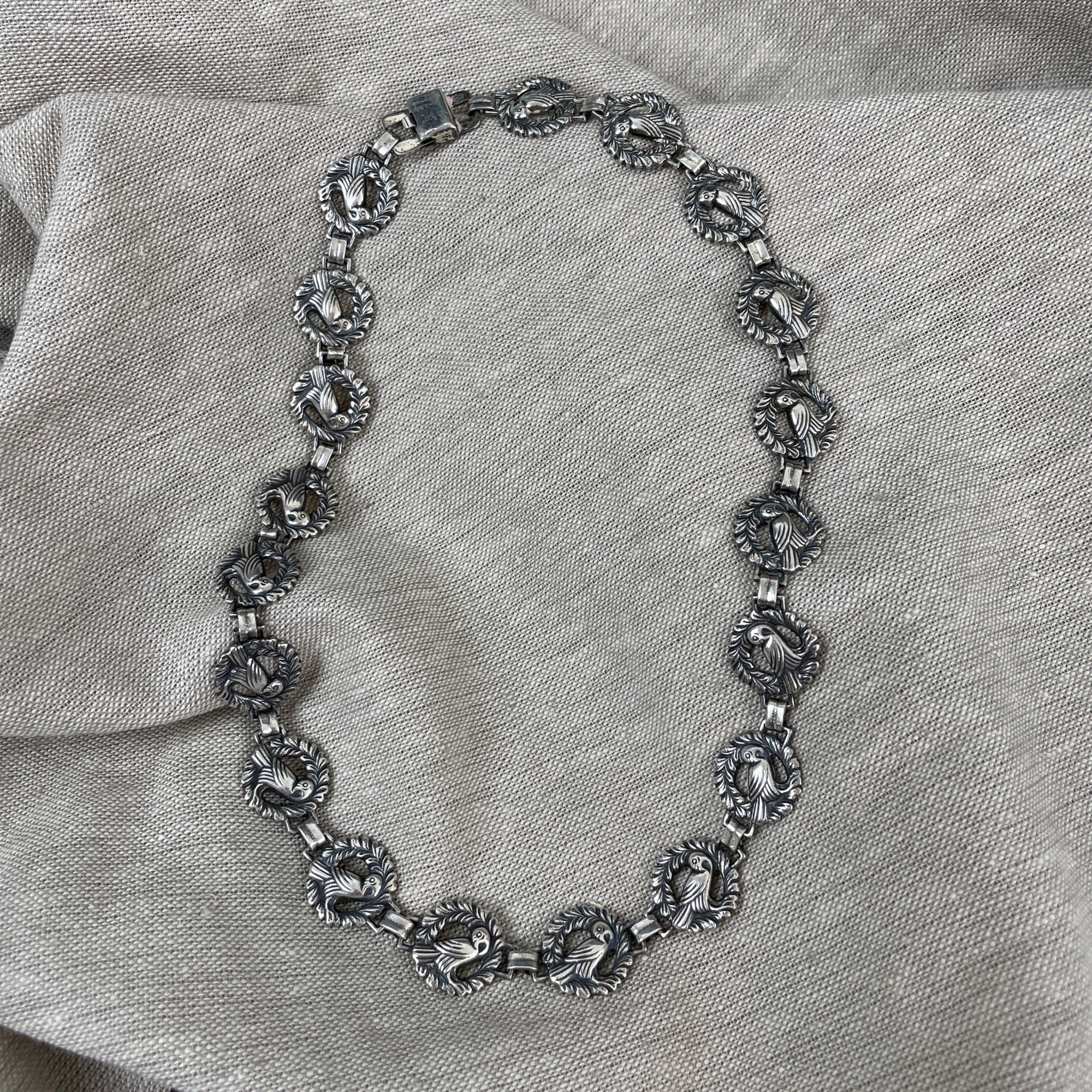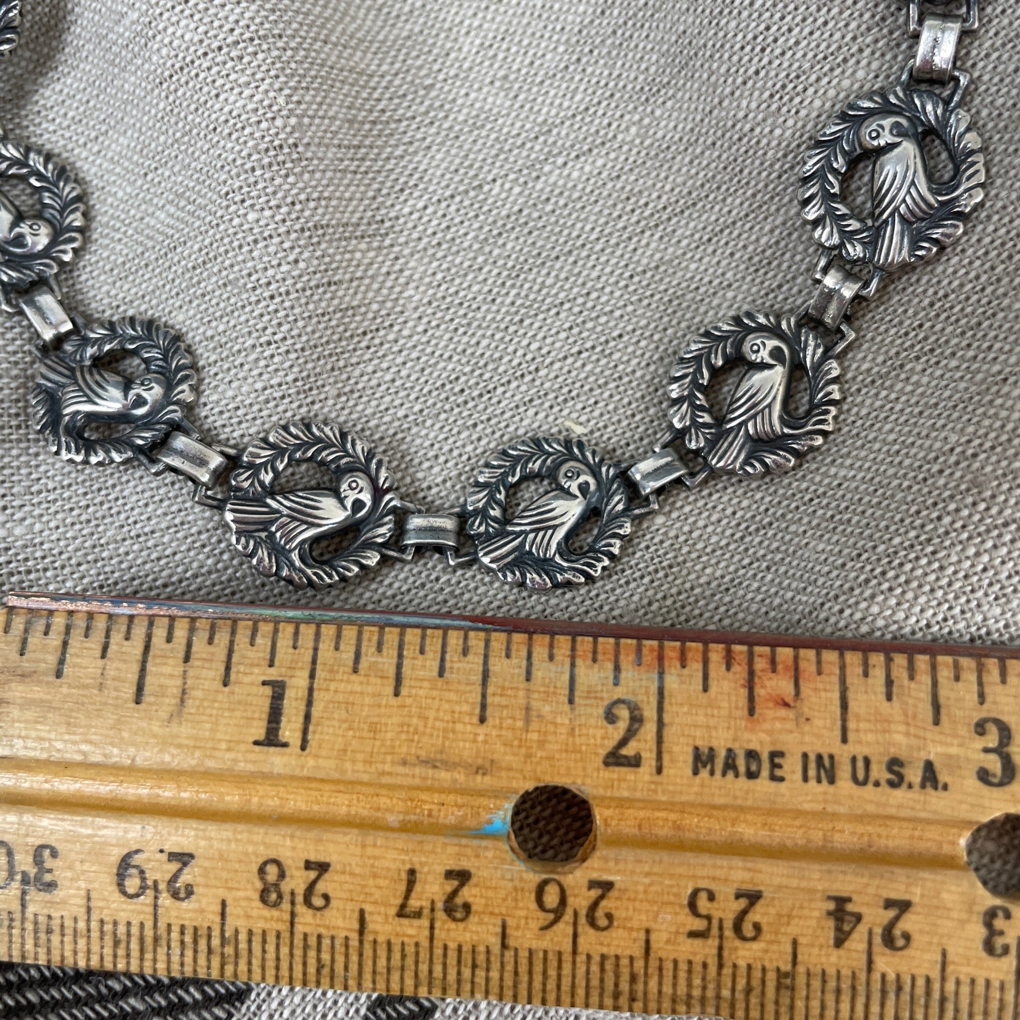 Mid century modern, 1950s sterling silver choker of birds within a wreath. Marked Sterling and pat. 2368543 on the clasp. The perfect length to showcase with almost any neckline. Awesome gift for the bird lovers in your life