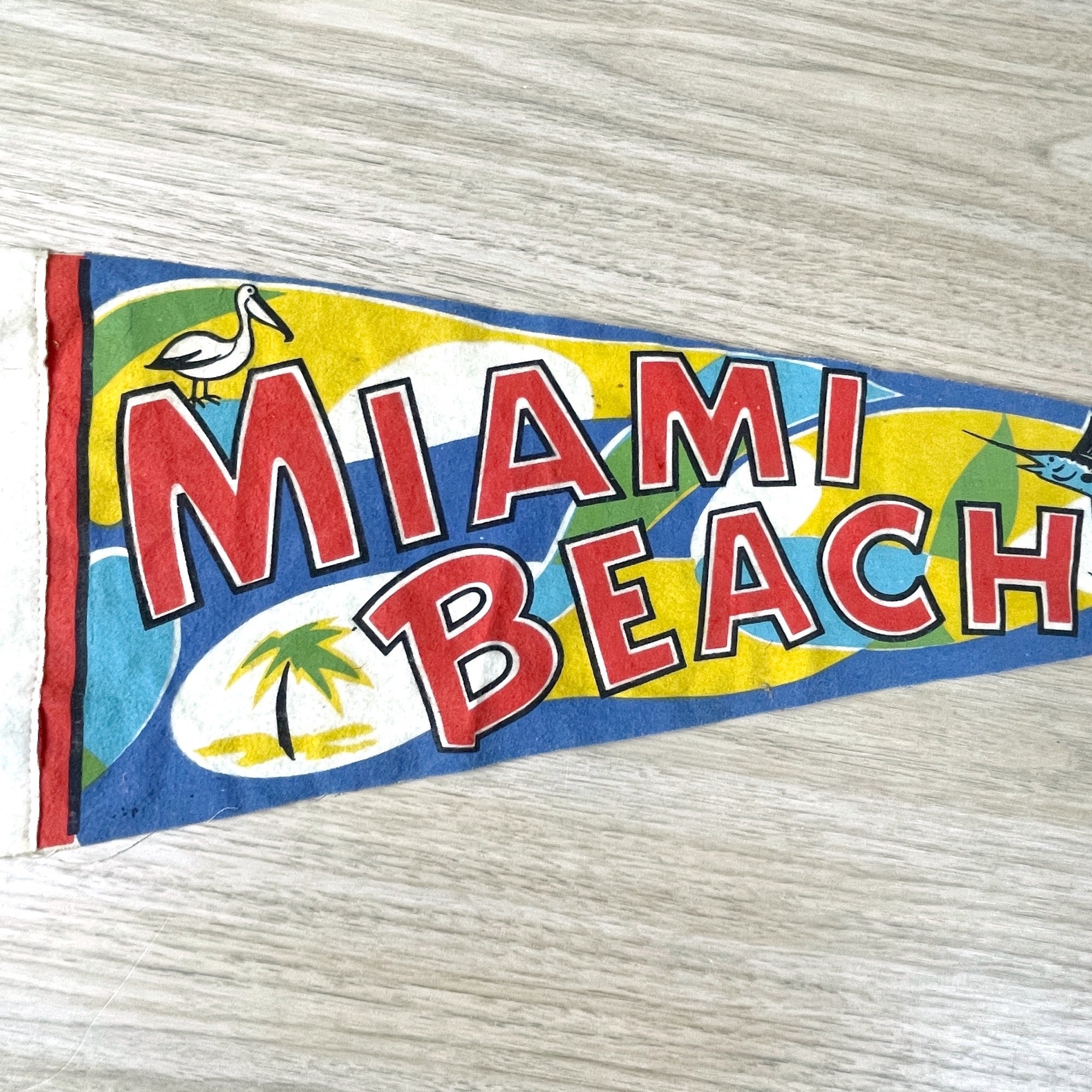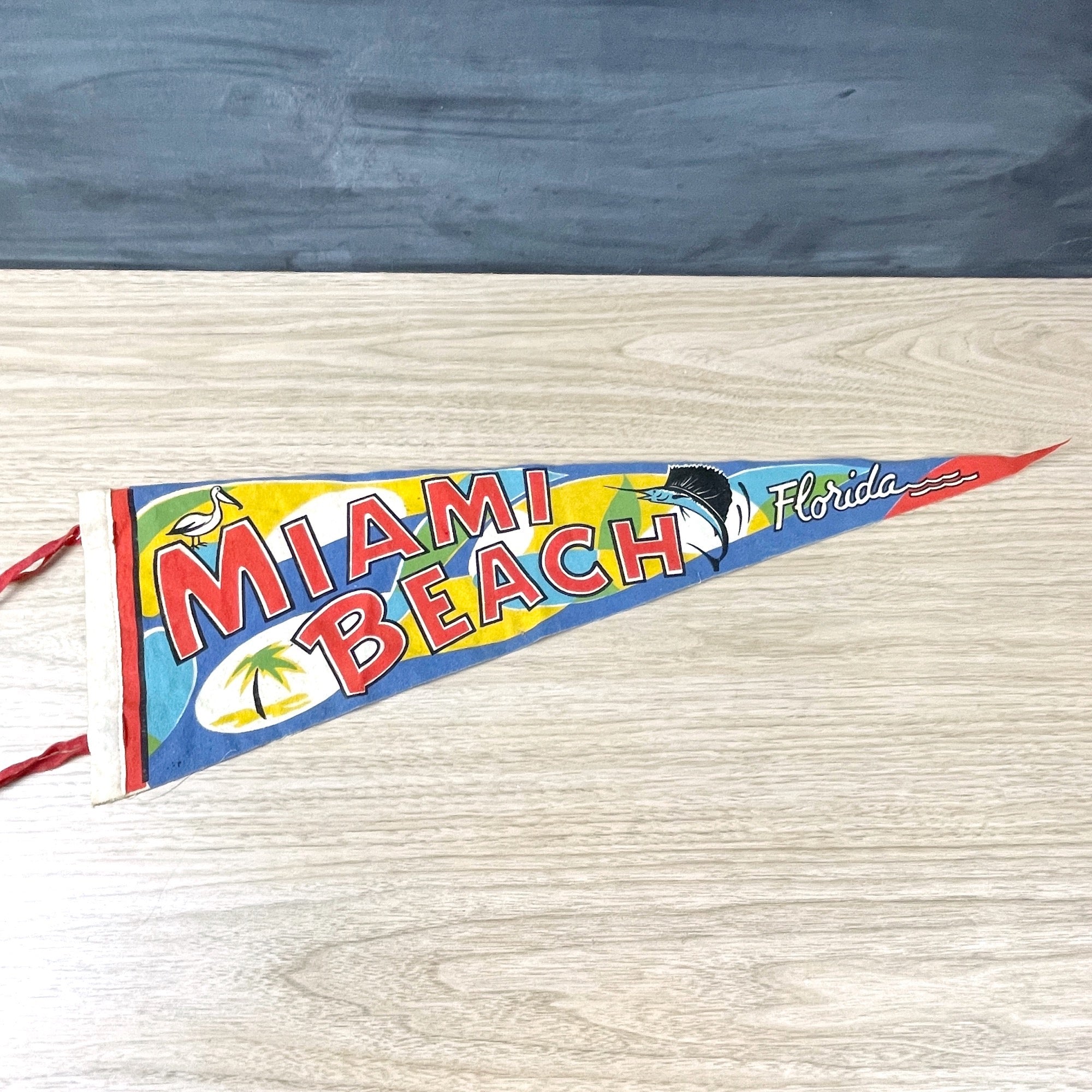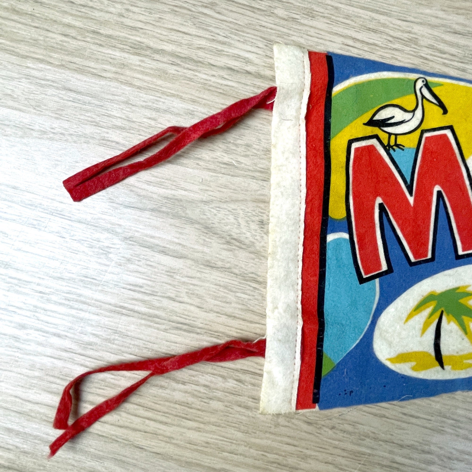 Vintage 1960s Miami Beach, Florida flannel pennant. Printed pennant has wacky lettering just like you want, with a pelican, sailfish and palm tree. Quintessential road trip souvenir. Flannel on the end, with flannel ties.
