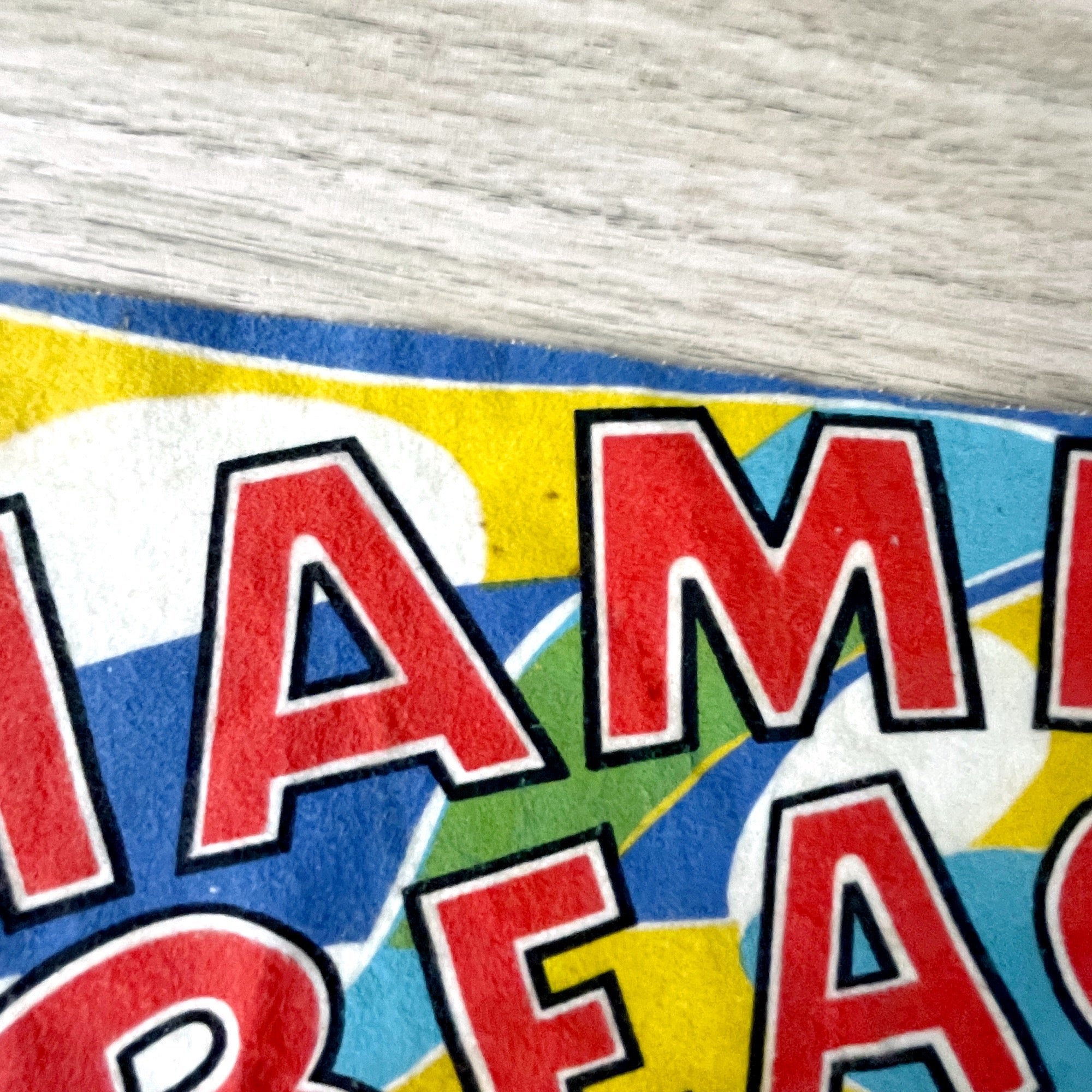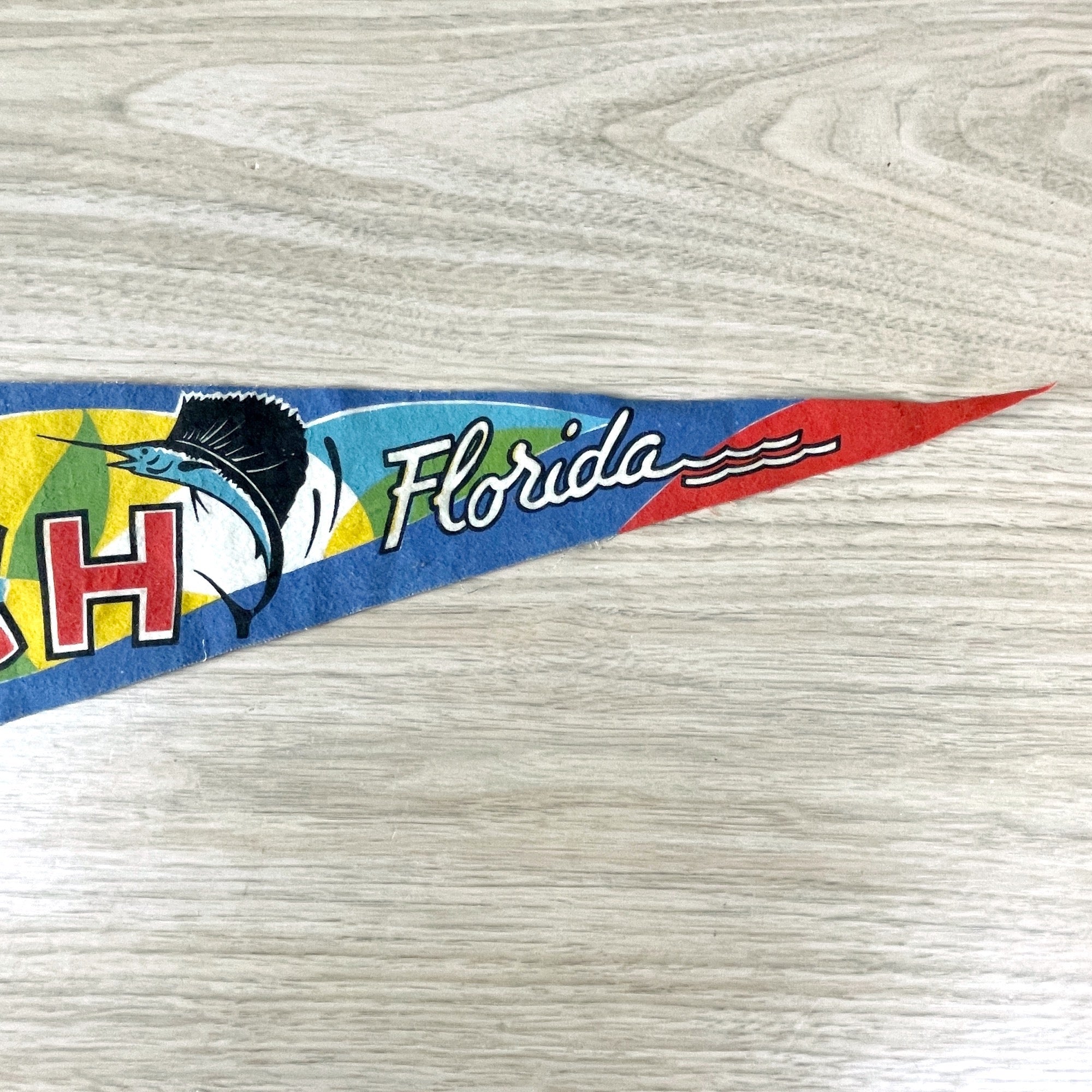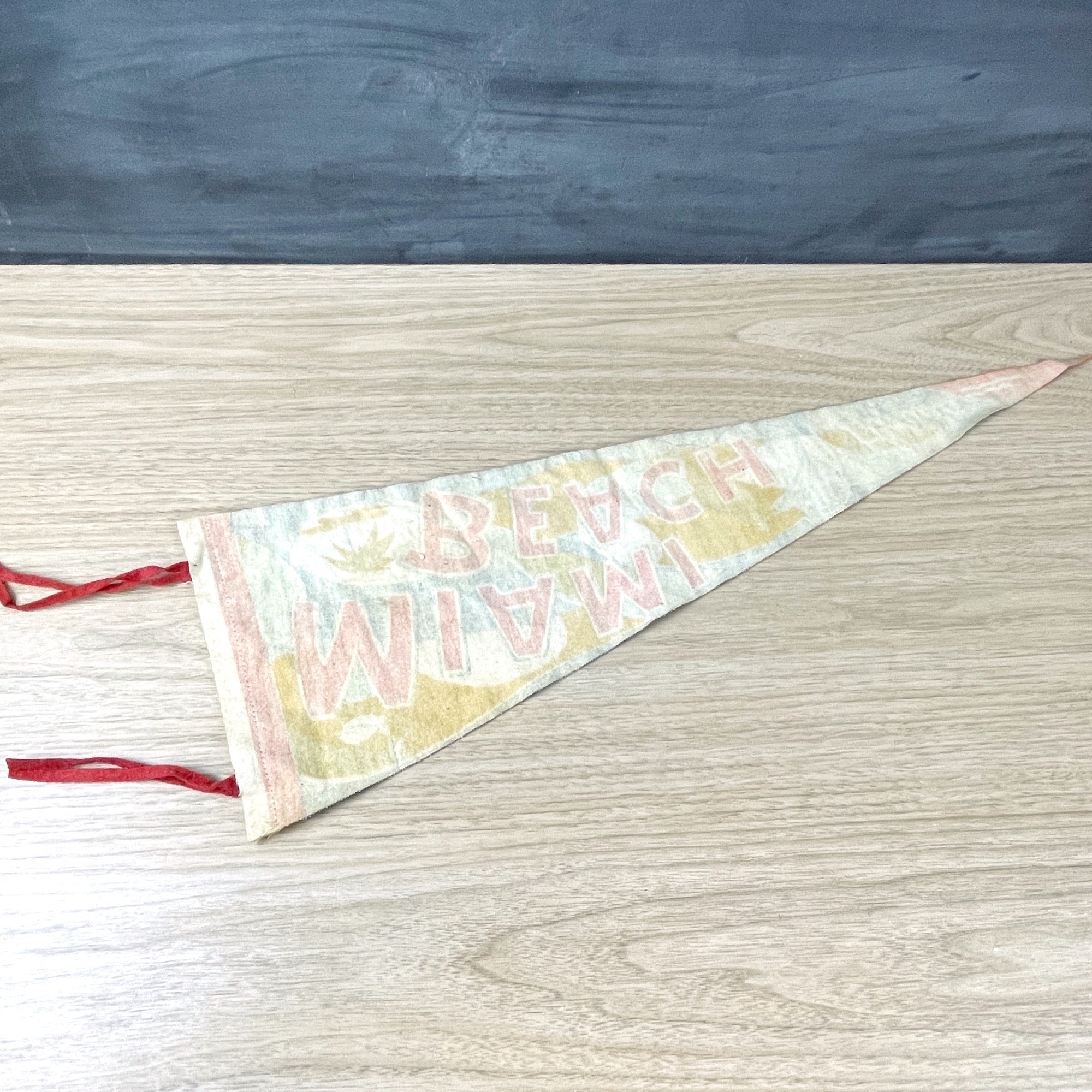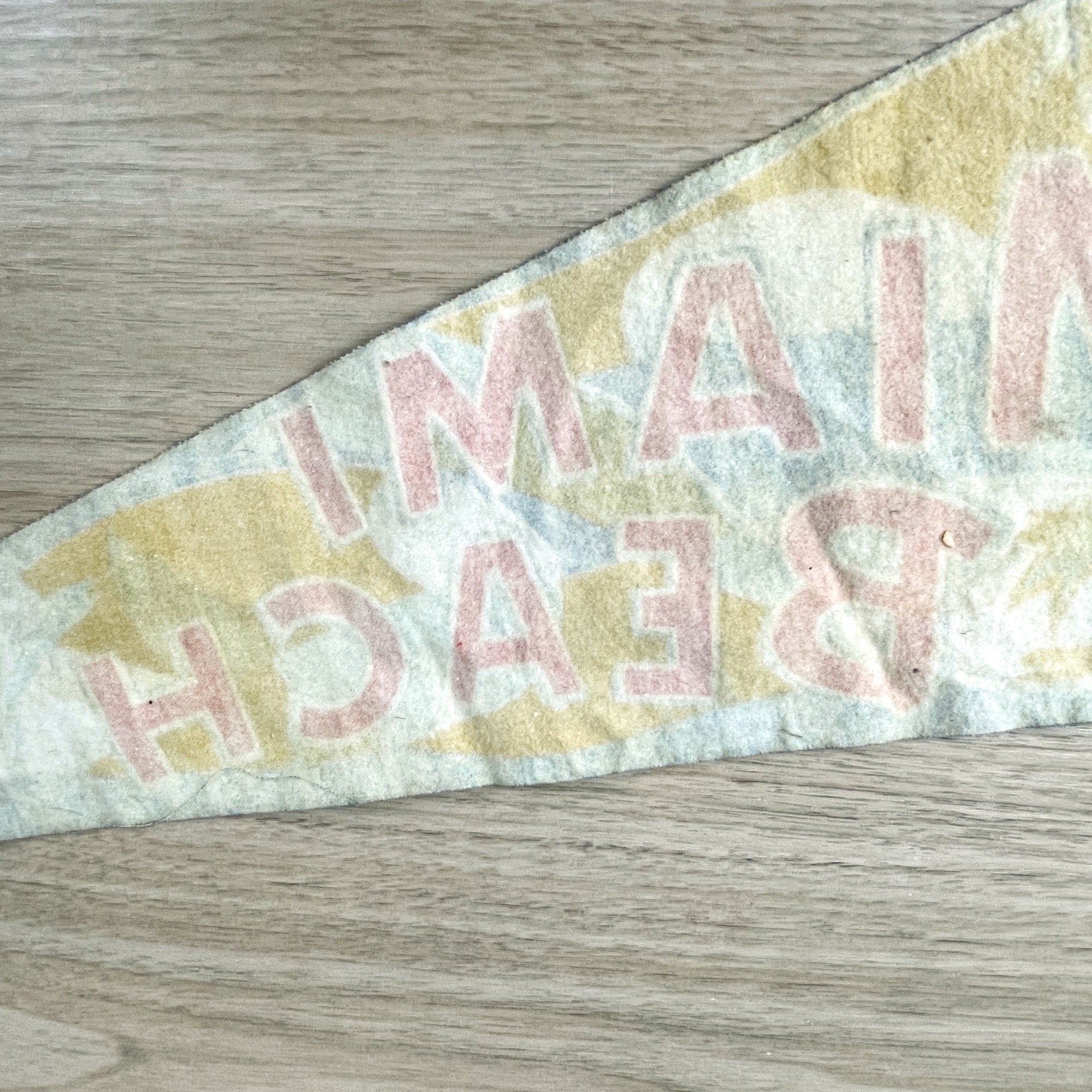 Vintage 1960s Miami Beach, Florida flannel pennant. Printed pennant has wacky lettering just like you want, with a pelican, sailfish and palm tree. Quintessential road trip souvenir. Flannel on the end, with flannel ties.