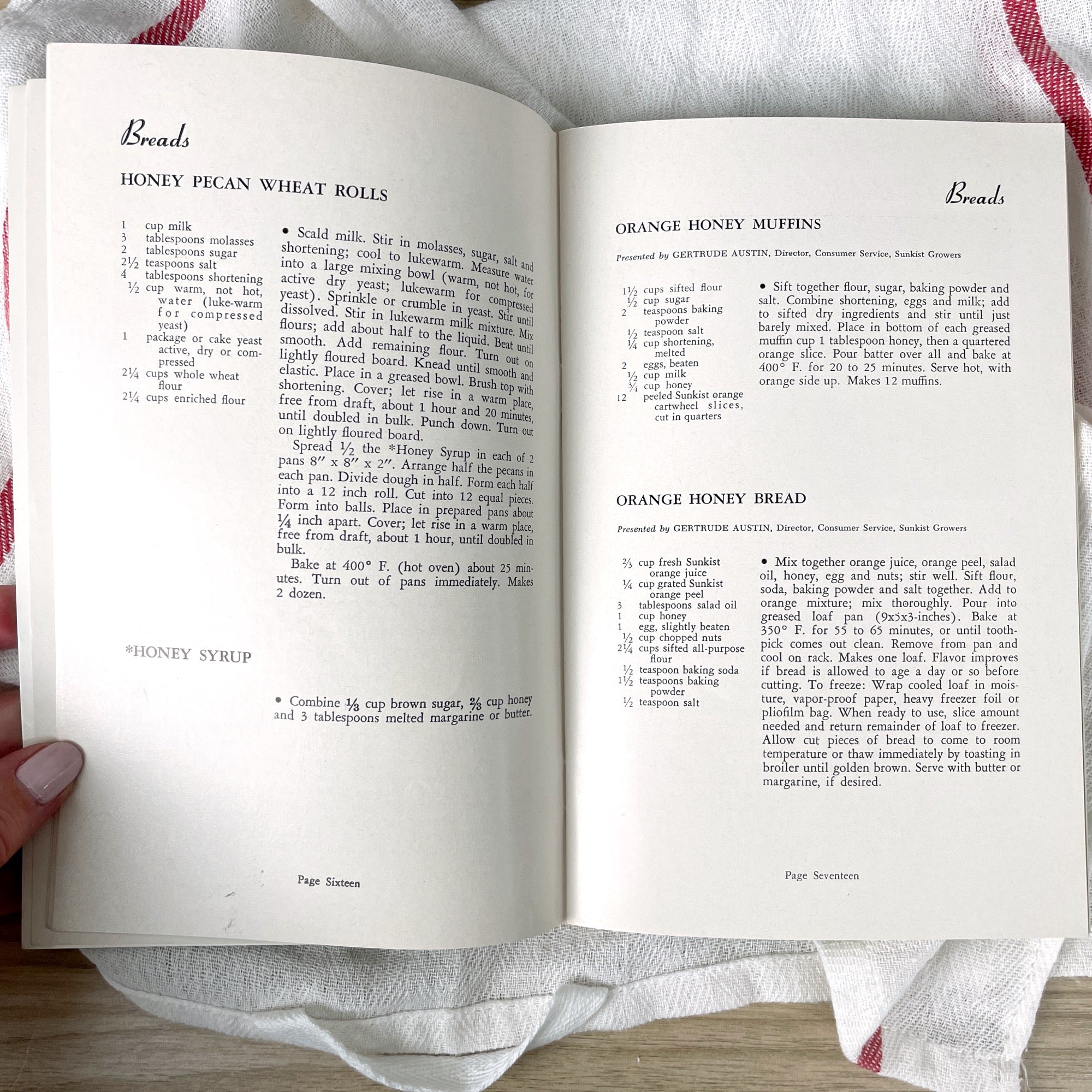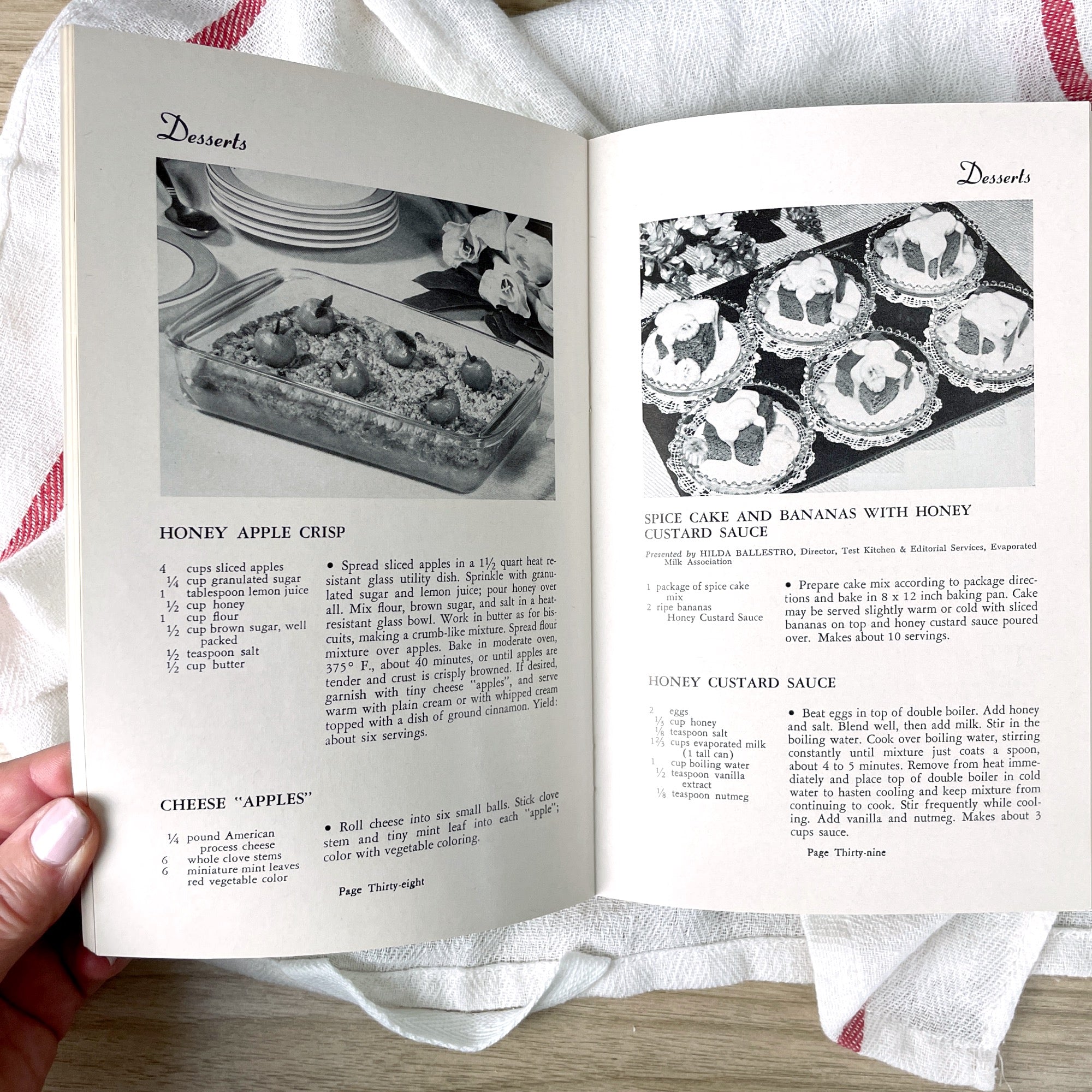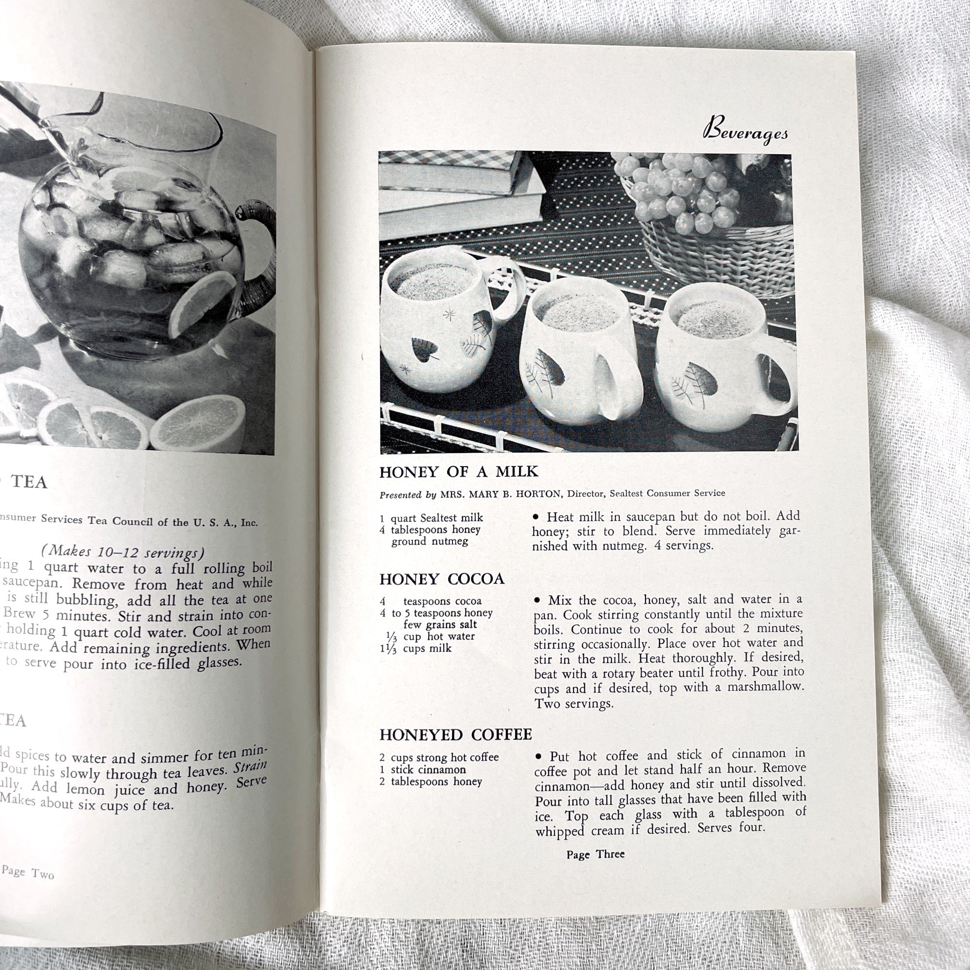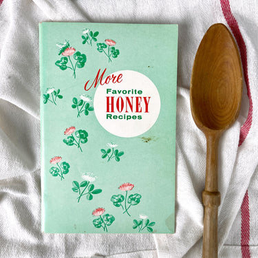 "More Favorite Honey Recipes" from the American Honey Institute, Harriett M. Grace, director. 1956 paperback booklet with saddle staples. Recipes galore with delectable black and white photographs. You'll recognize some of your favorite vintage china and glassware in the photos.