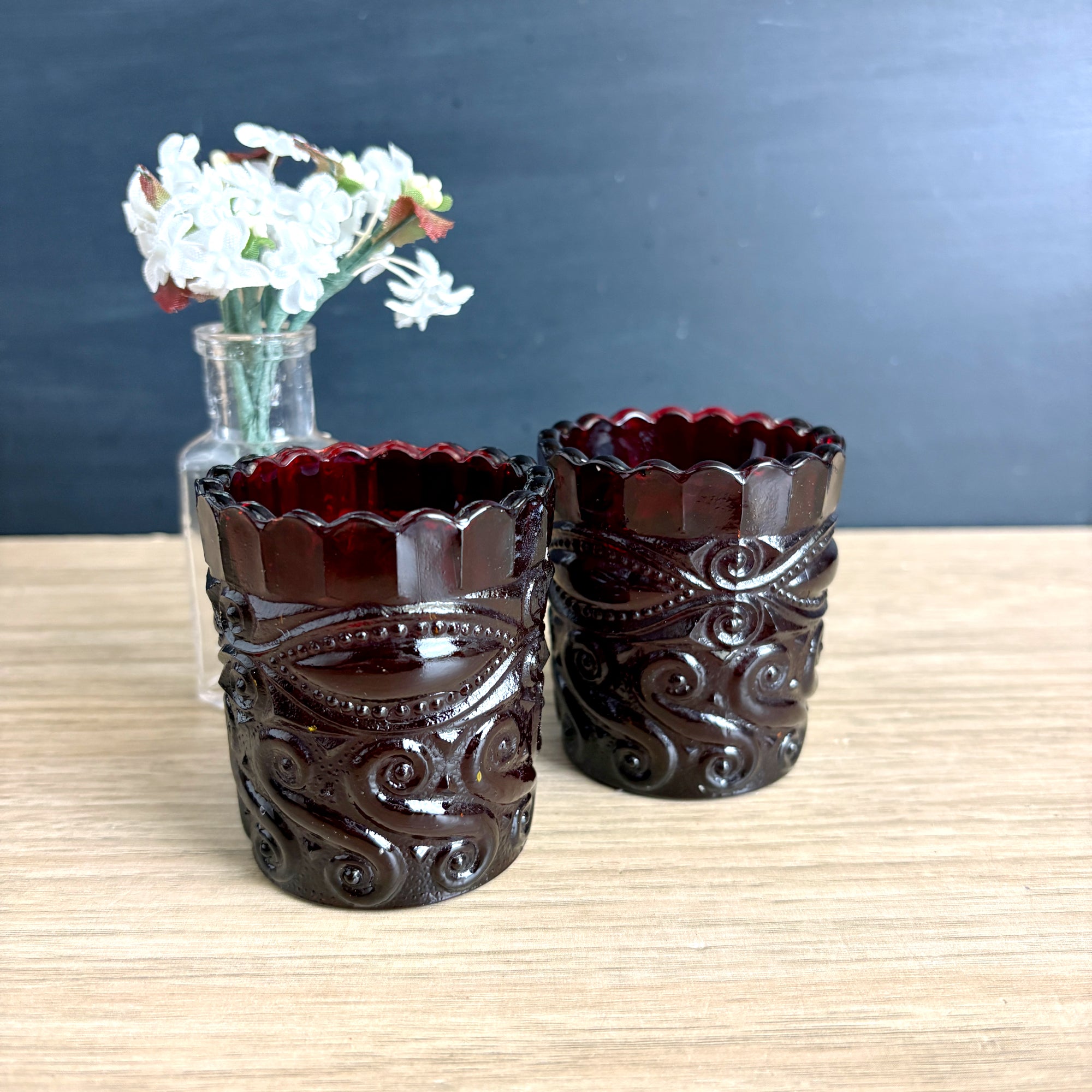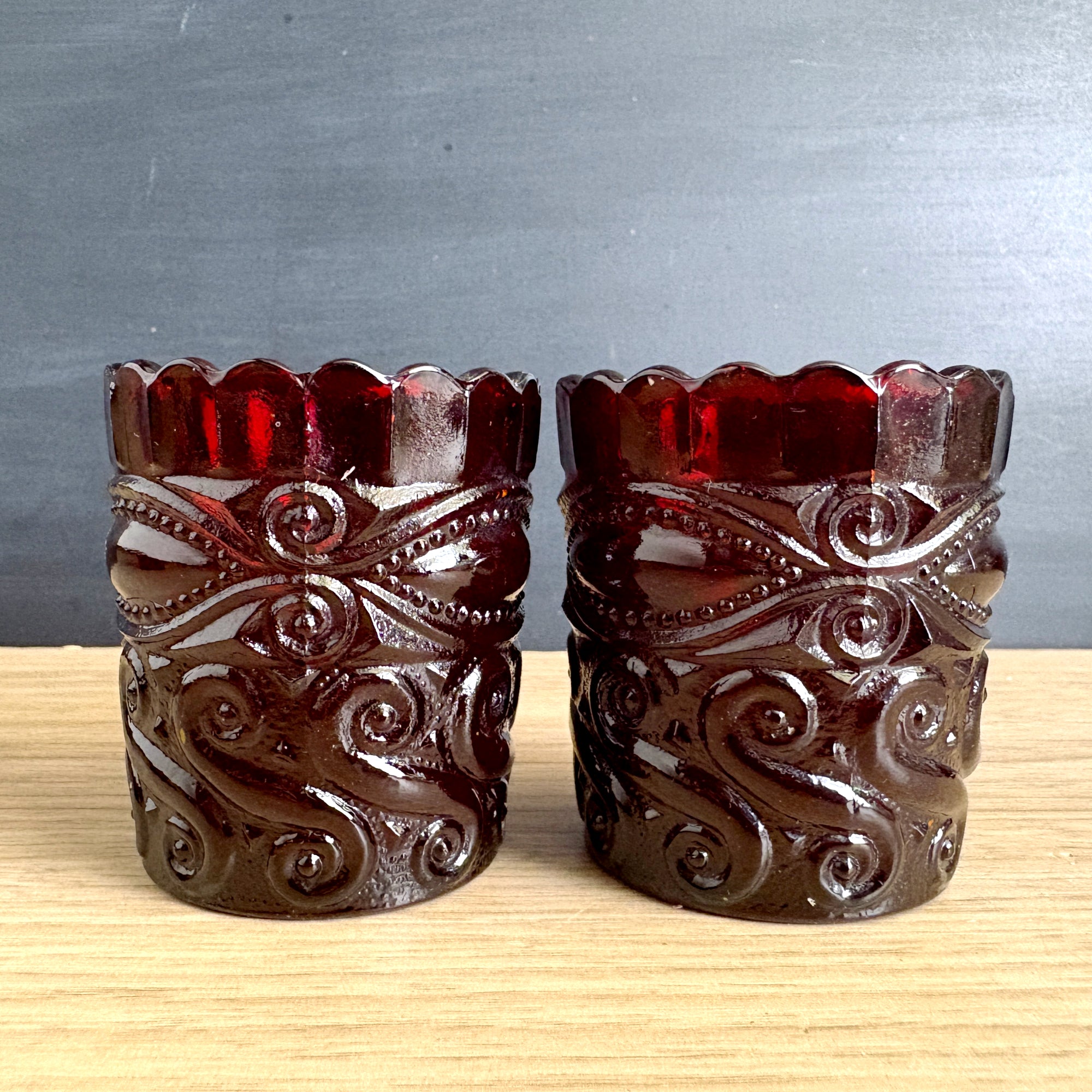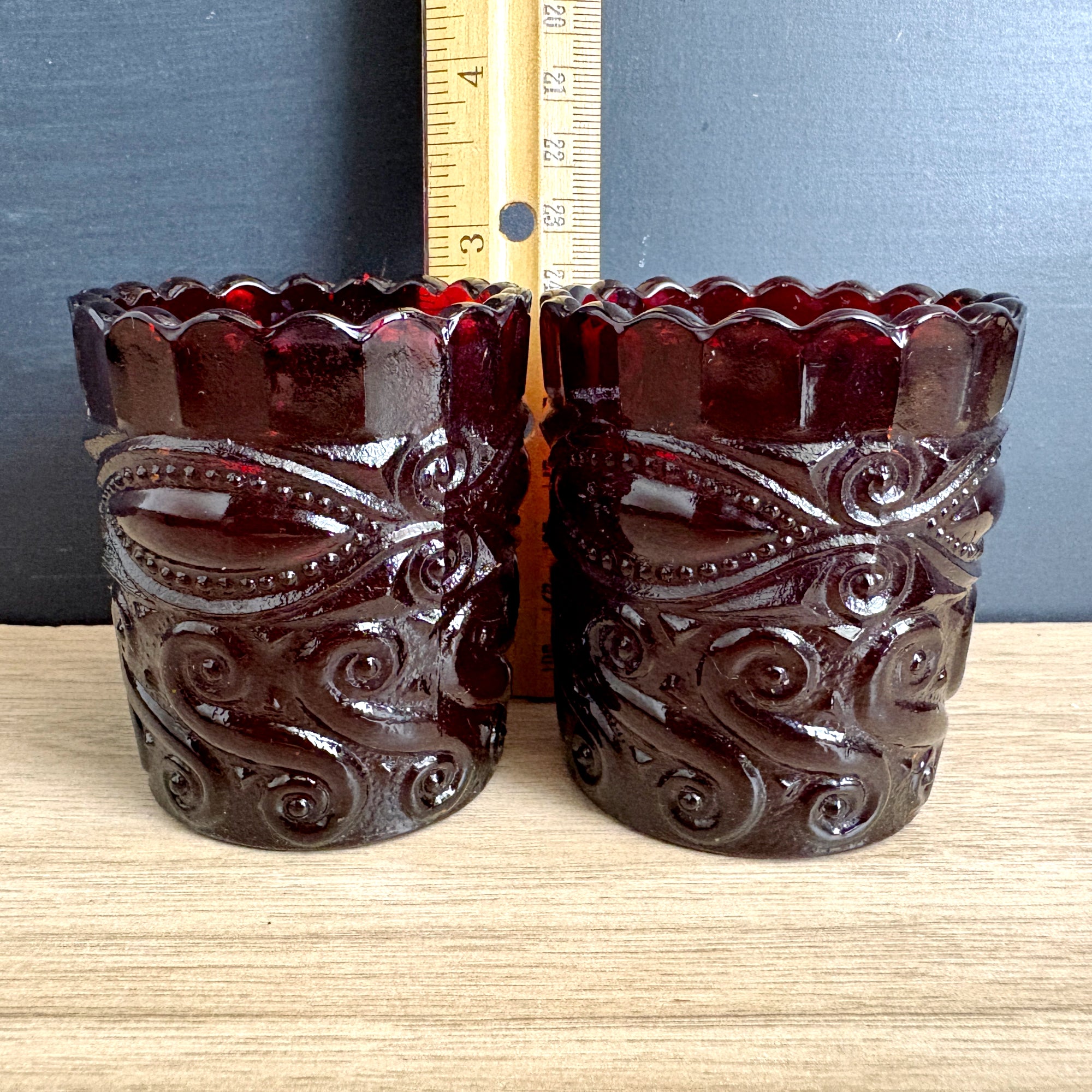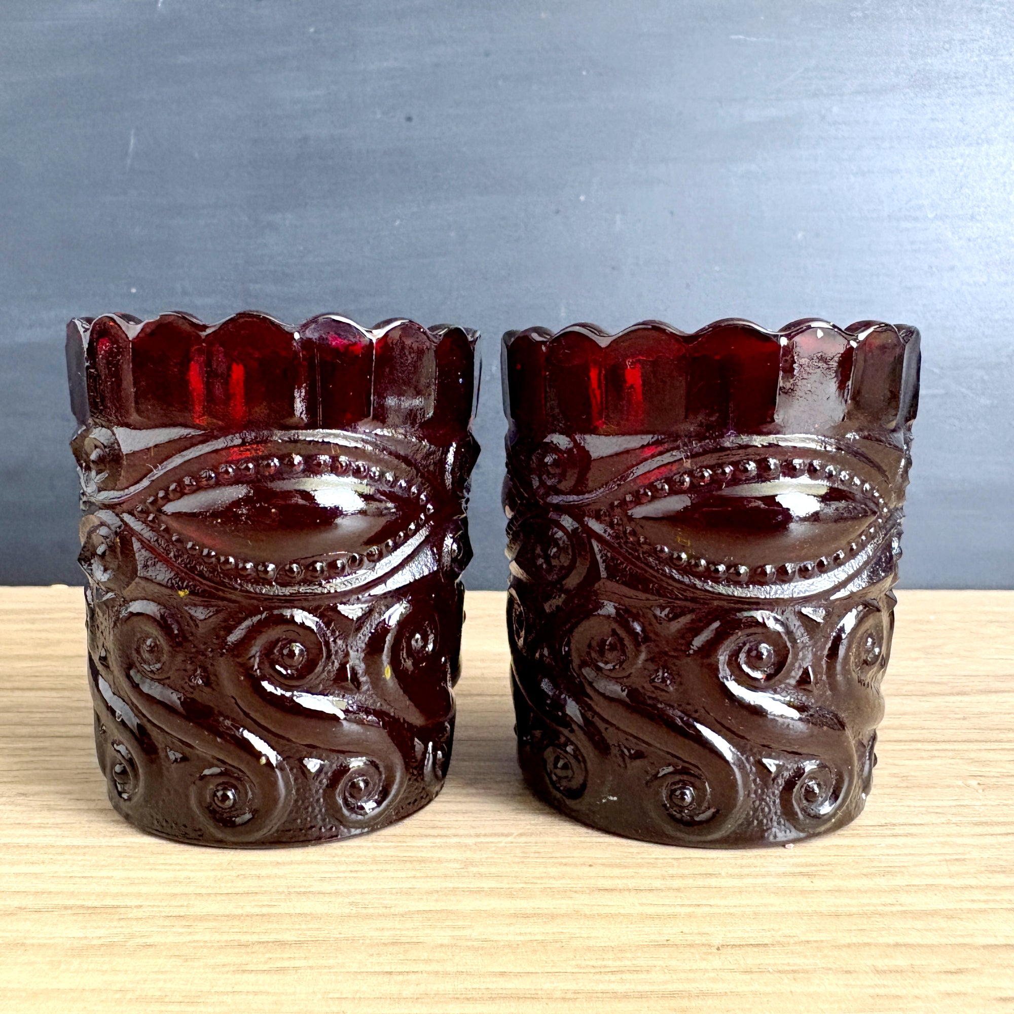 Pair of vintage Mosser Eyewinker toothpick holders in ruby red. Perfectly sized for a tealight. Glows yellow under UV light, likely because of selenium in the glass. These are unmarked on the base.