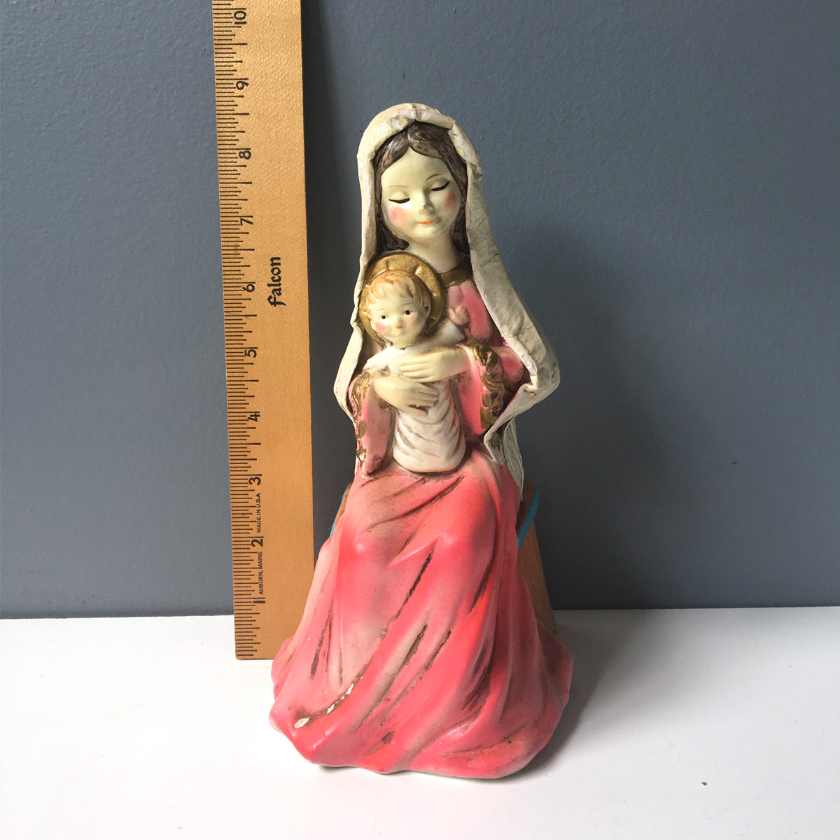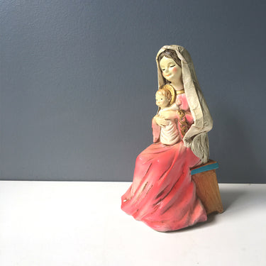 Vintage 1960s papier mache figure of Mary holding baby Jesus. Painted in bright colors, a true mid century Christmas decoration.