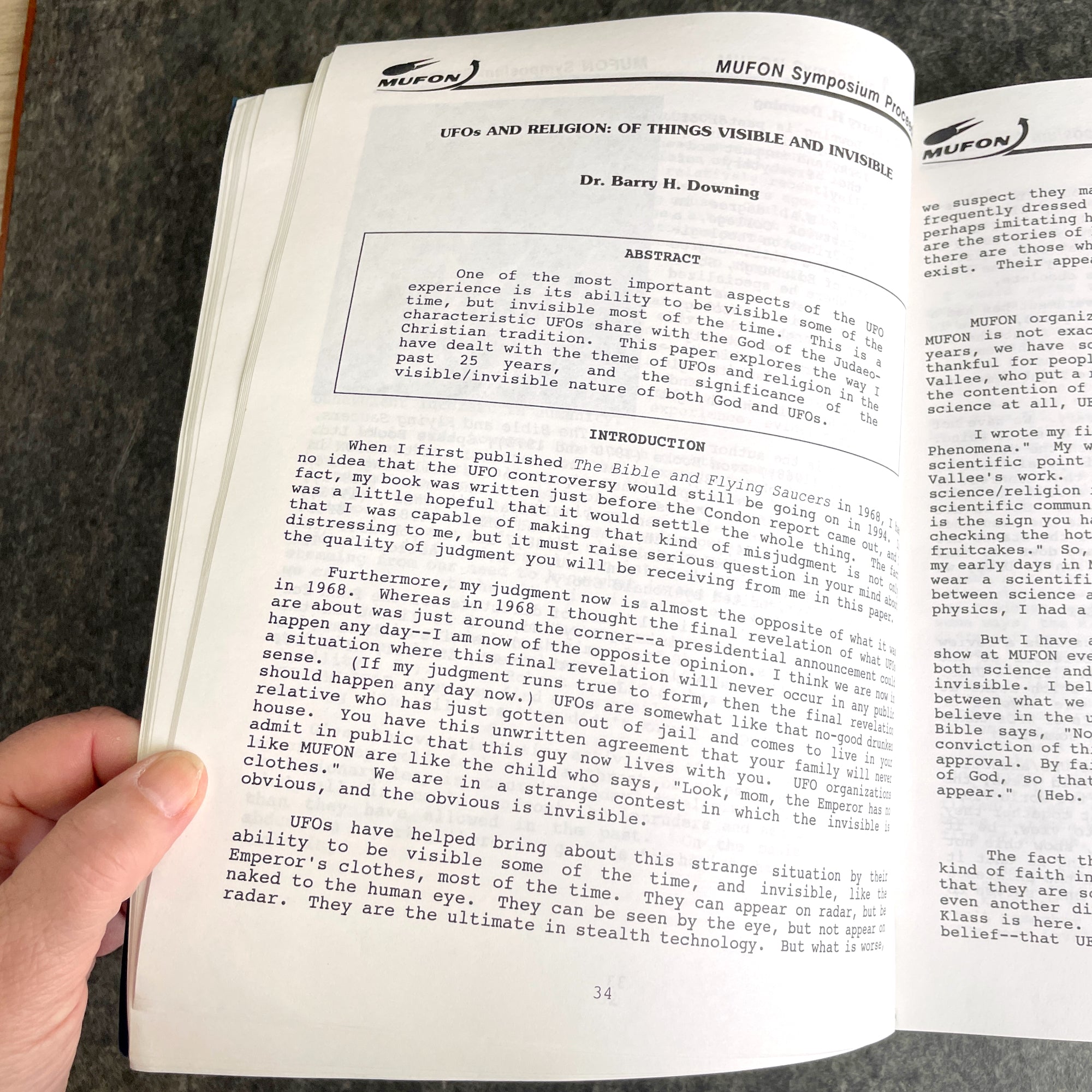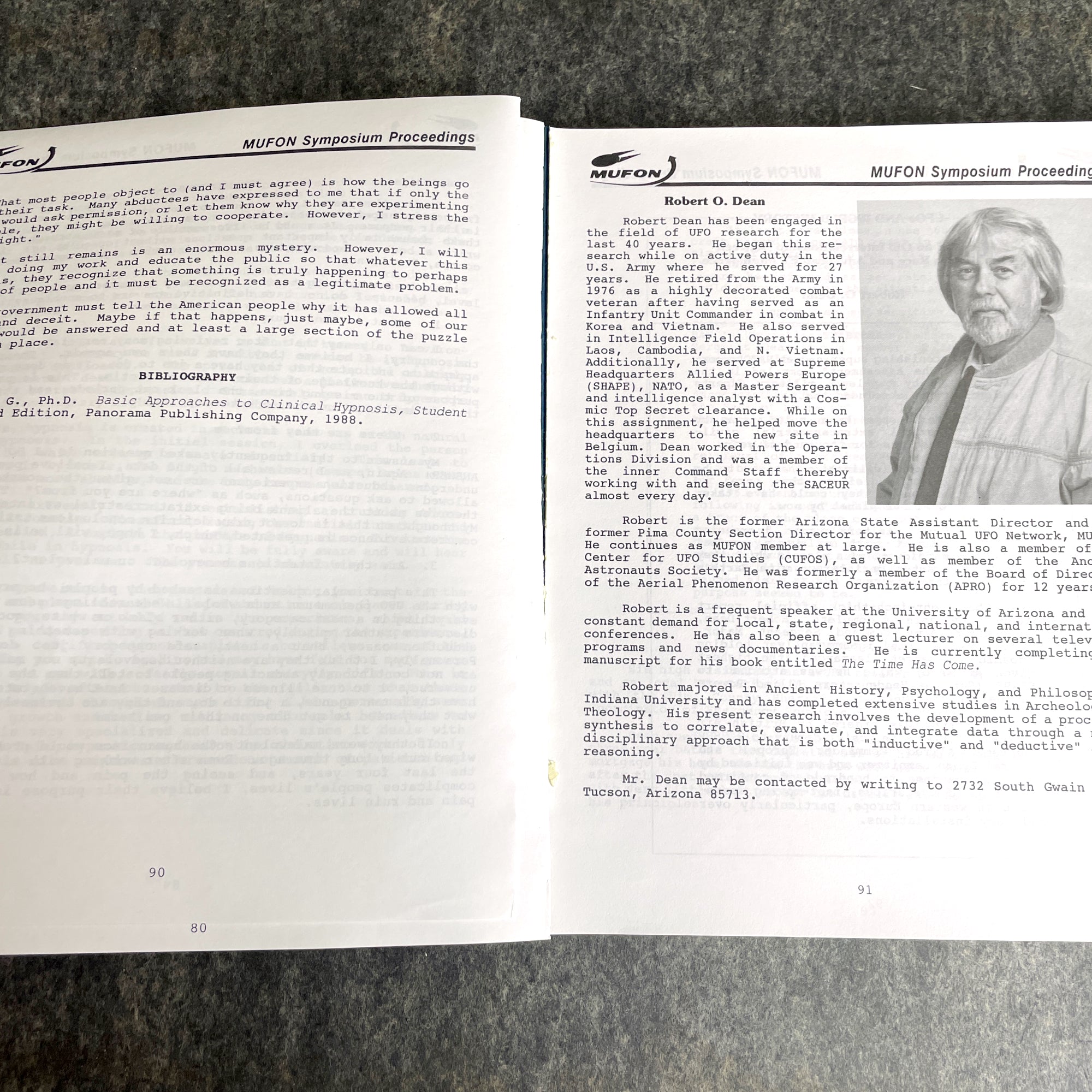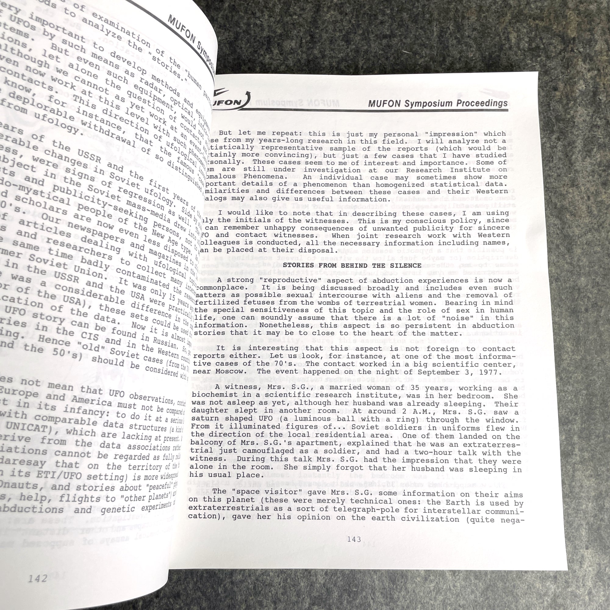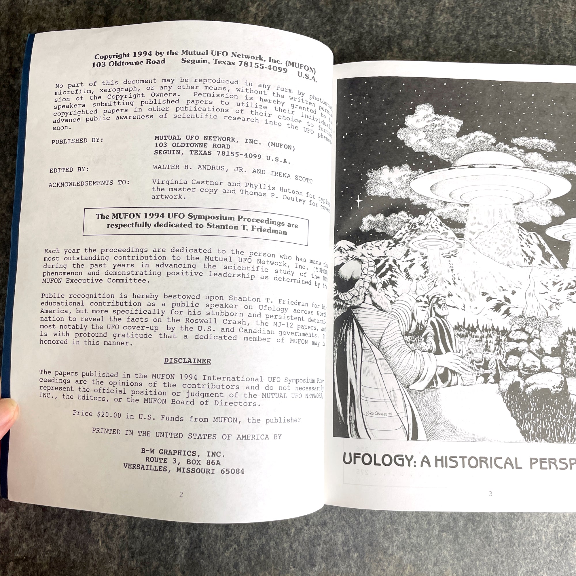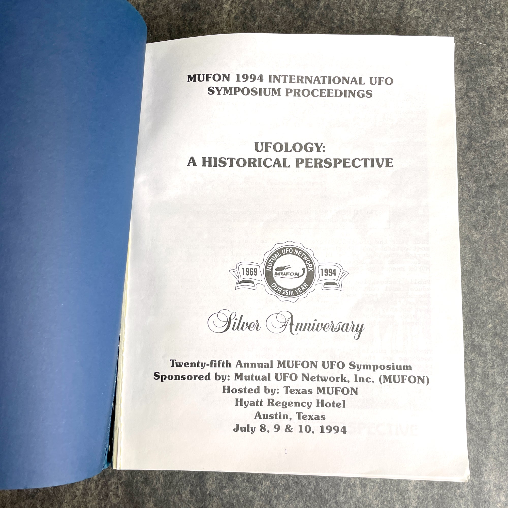 "MUFON: 1994 International UFO Symposium Proceedings," edited by Walter Andrus Jr. and Irena Scott. Notes from the 25th anniversary of the Mutual UFO Network (MUFON). Subtitled "Ufology: A Historical Perspective. Paper cover.