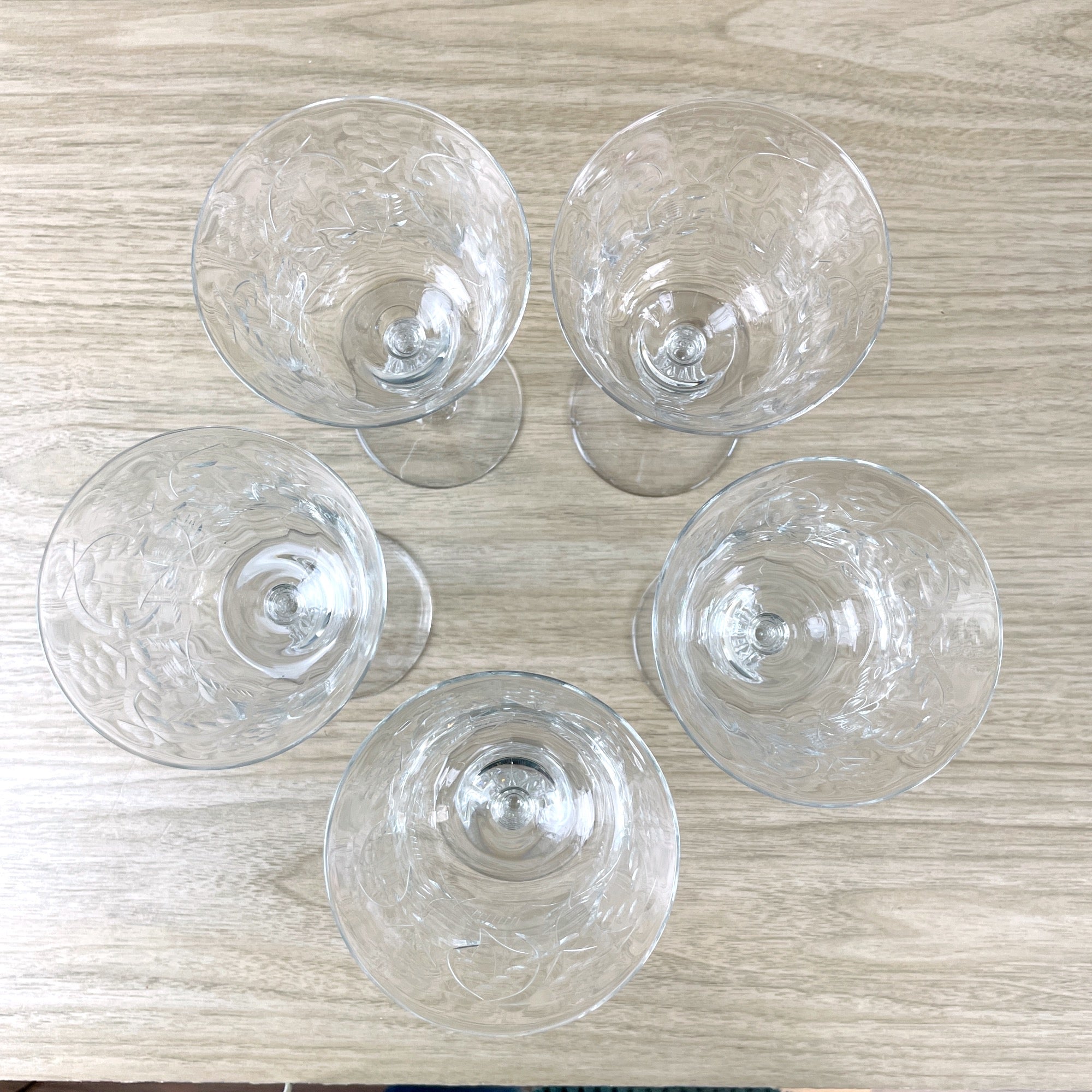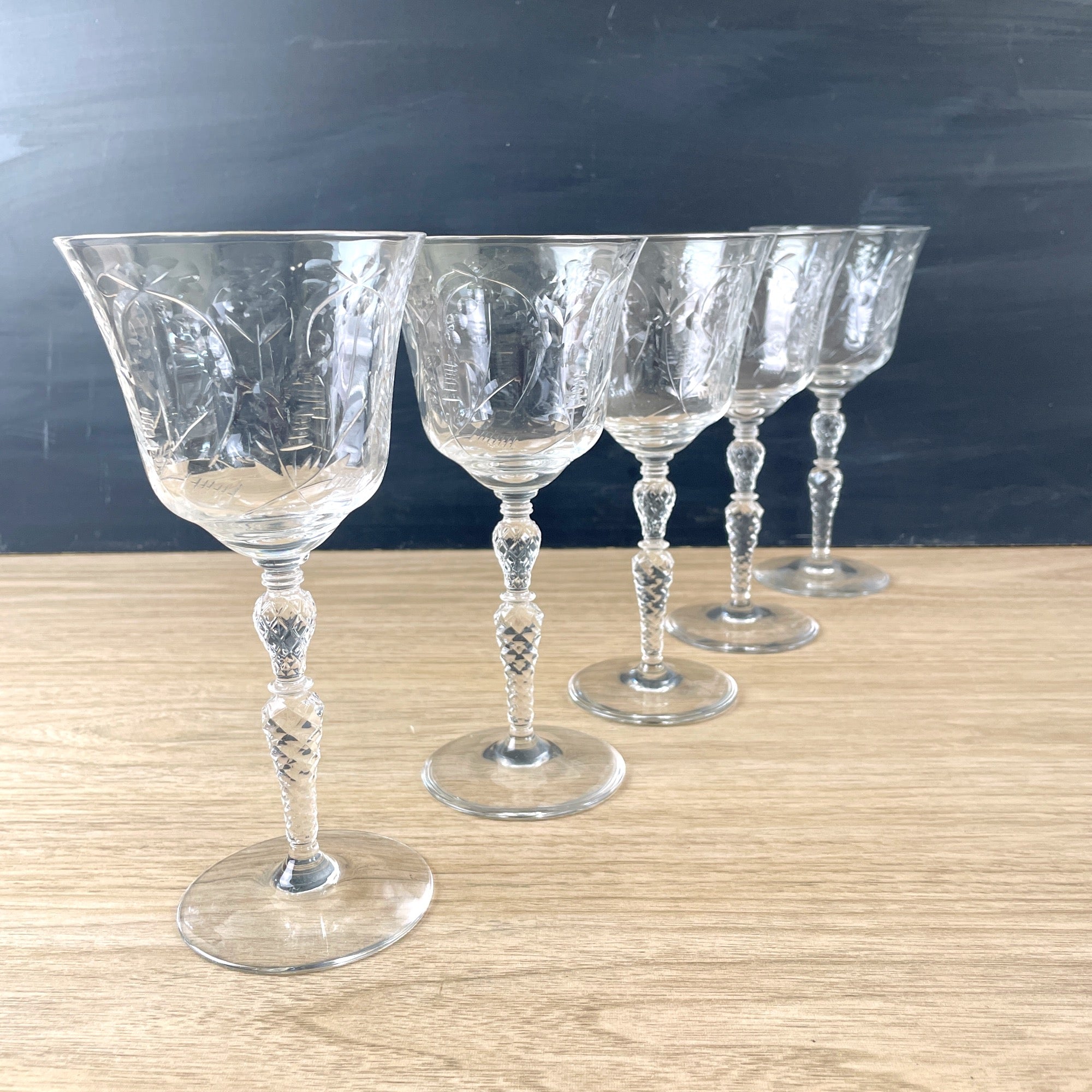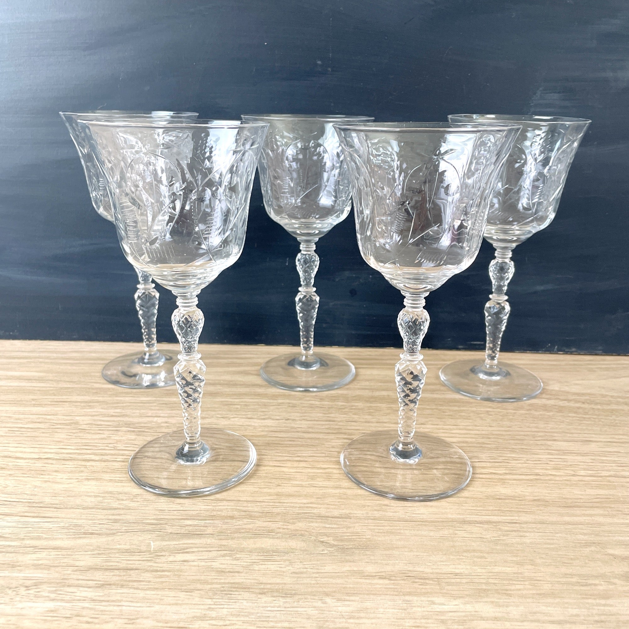 5 water glasses made by Libbey Glass in the Rock Sharpe line, Mystic pattern. Polished finish, hand blown with applied faceted stem. Made in the 1940s