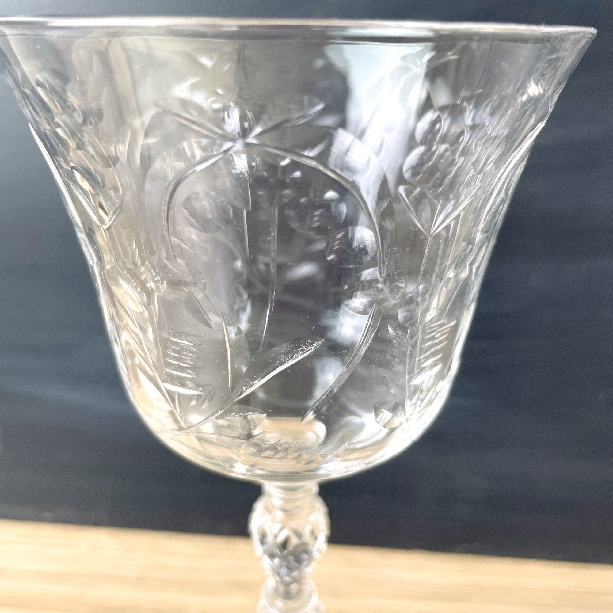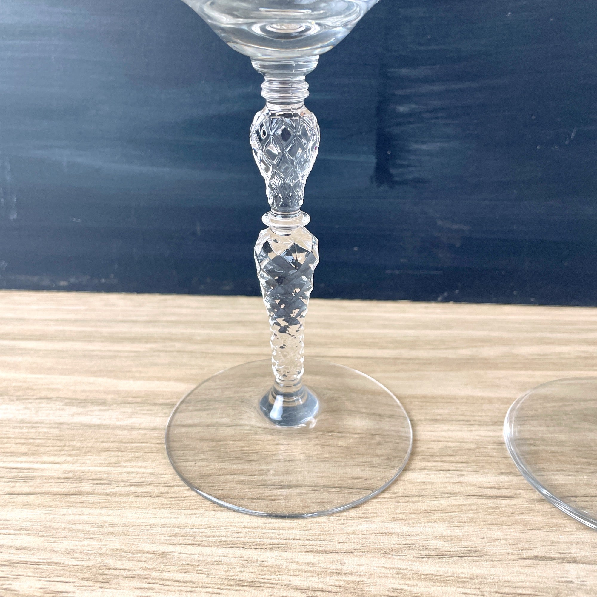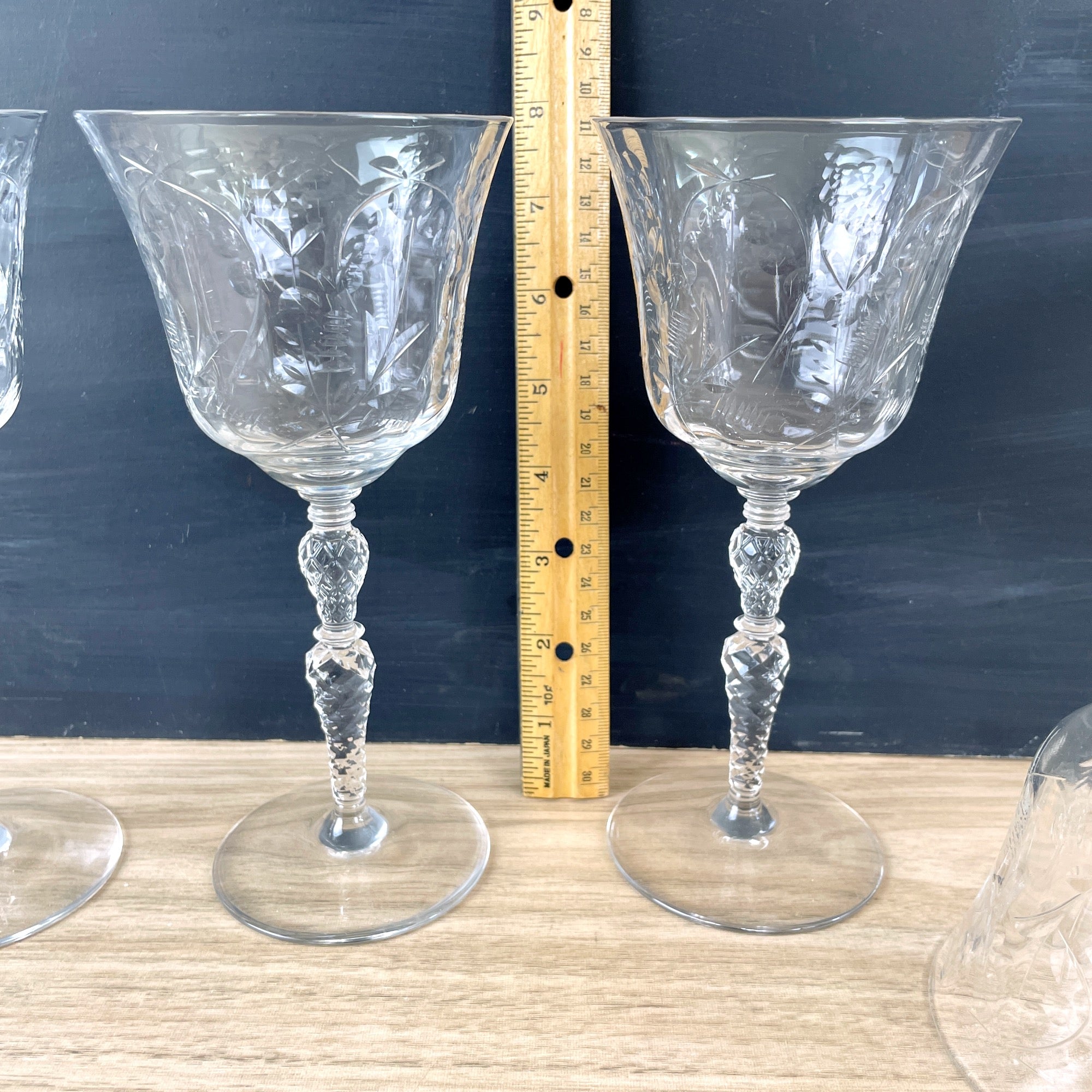 5 water glasses made by Libbey Glass in the Rock Sharpe line, Mystic pattern. Polished finish, hand blown with applied faceted stem. Made in the 1940s