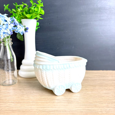 Adorable Napco white and baby blue planter is shaped like a vintage baby buggy. Could be used to hold baby's ointments, lotions and potions. Vintage florist's planter from the 1960s would also make a great baby shower favor or decor.