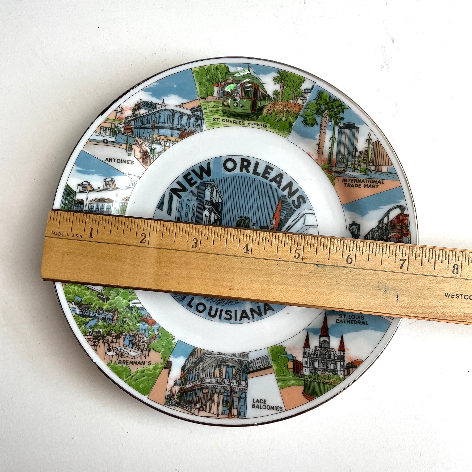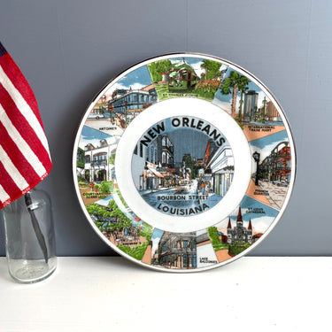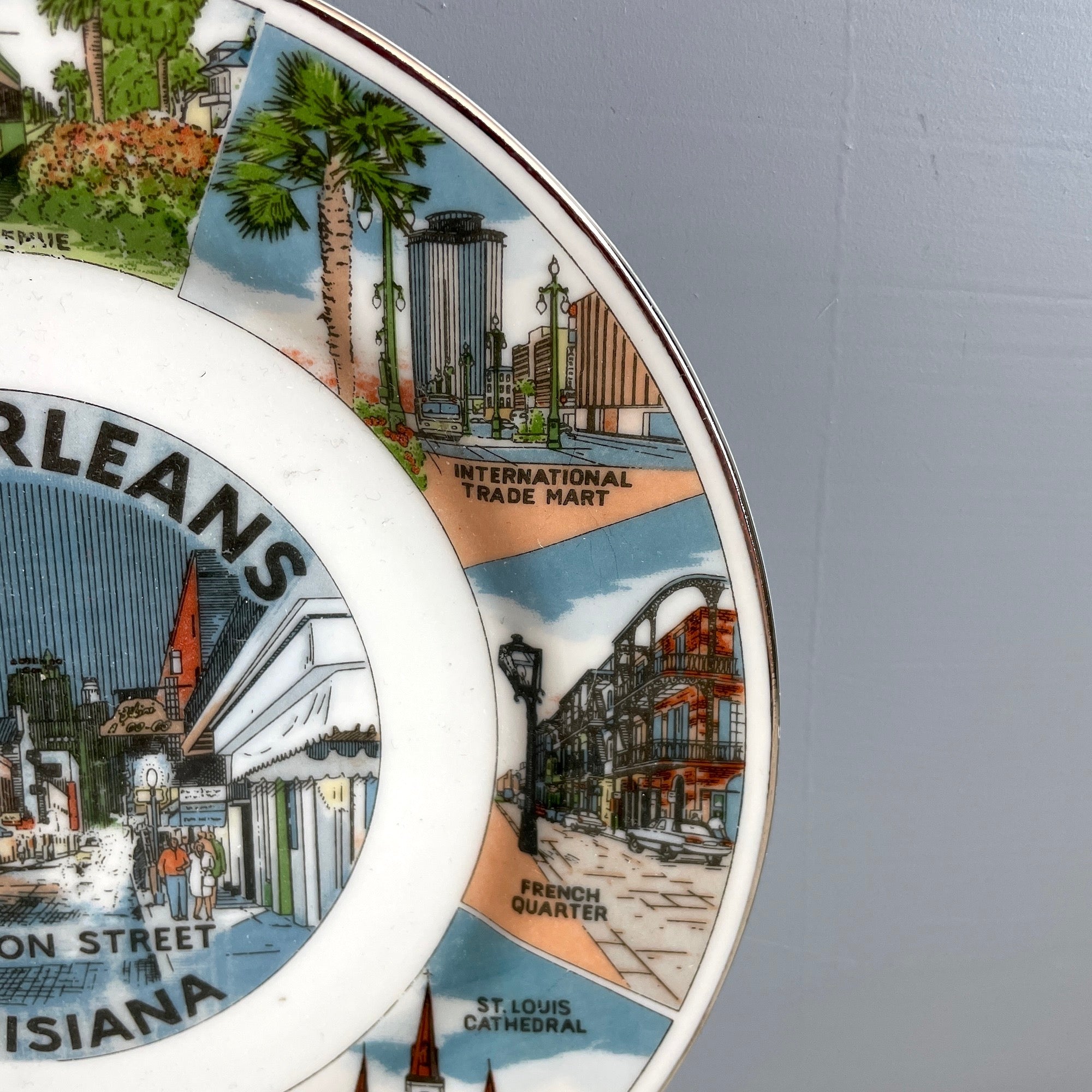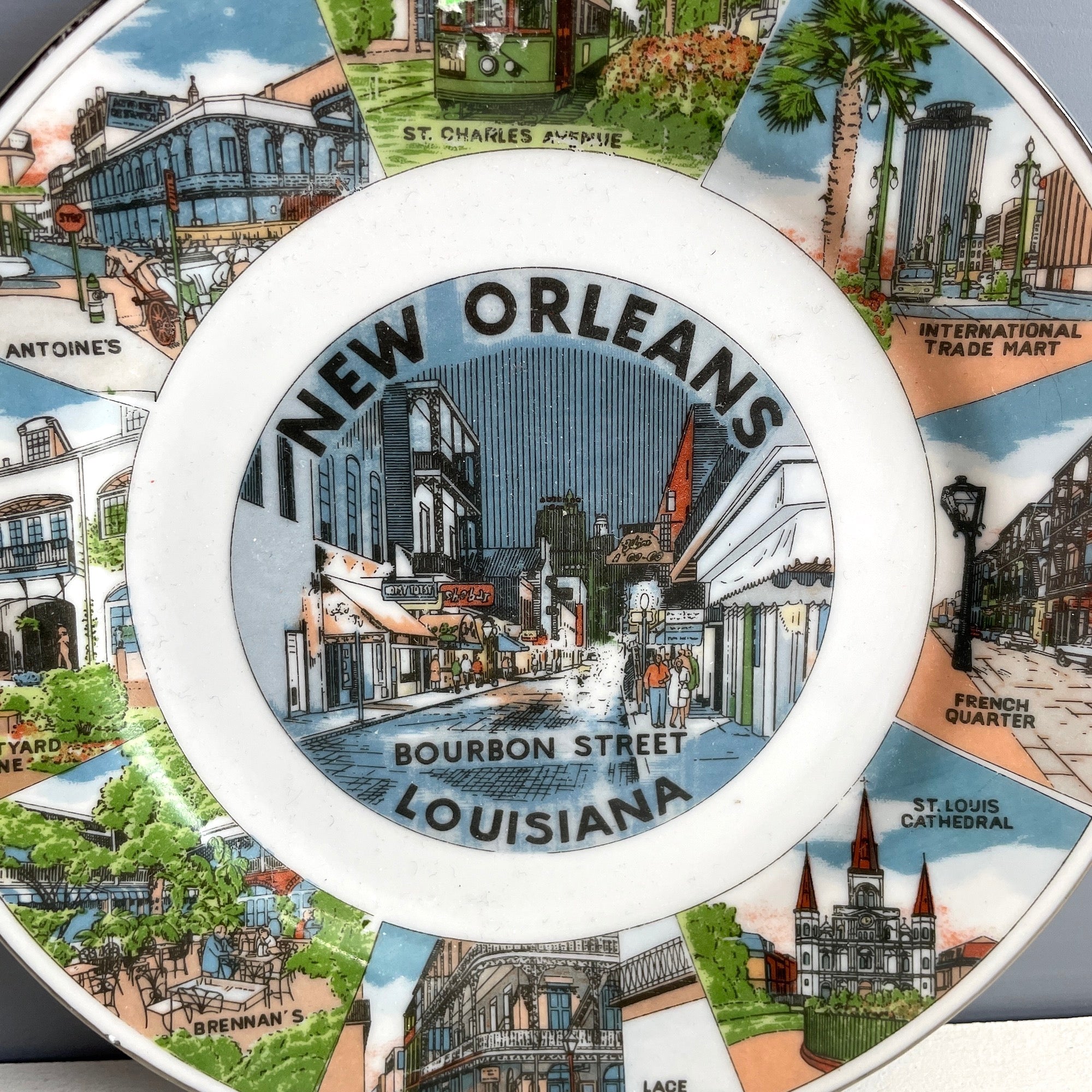 Vintage New Orleans souvenir plate. White plate with silver band around the outside and colorful New Orleans images surrounding a center image of Bourbon Street. Includes St. Charles Avenue, International Trade Mart, French Quarter, St. Louis Cathedral, Lace Balconies, Brennan's, Courtyard Scene and Antoine's.