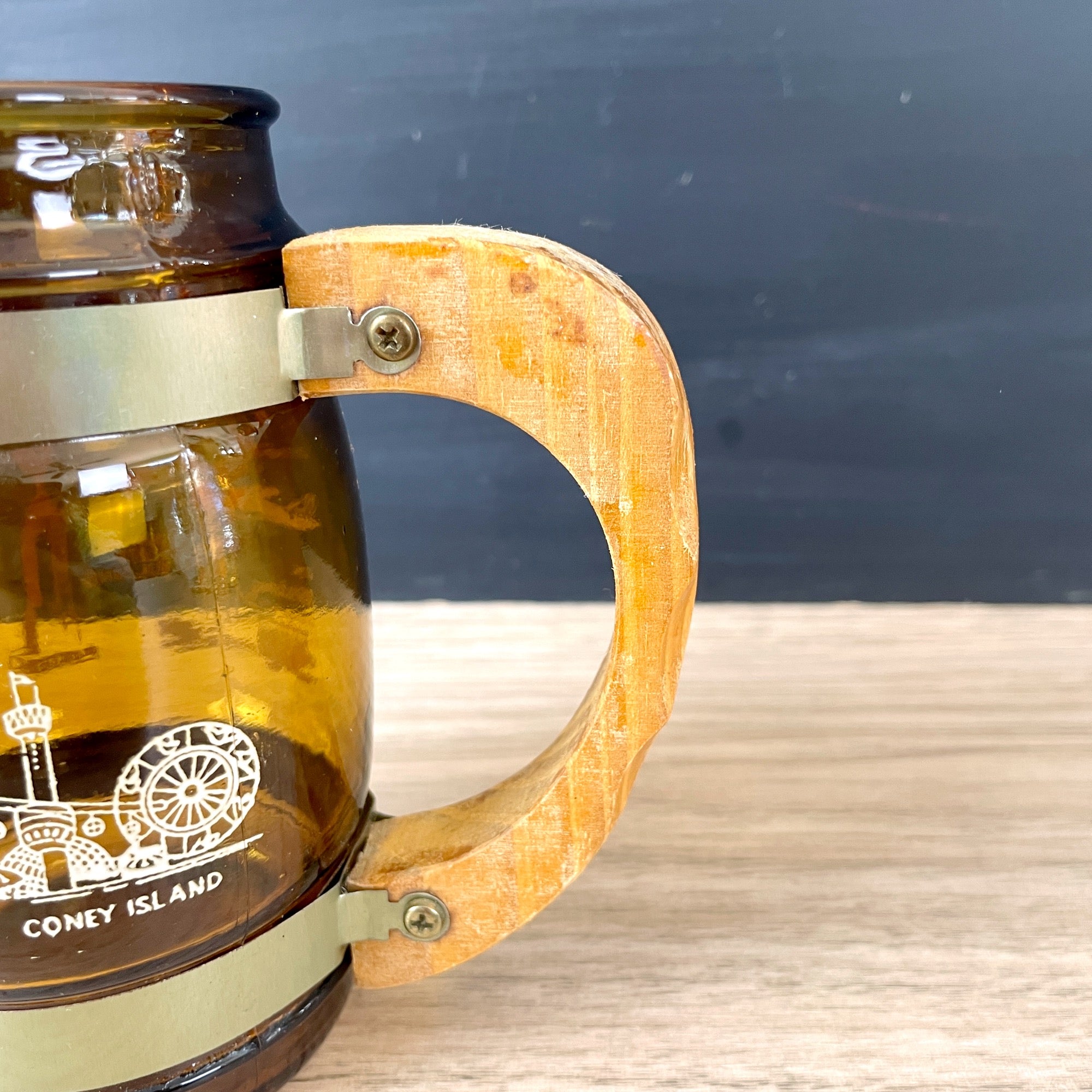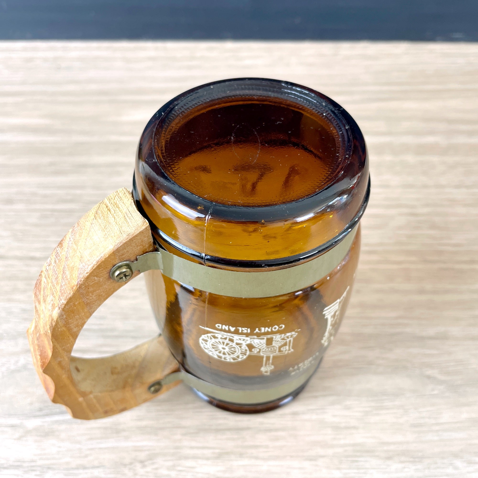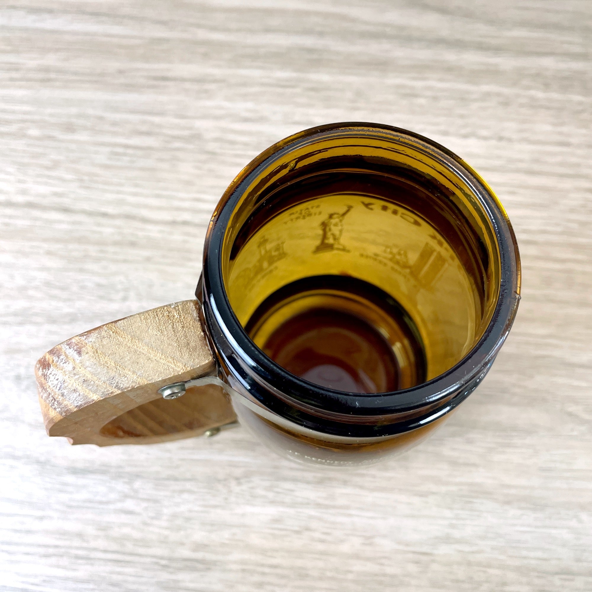 New York City printed amber glass souvenir mug with wooden handle - 1970s vintage