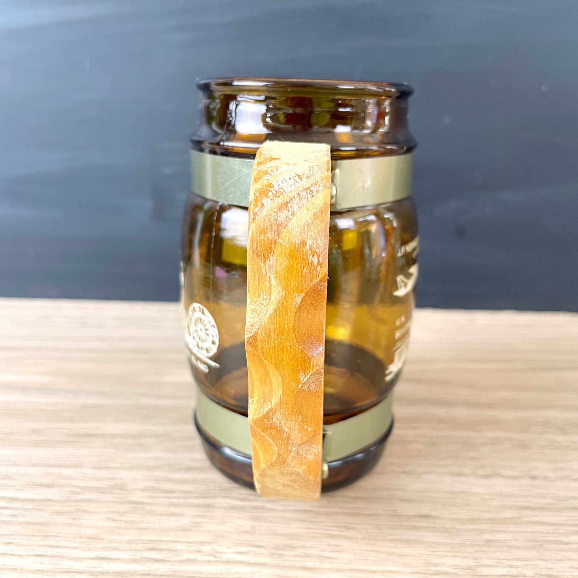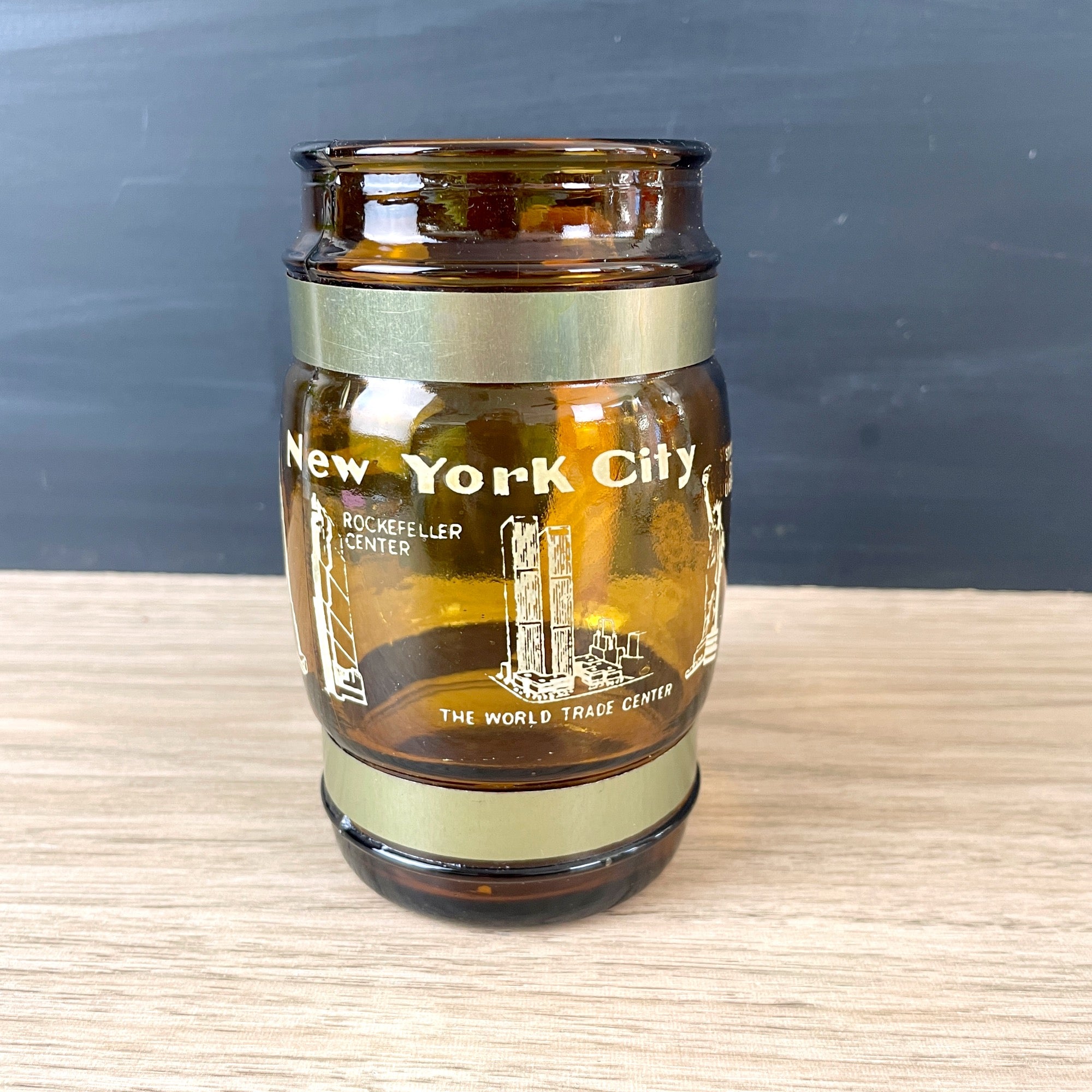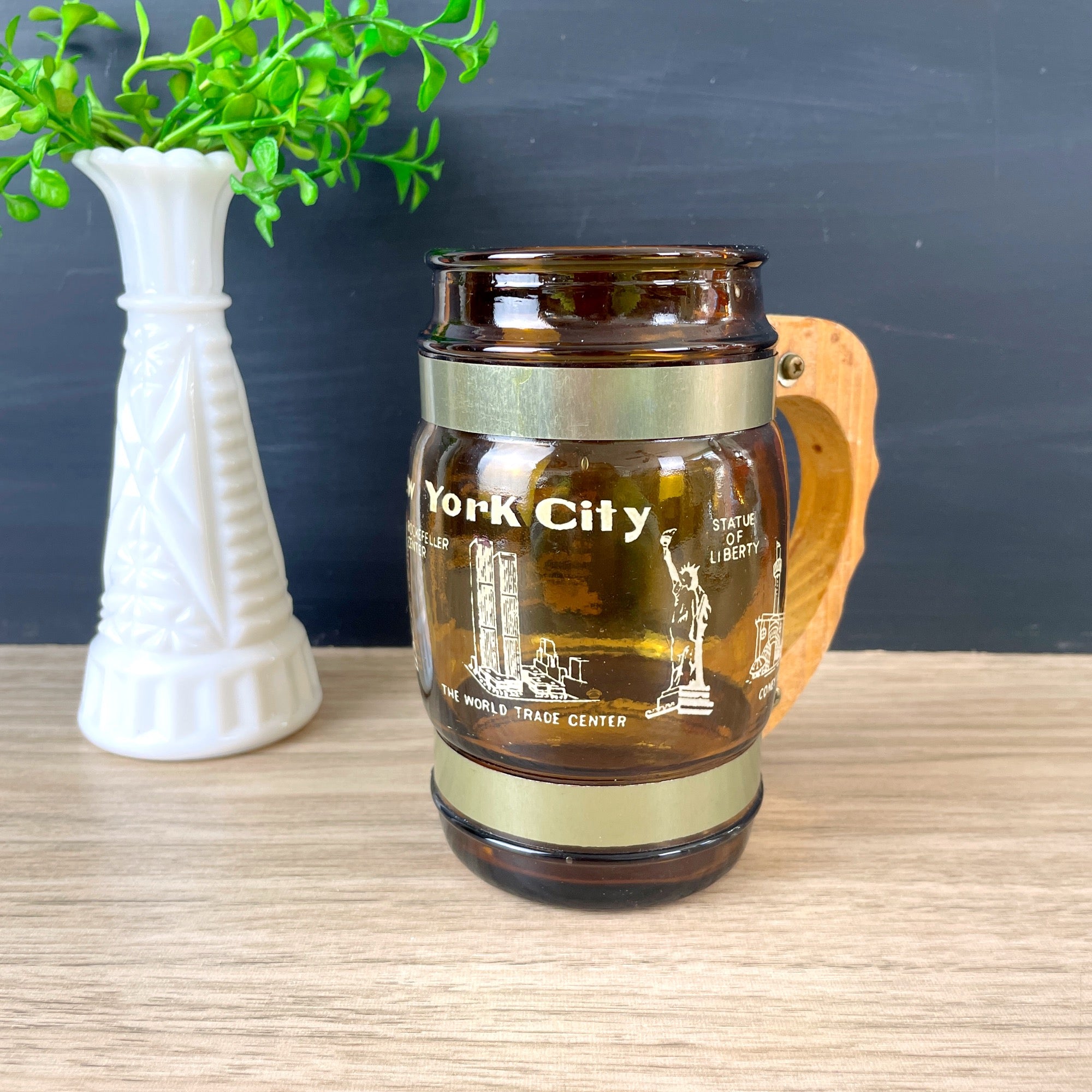 Vintage 1970s New York City souvenir mug with printed images of J.F. Kennedy Airport / La Guardia Airport, U.N. Building, Empire State Building, Rockefeller Center, the World Trade Center, Statue of Liberty and Coney Island. Amber glass with two metal bands attaching a wooden handle.