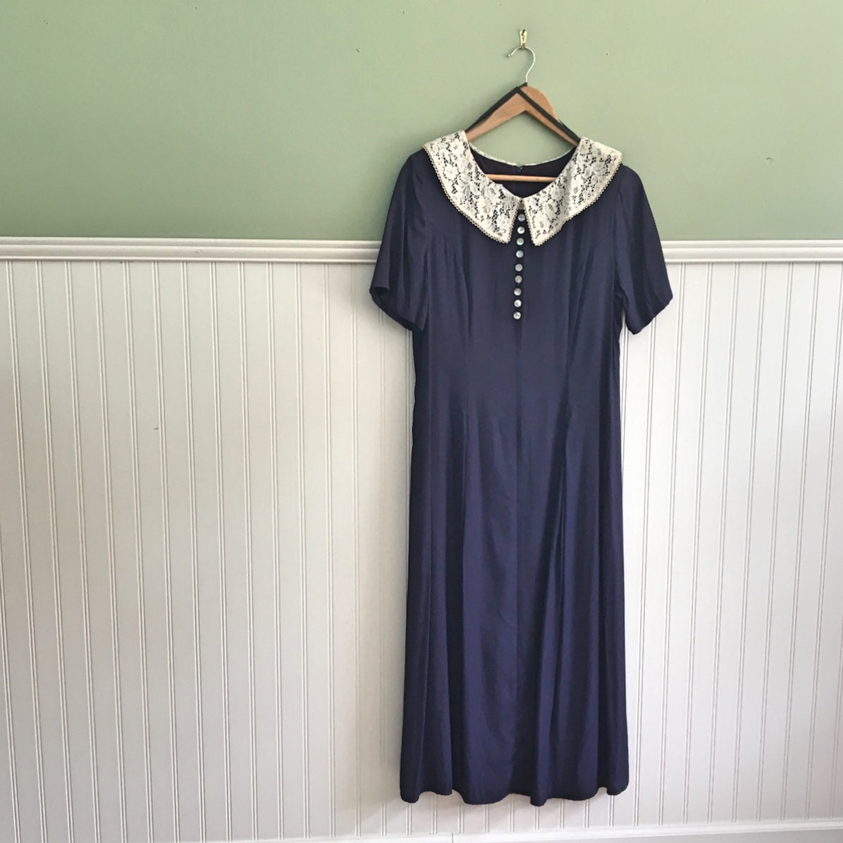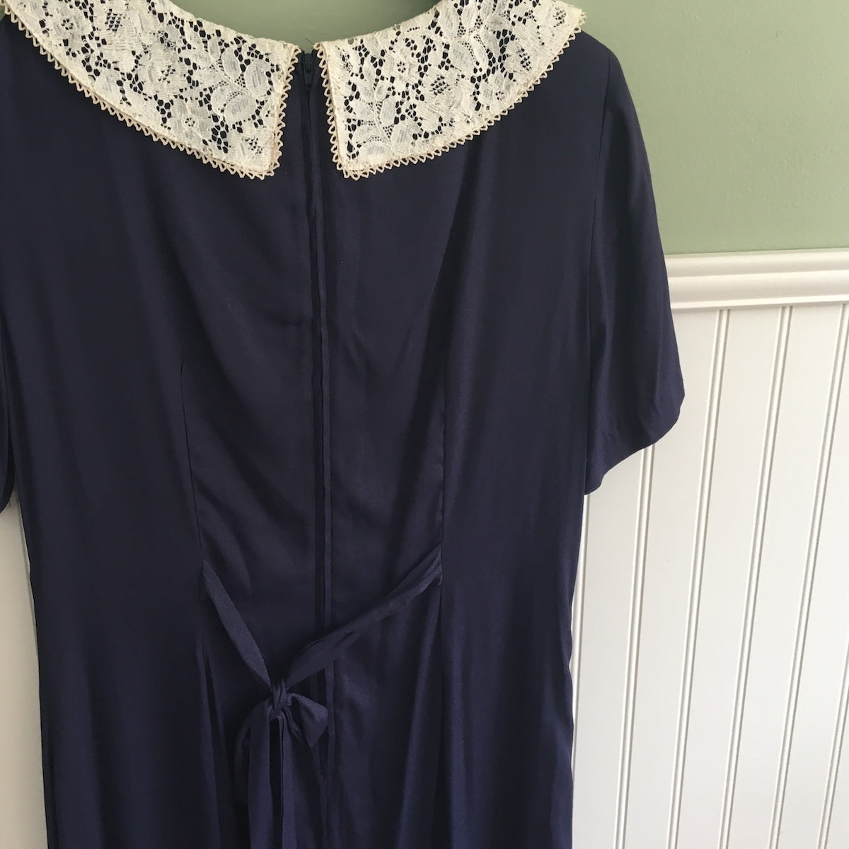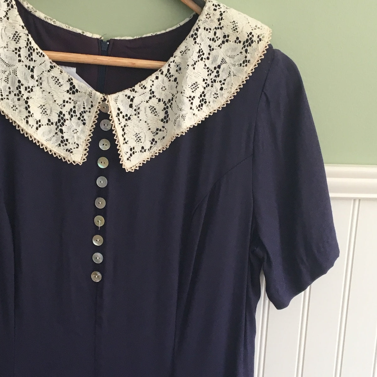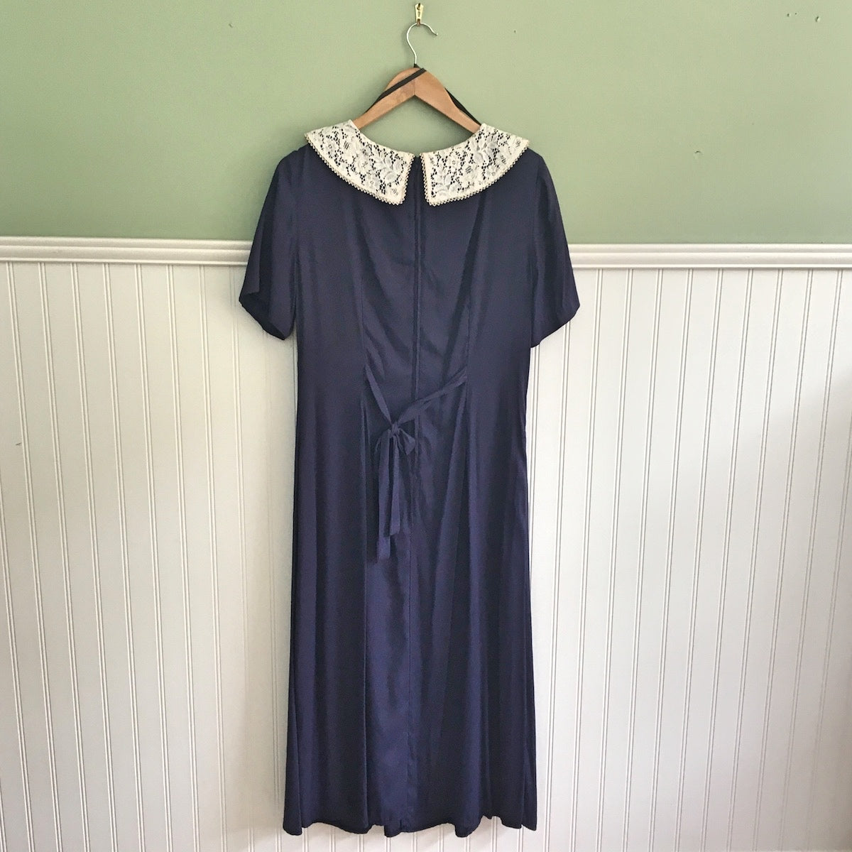 Vintage 1980s dress with ecru lace collar and decorative line of shell buttons down the front. Princess seams with pair of low pleats on the front and back to give the skirt some swirl. Sash from the side seam to the back for shaping. Back zipper. And nice plump shoulder pads. Inky midnight blue fabric with light body. Made in USA
