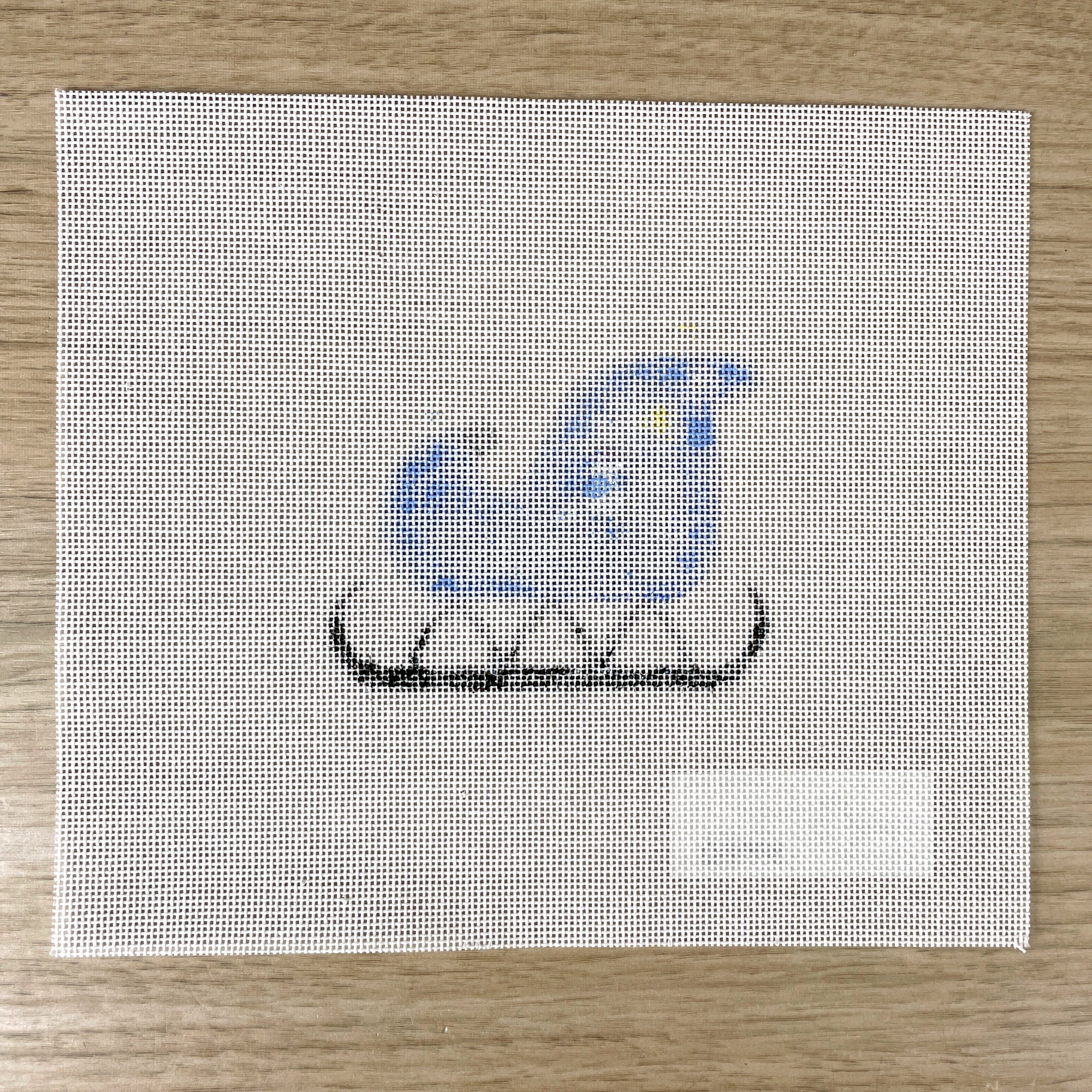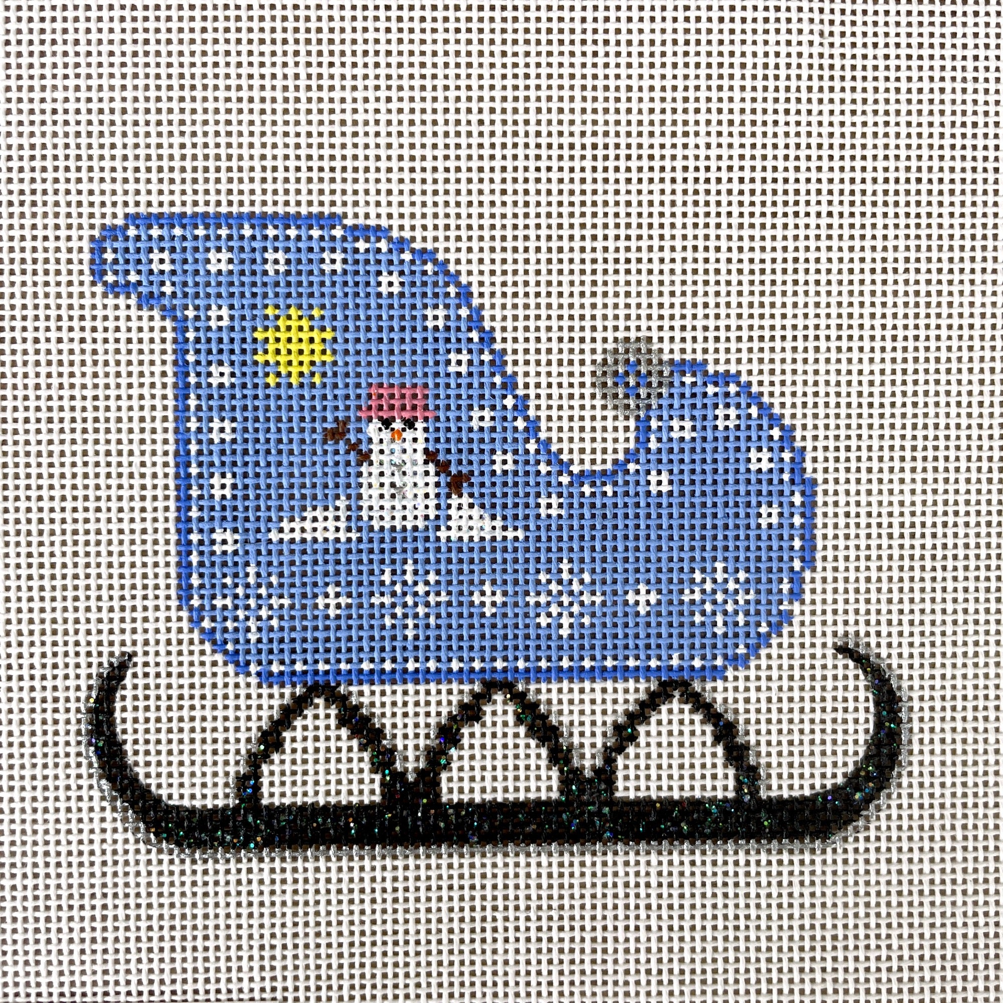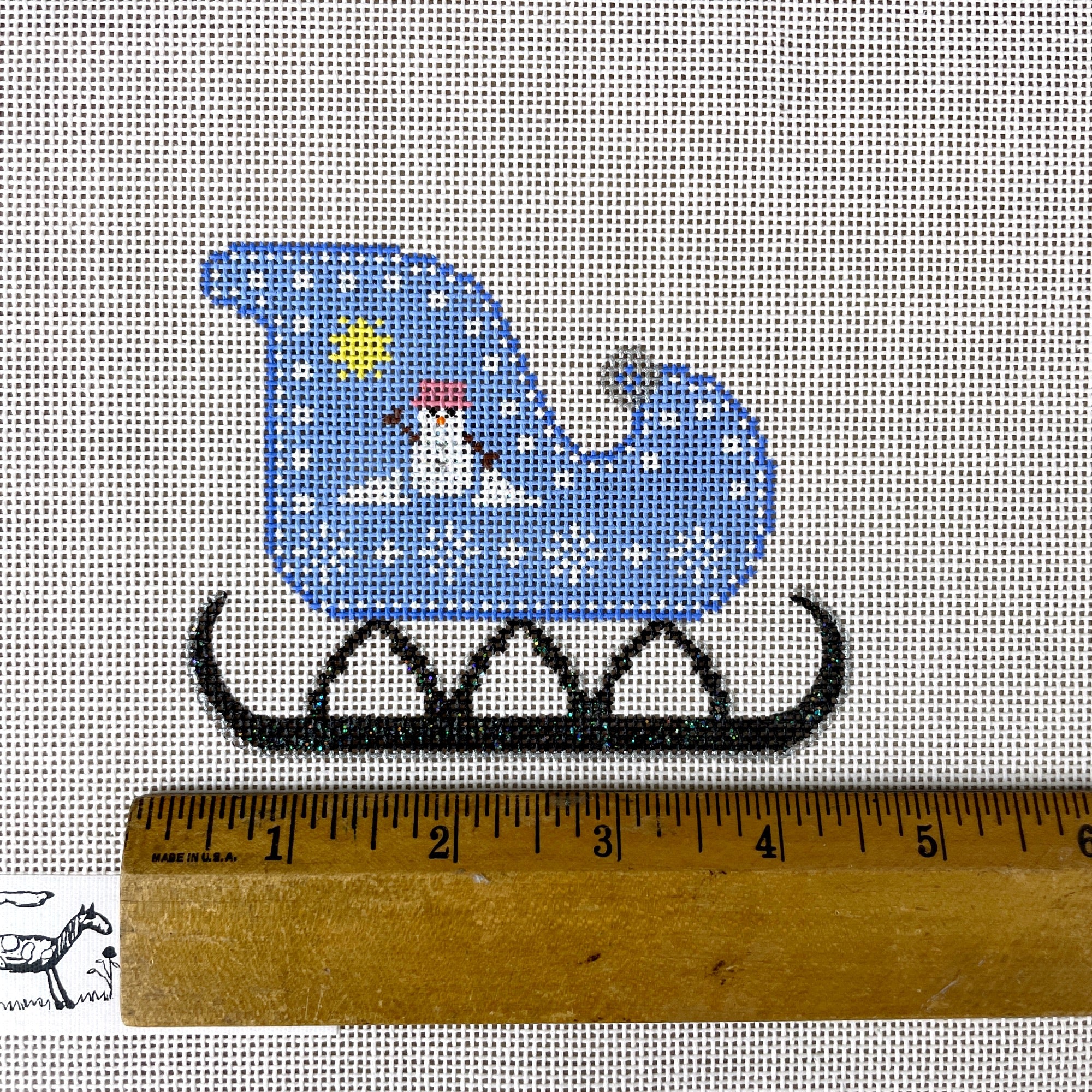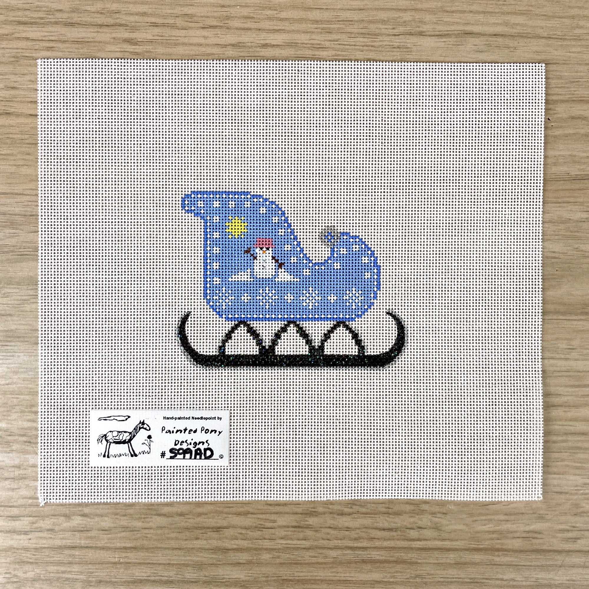 Handpainted needlepoint canvas of a light blue sleigh from Painted Pony Designs, #599AD. Retail $65.