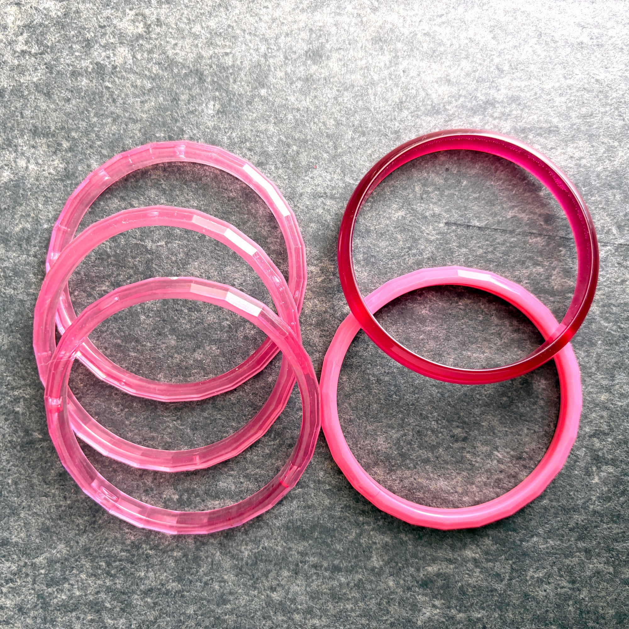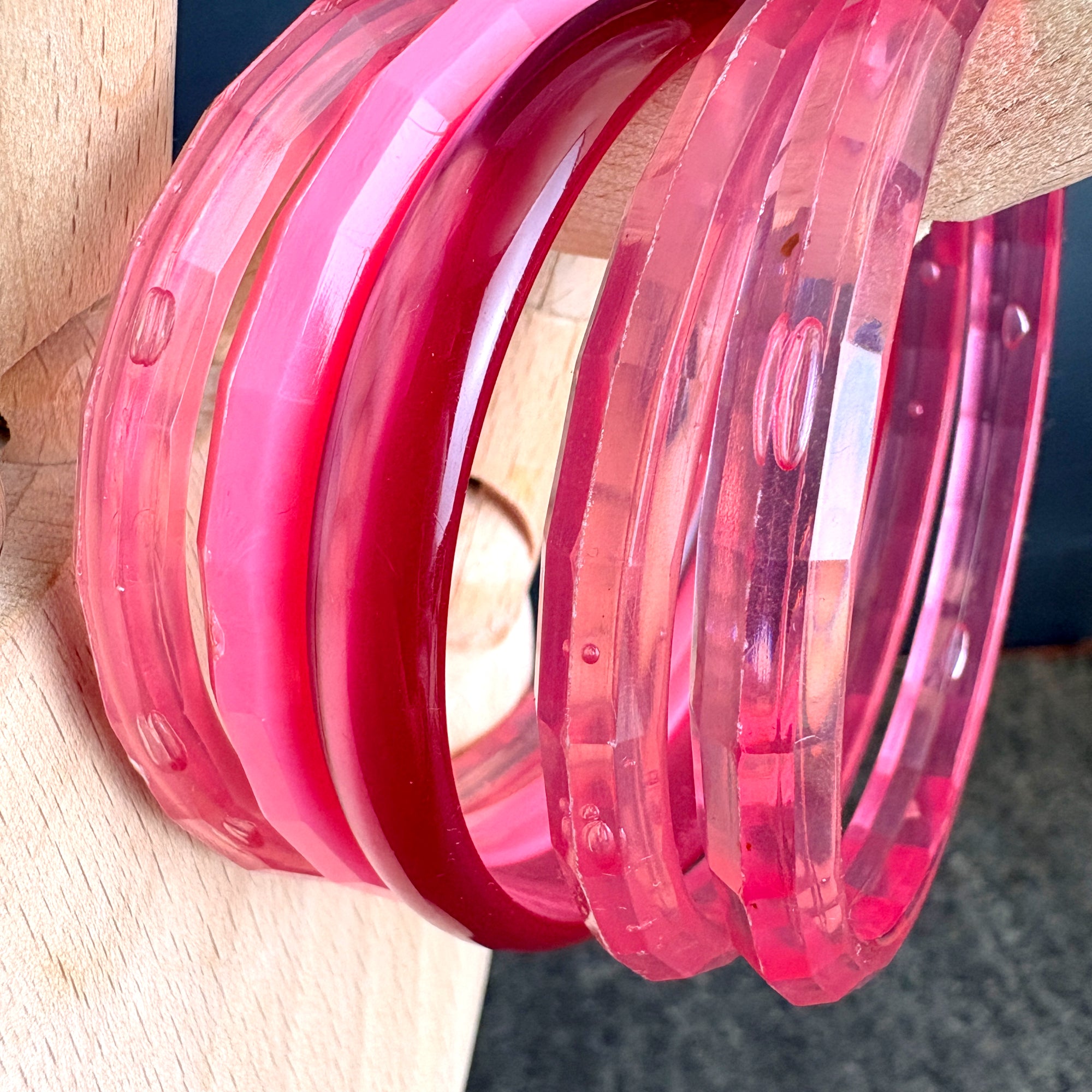 Set of 5 vintage 1960s dime store bangles in 3 shades of pretty give a Barbiecore vibe. Three are a translucent light pink with fabulous faceted texture (and those cool little bubbles from the molding process that make each one unique), one is a bold faceted coral pink, and one is a smooth moonglow cranberry pink beauty.