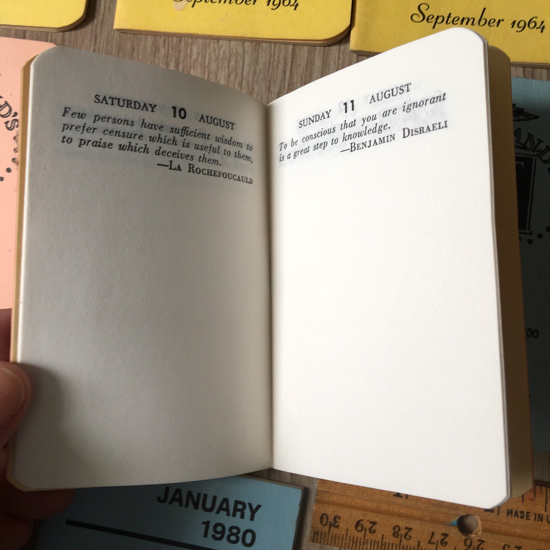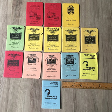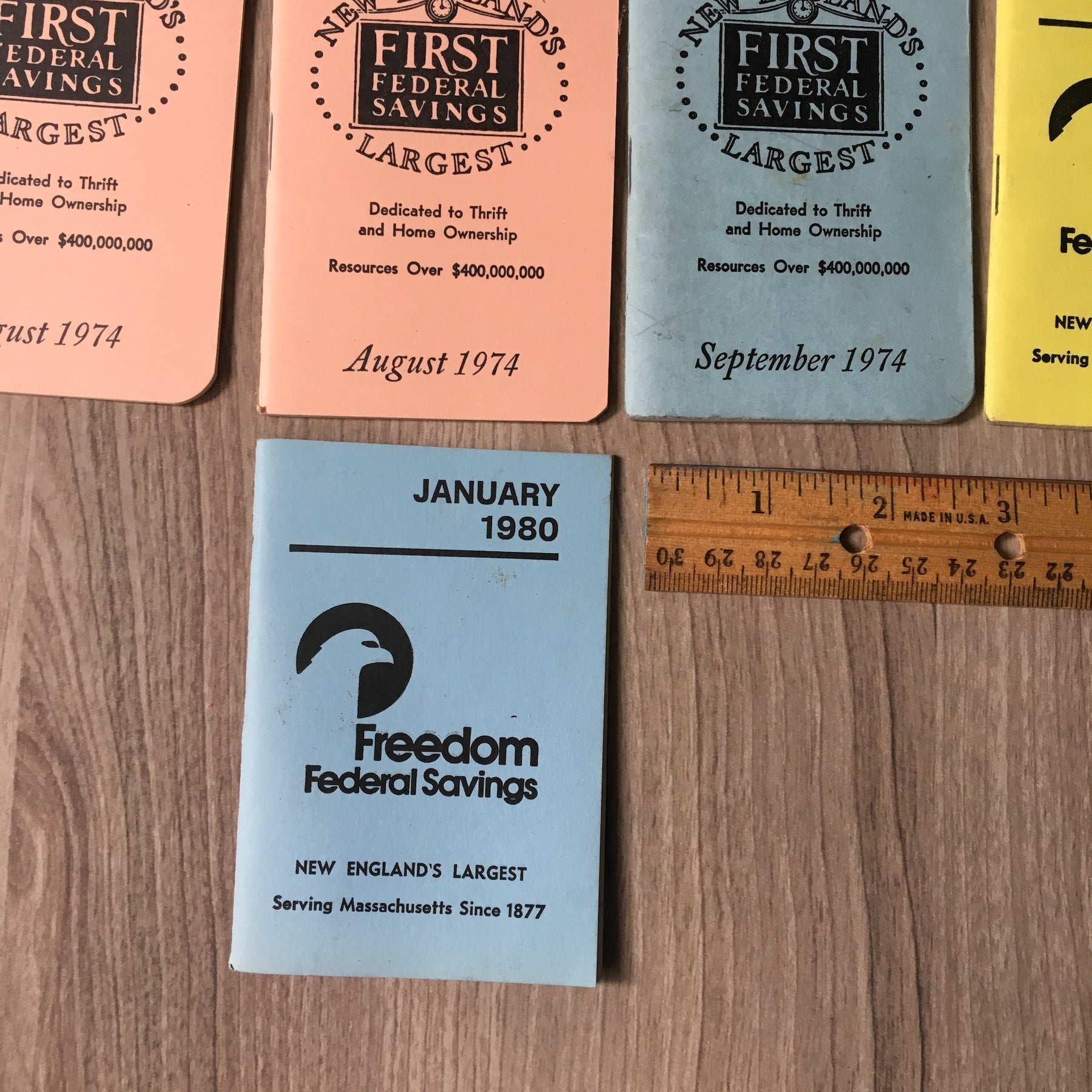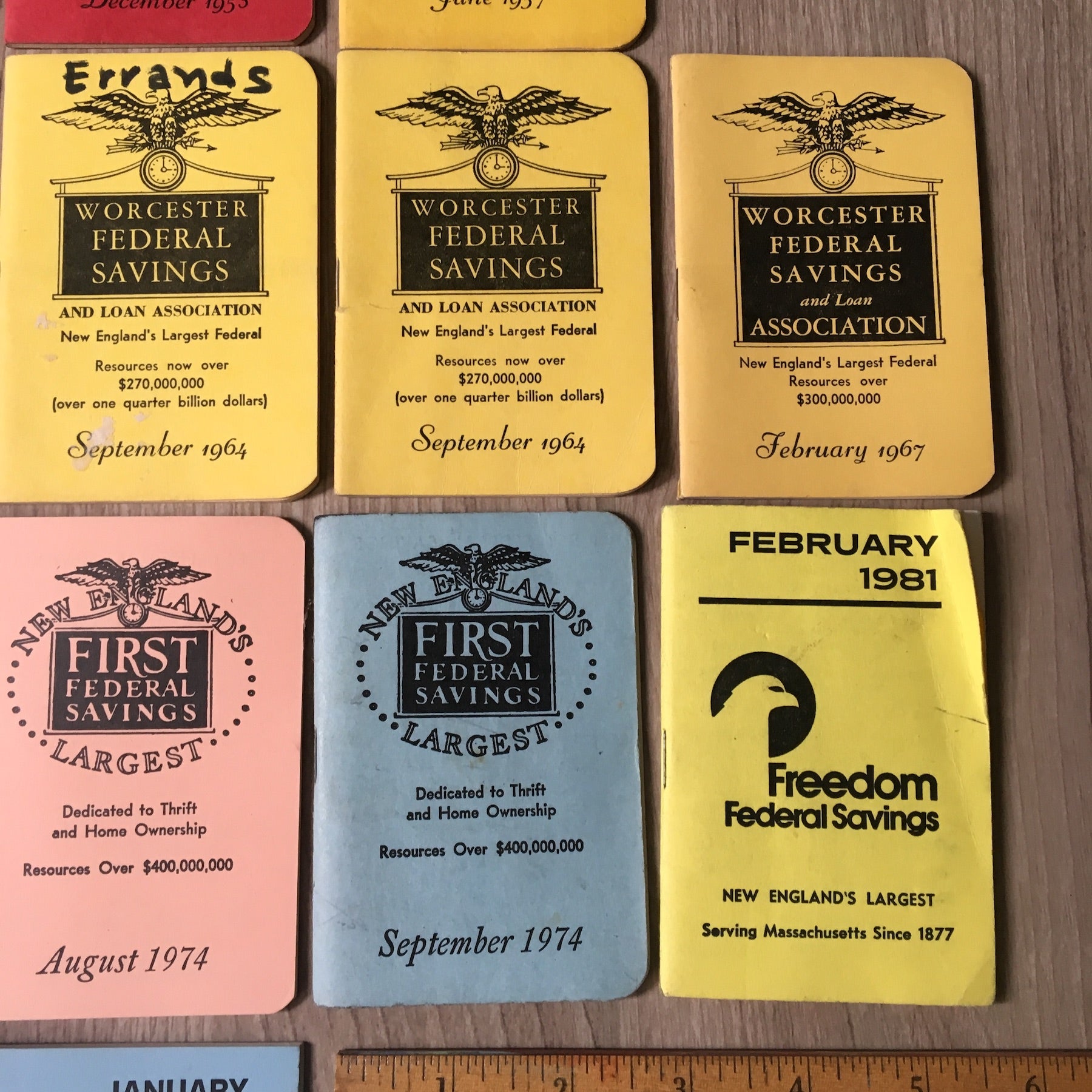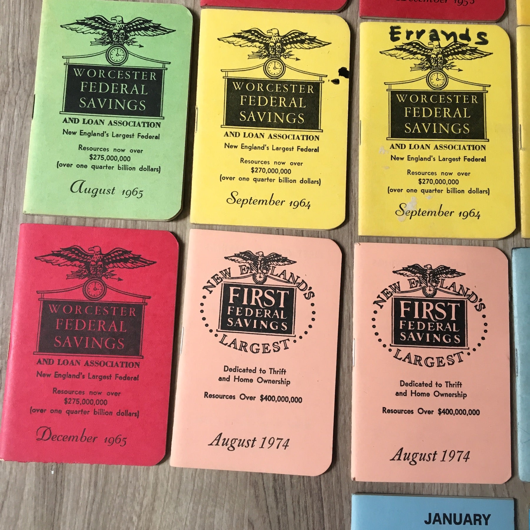 Lot of vintage savings bank monthly calendars from the 1950s-1980s. Tiny little journals you got each month with inspirational quotes, interesting facts and places to plan your time. Pocket size. From a mix of New England banks. Card stock covers with single staple binding. May have some writing inside.