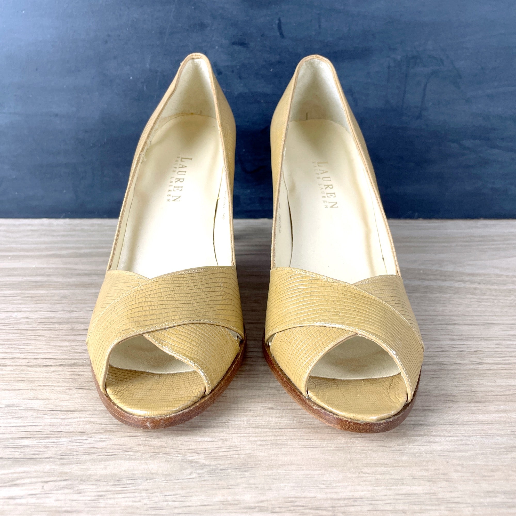 From the 1990s, Ralph Lauren Whelmina caramel tan lizard print peep toe heels. Leather upper, leather sole. Made in Spain.