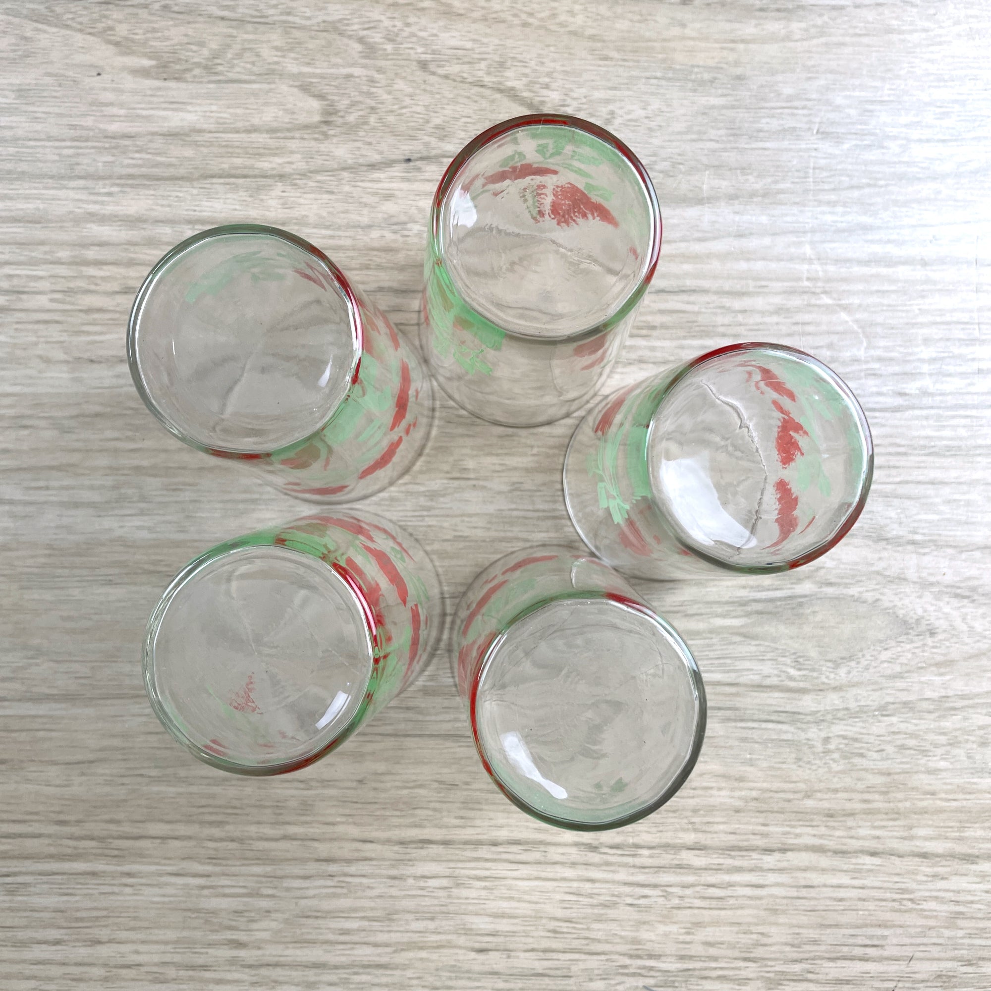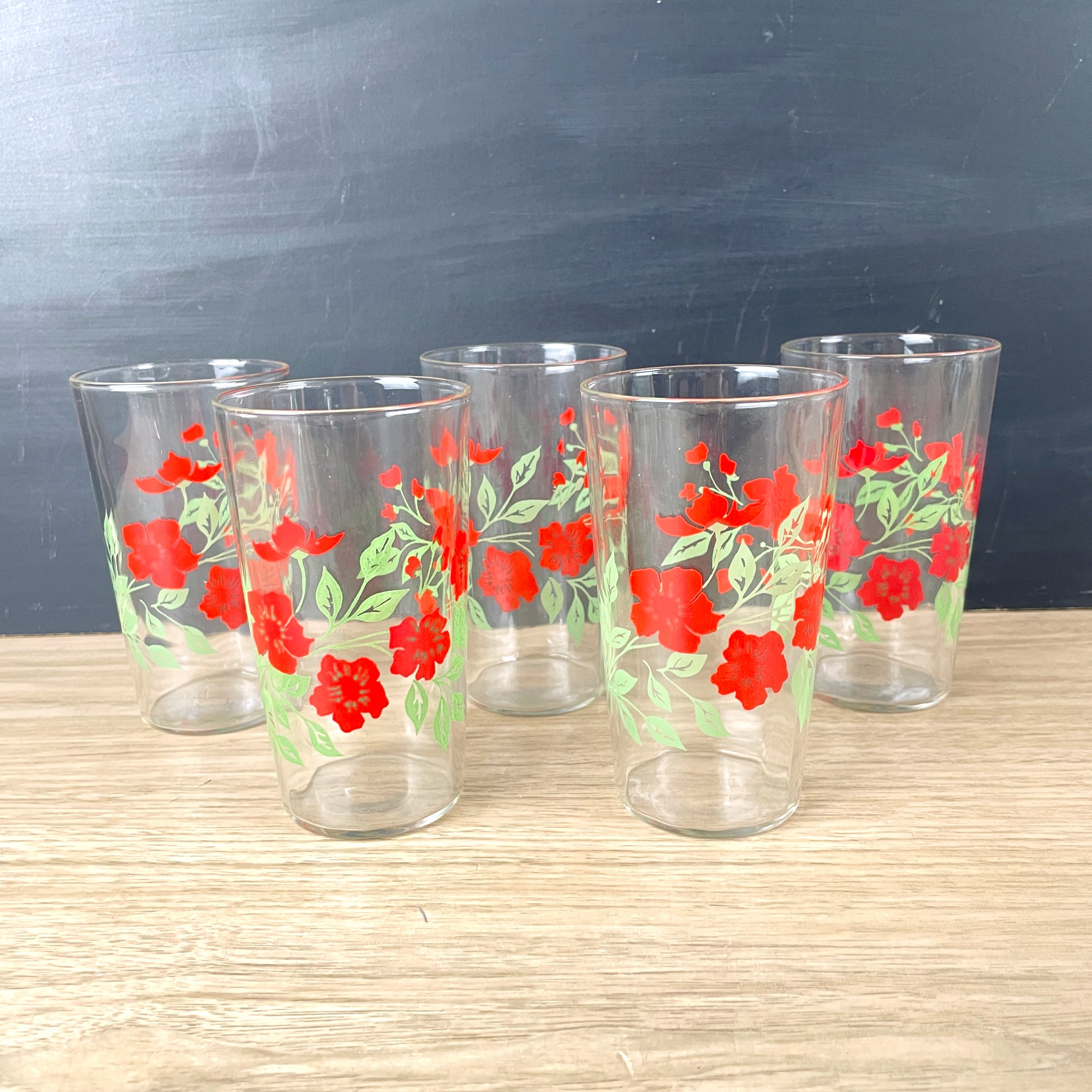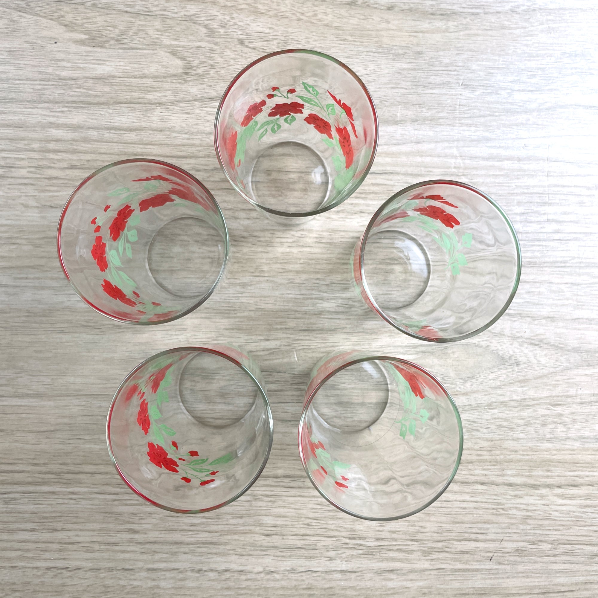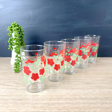 Red printed flower glassware - set of 5 - 1960s vintage glasses