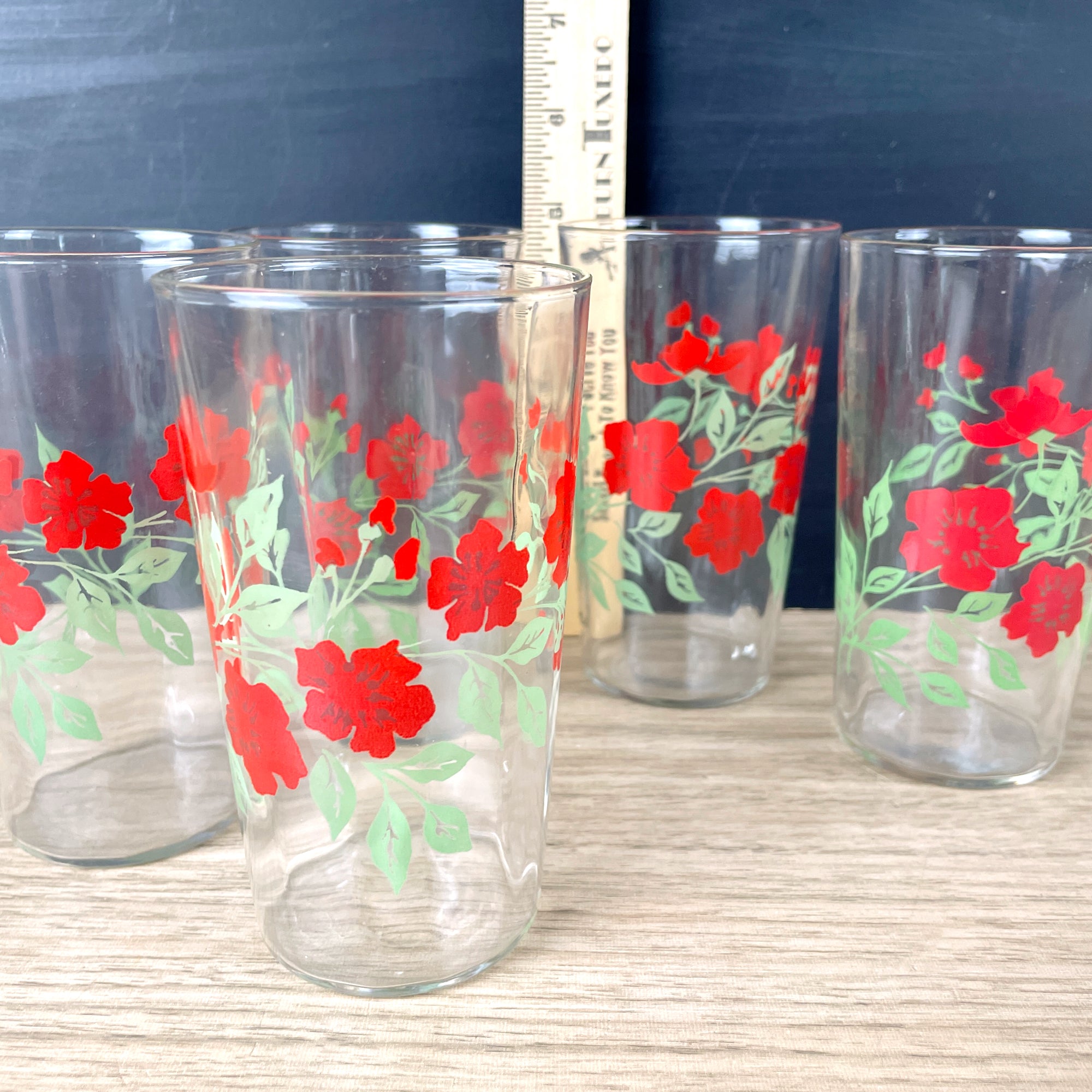 Vintage 1960s paneled glass tumblers with printed carnelian red flowers with pistachio green leaves. Flat bottom glasses.