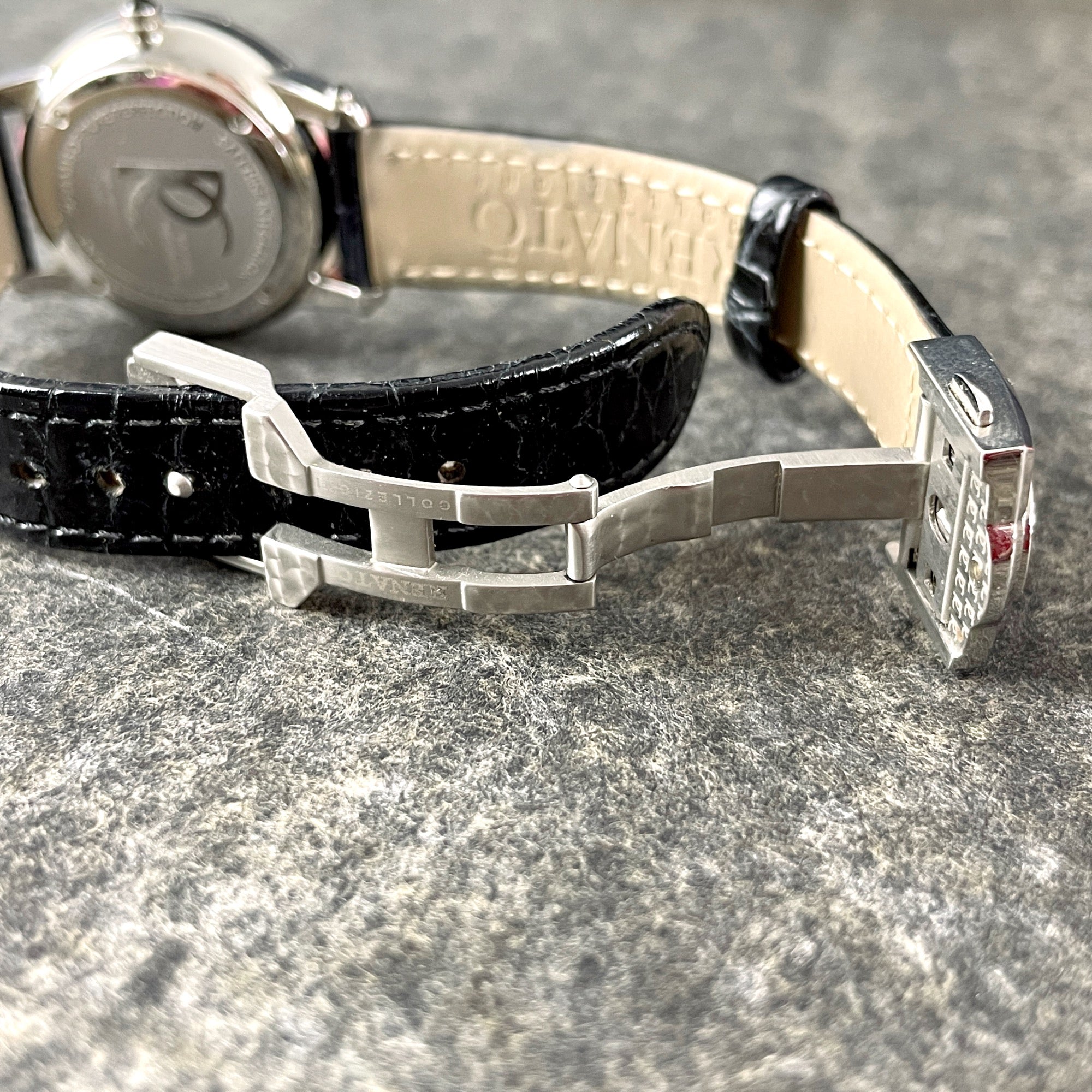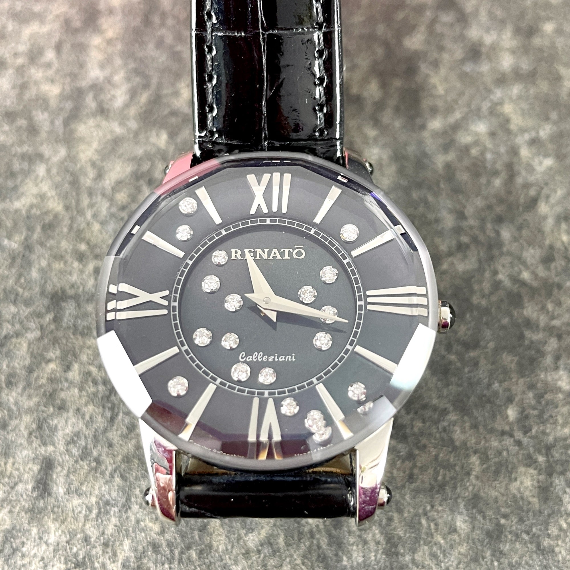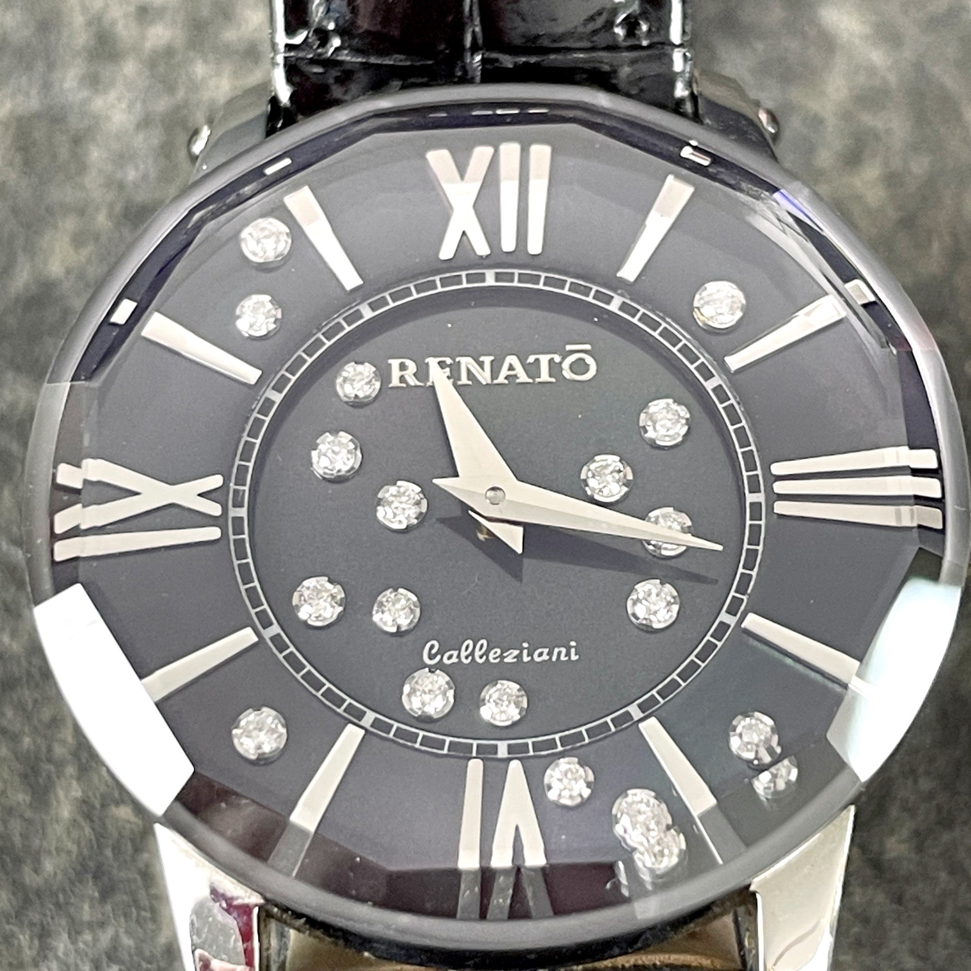 Gently used Renatō Collezioni Beauty Sapphire Diamond LE woman's watch with original box and paperwork. 80/106 limited production. Swiss movement ronda 782. Silver metal. Black leather band with adjustable metal clasp.
