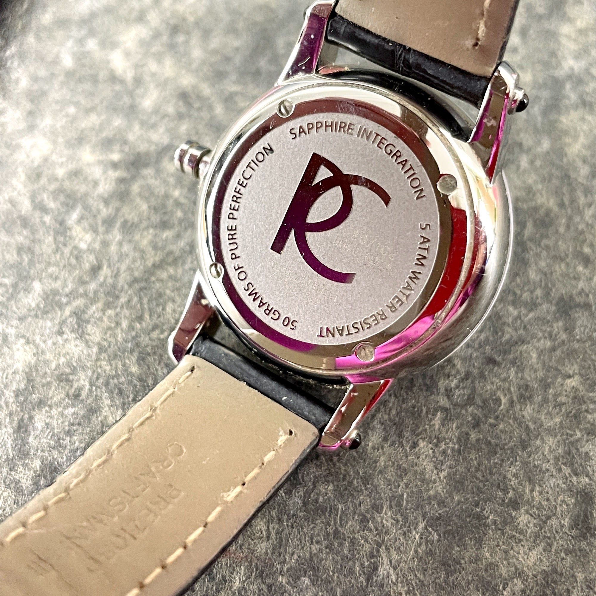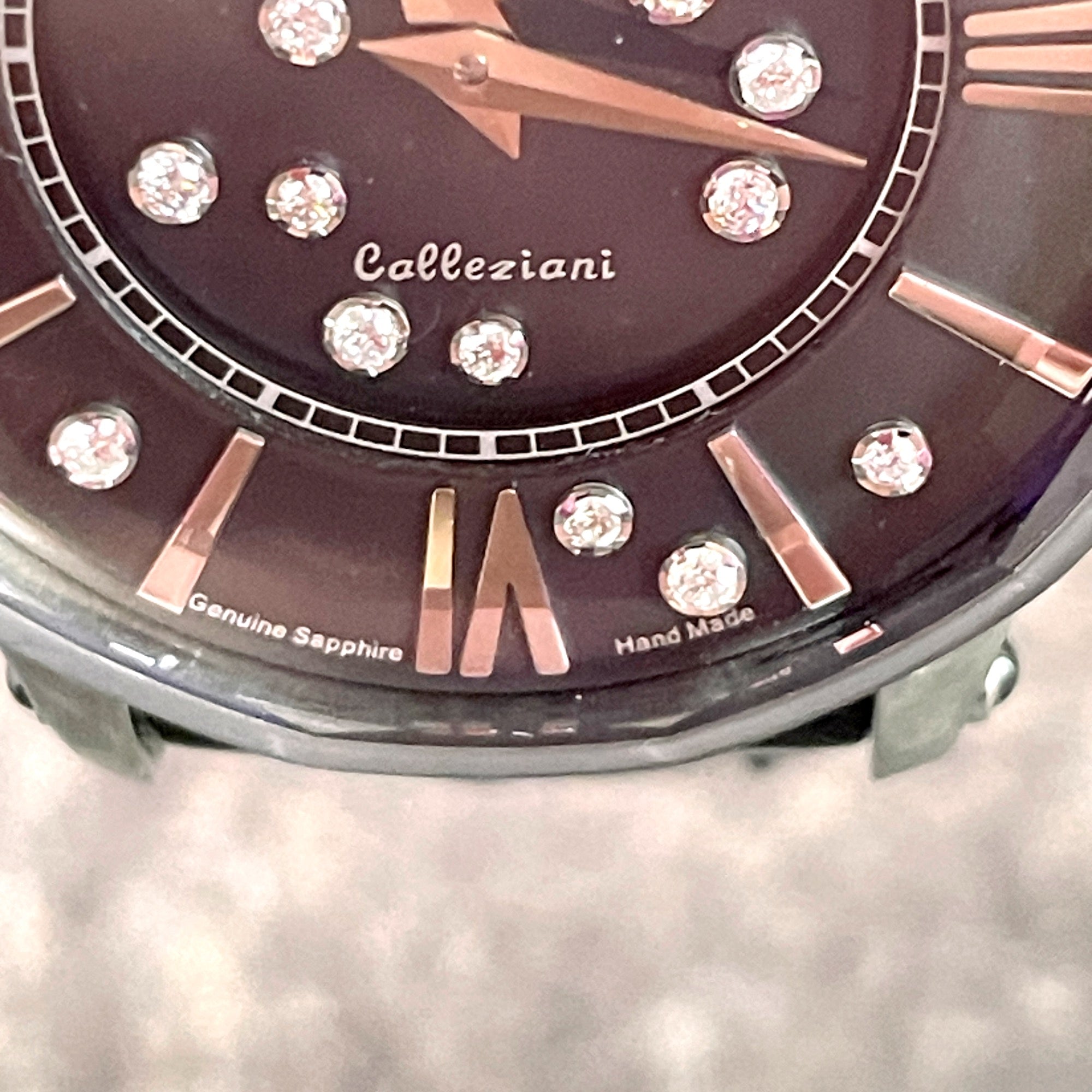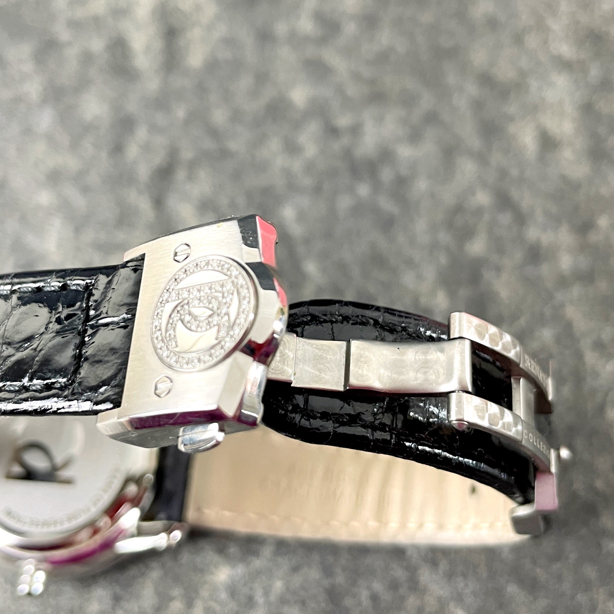Gently used Renatō Collezioni Beauty Sapphire Diamond LE woman's watch with original box and paperwork. 80/106 limited production. Swiss movement ronda 782. Silver metal. Black leather band with adjustable metal clasp.