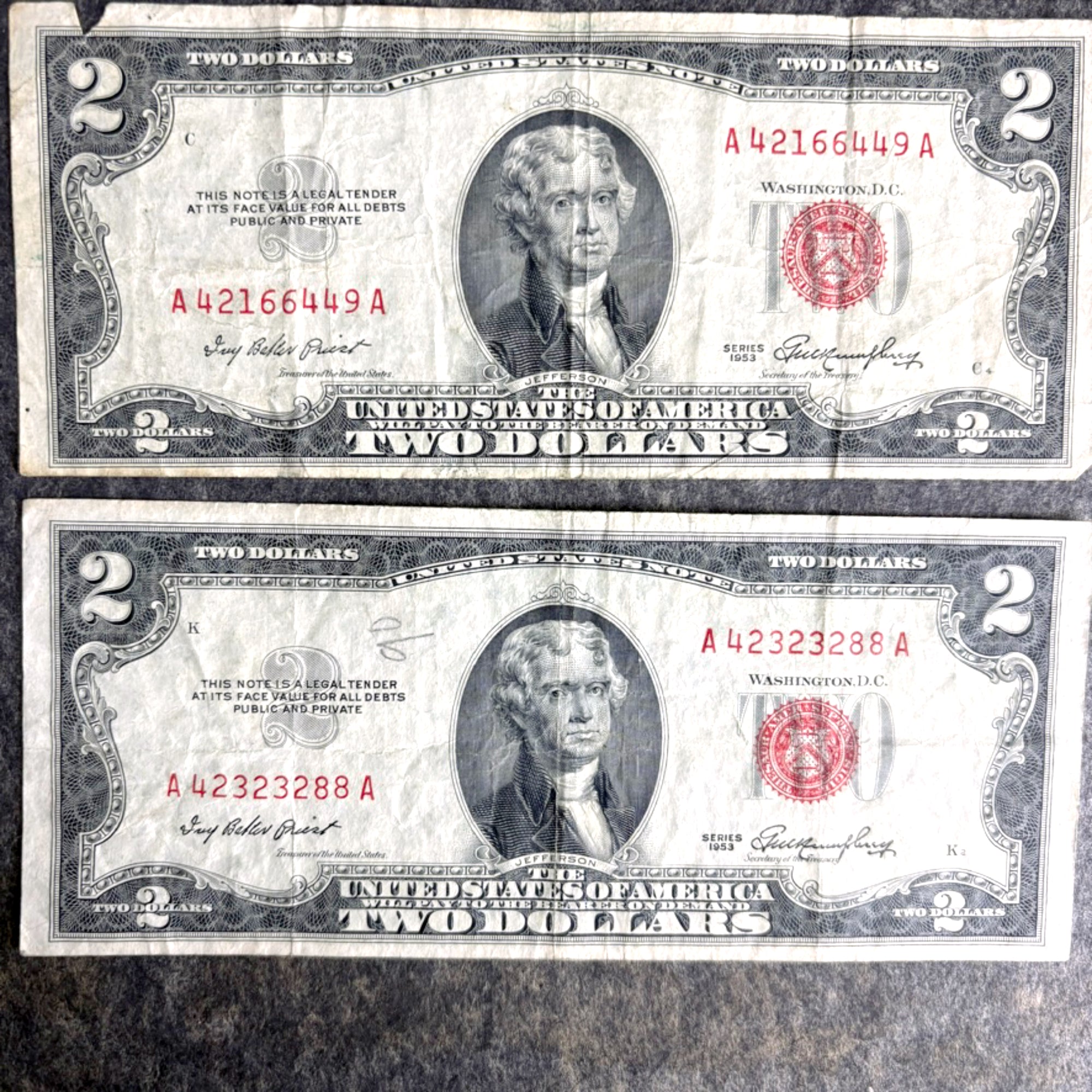 10 vintage Series 1953 red seal $2 bills, issued by the U.S. Treasury. These historic United States Notes bear the signatures of Treasury Secretary George Magoffin Humphrey and Treasurer Ivy Baker Priest.