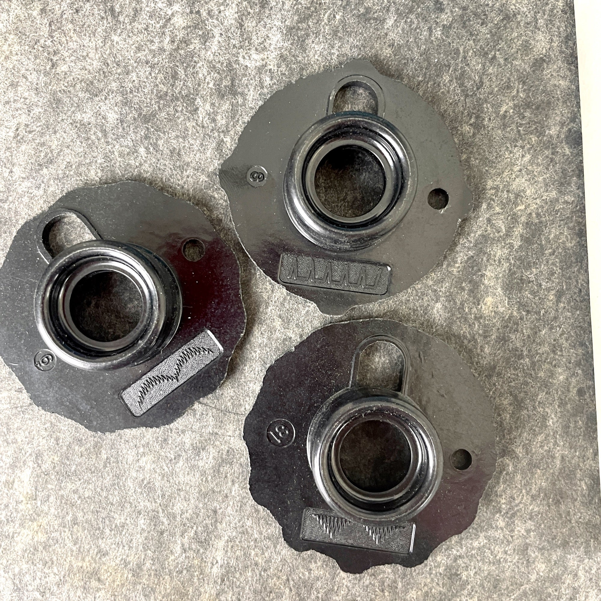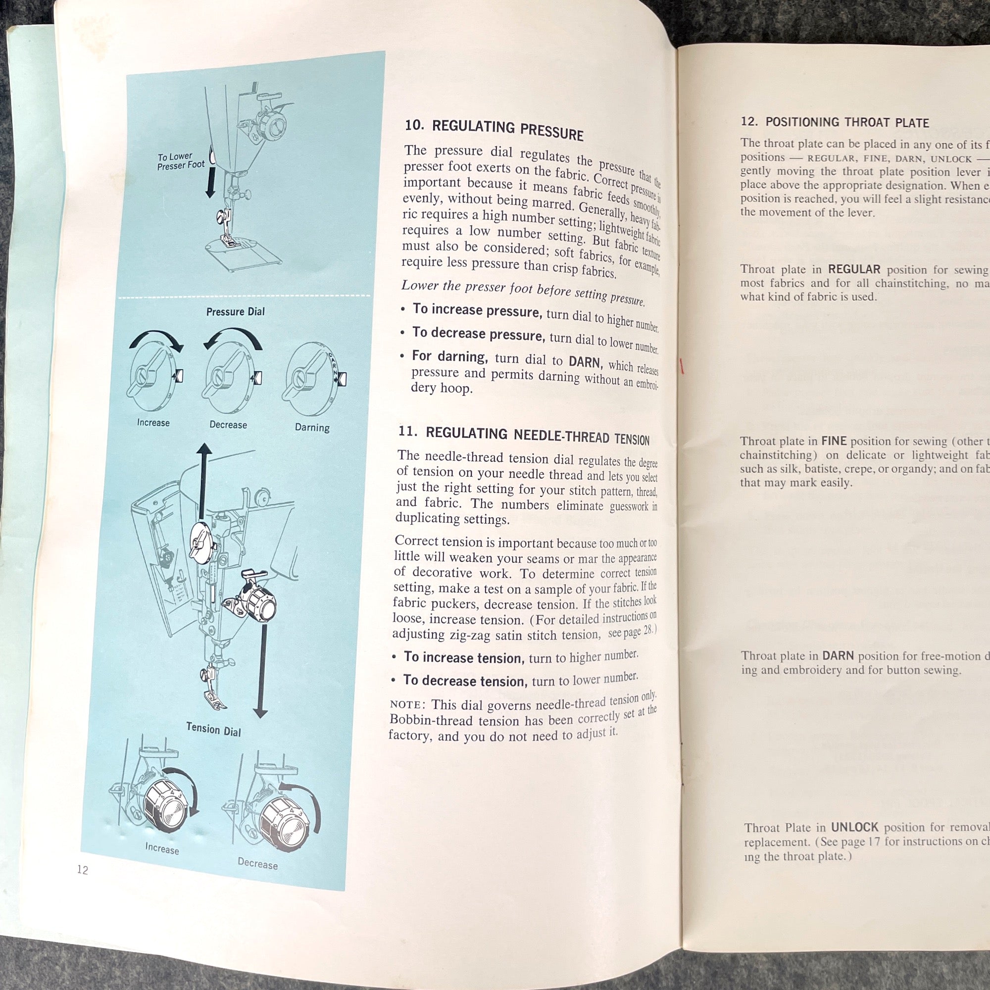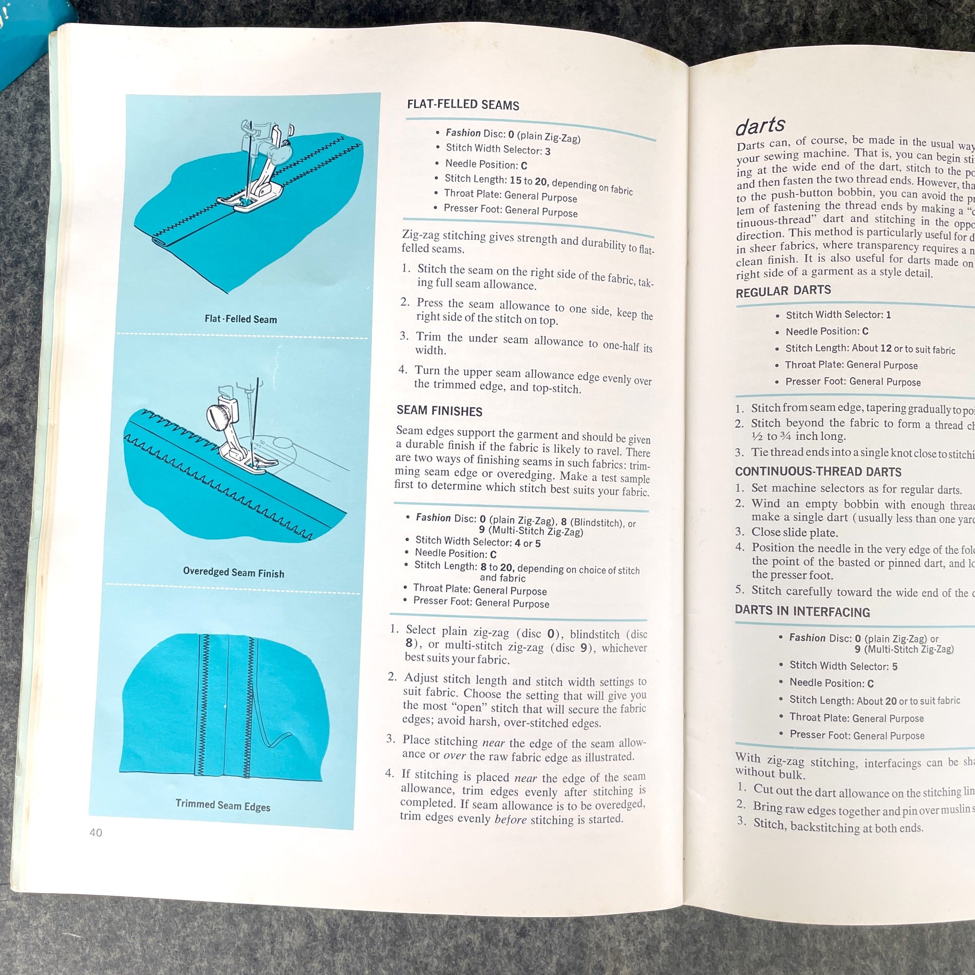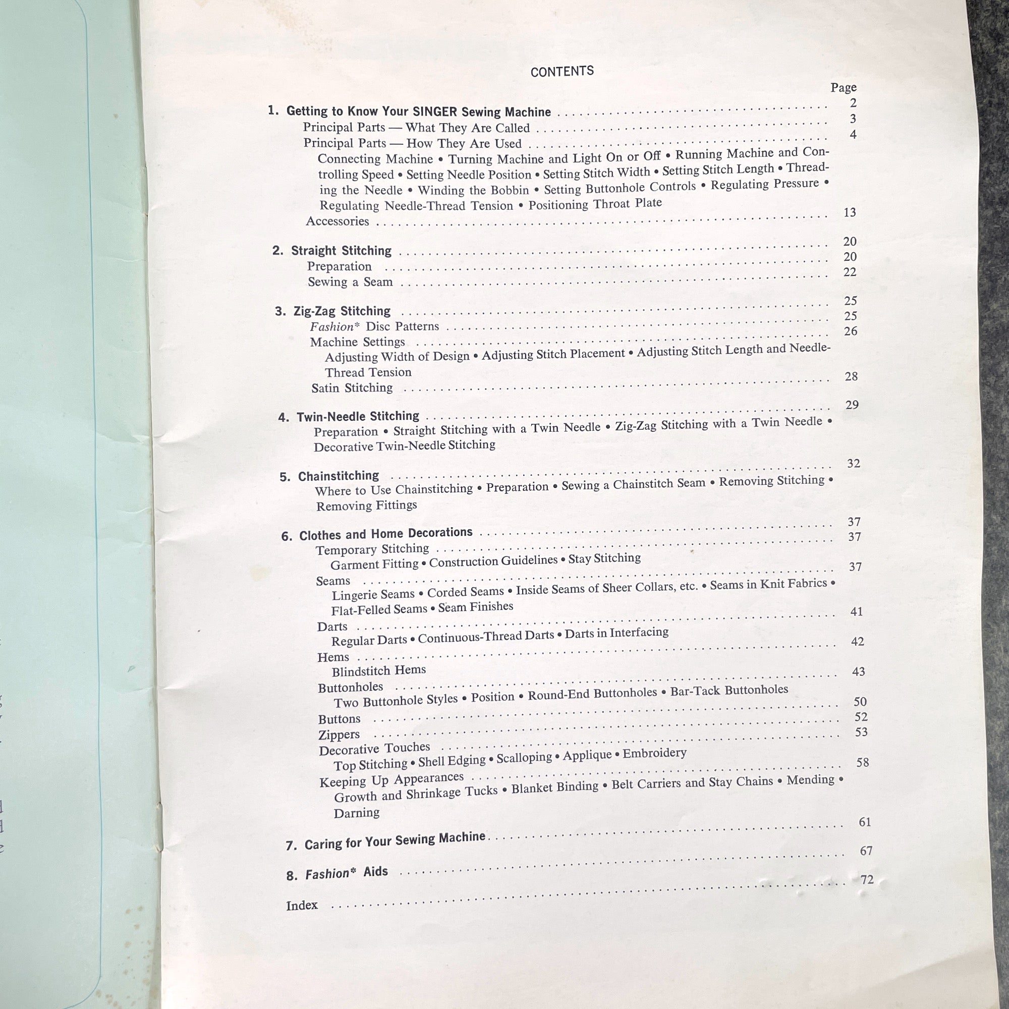 Vintage Singer Touch and Sew special zig-zag sewing machine model 638 manual and accessories in original box. Accessories include 14 fashion disks 1-6, 8-12,14 and 21. Vertical spool pin. The following feet: straight stitch; special purpose; zipper; buttonehole and button. There are 2 throat plates, a straight stitch plate and a chainstitch plate, along with the seam guide, bobbin case cover and thread guide for chainstitching and a cleaning brush.