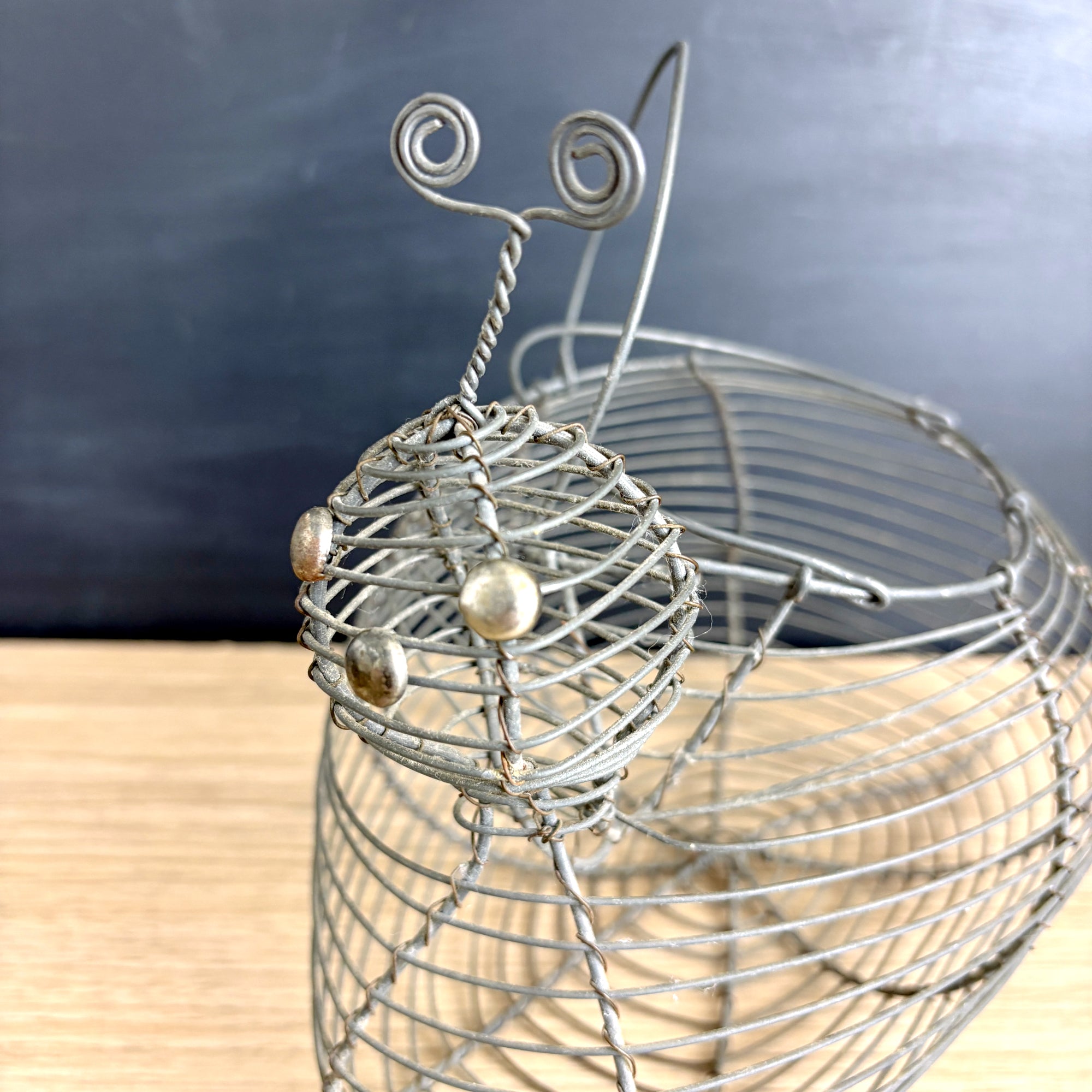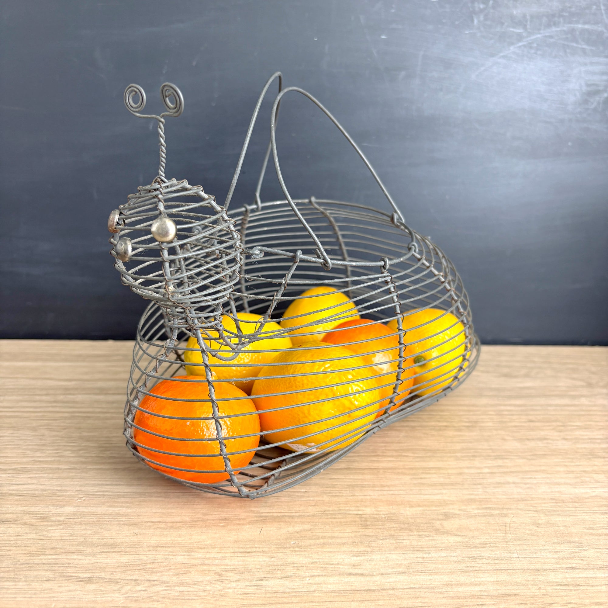 Vintage wire basket is shaped like an adorable snail, with twisted-wire antennae and rivets for eyes and nose. Sturdy metal handles. Use on the table for fruit, in the fridge for eggs, or in the garden for tools or harvesting. Collect shells or clams. We also think it could make a conversation-piece of a purse, as long as privacy isn't an issue. Shabby charm.