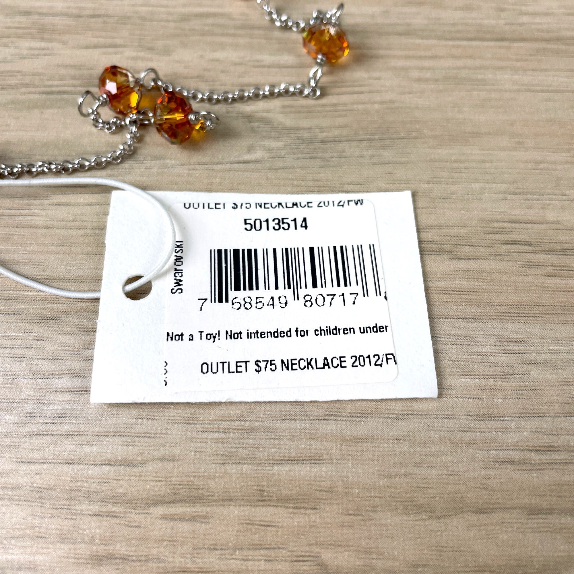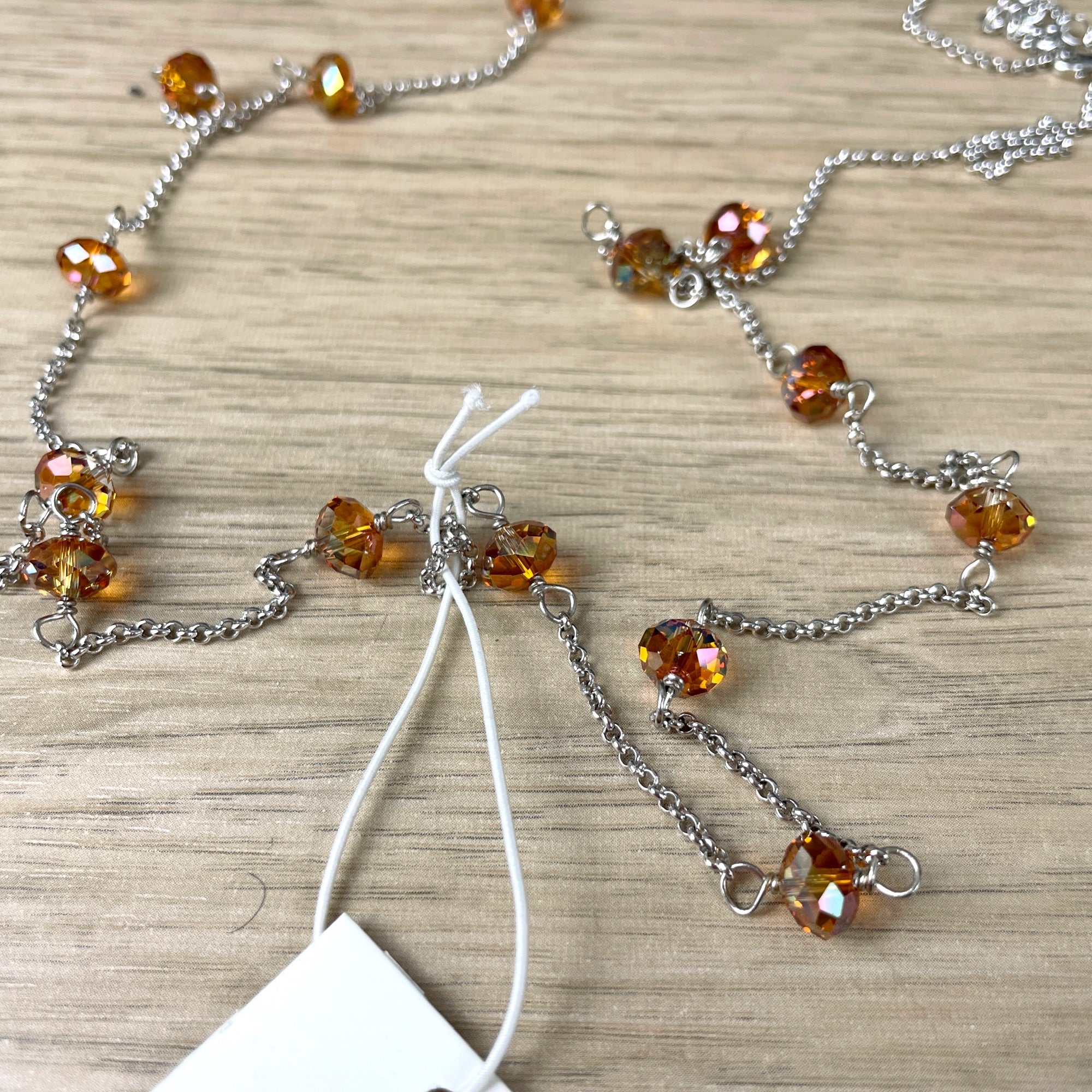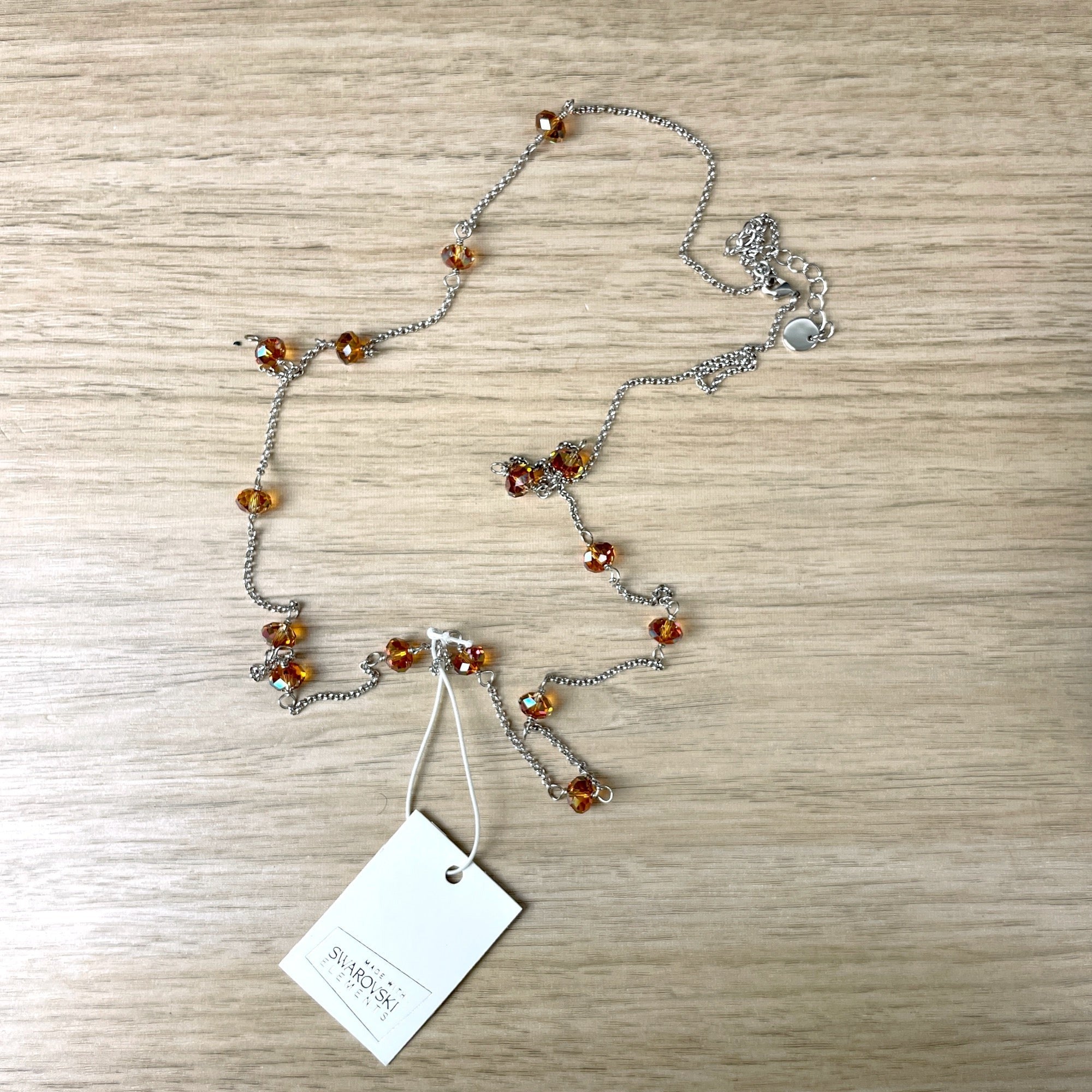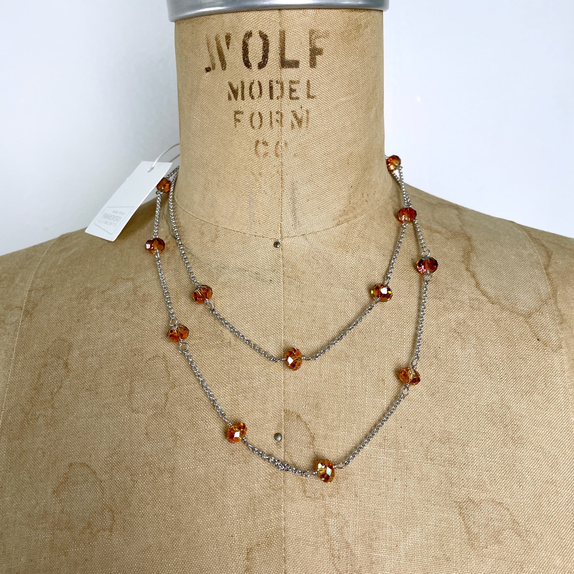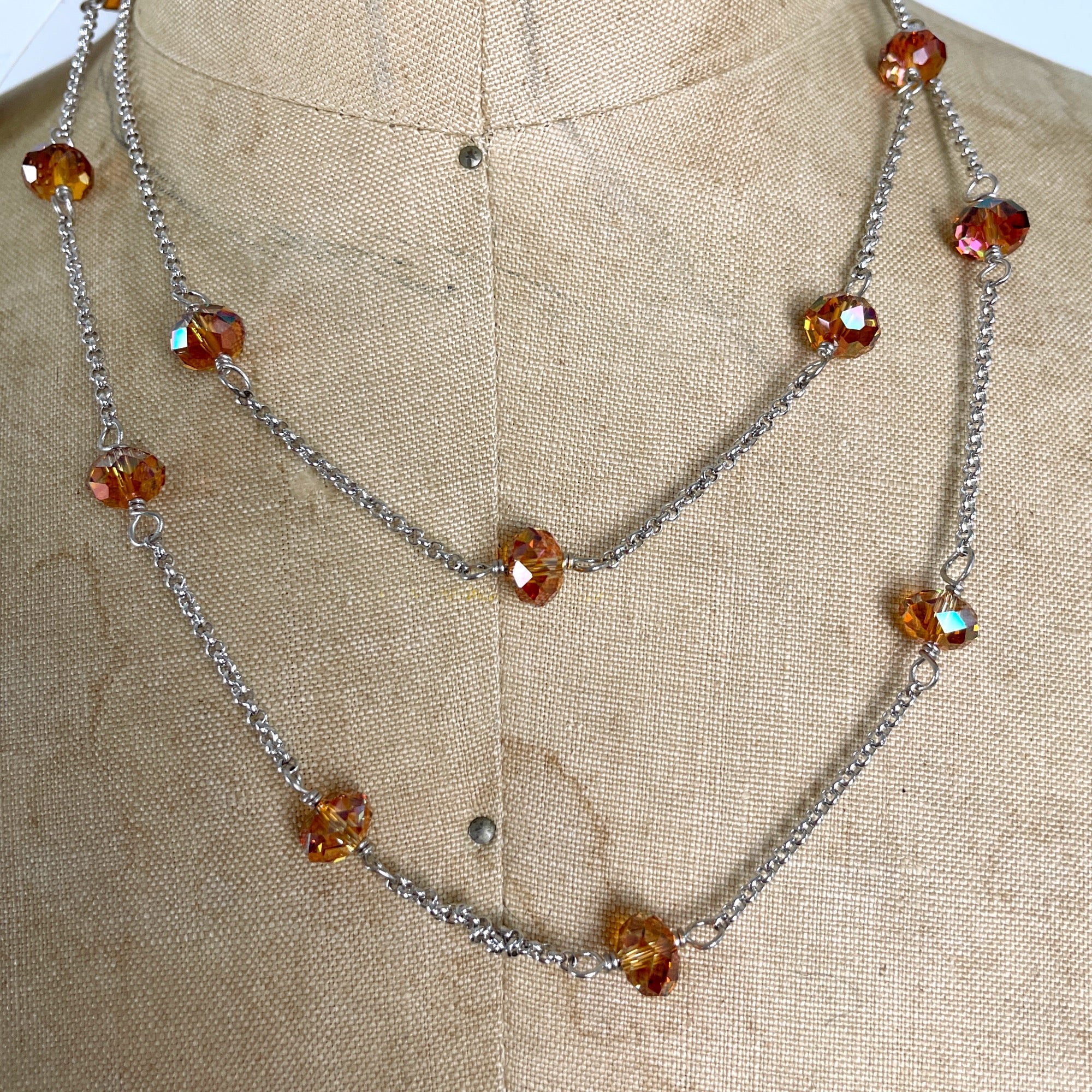 Long necklace with Swarovski elements beads suspended between lengths of chain. Topaz colored beads. From 2014.