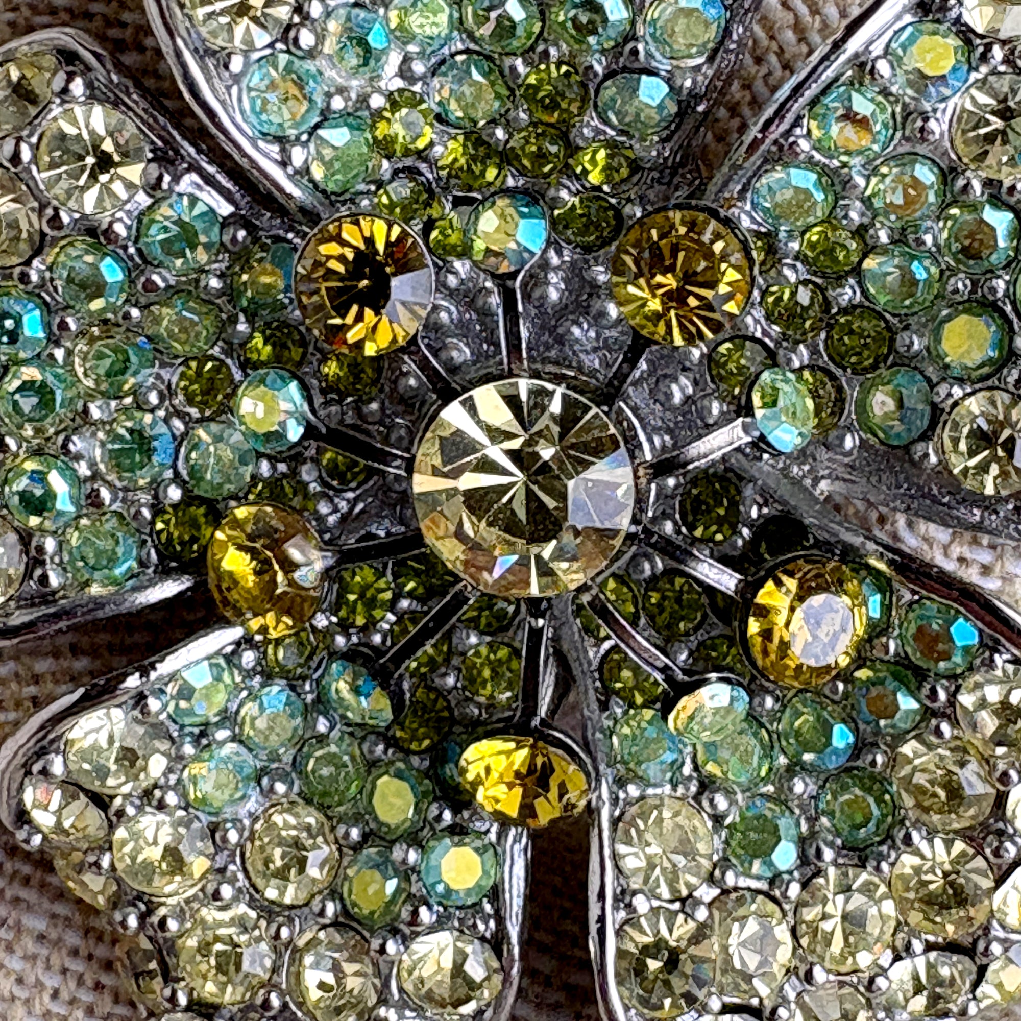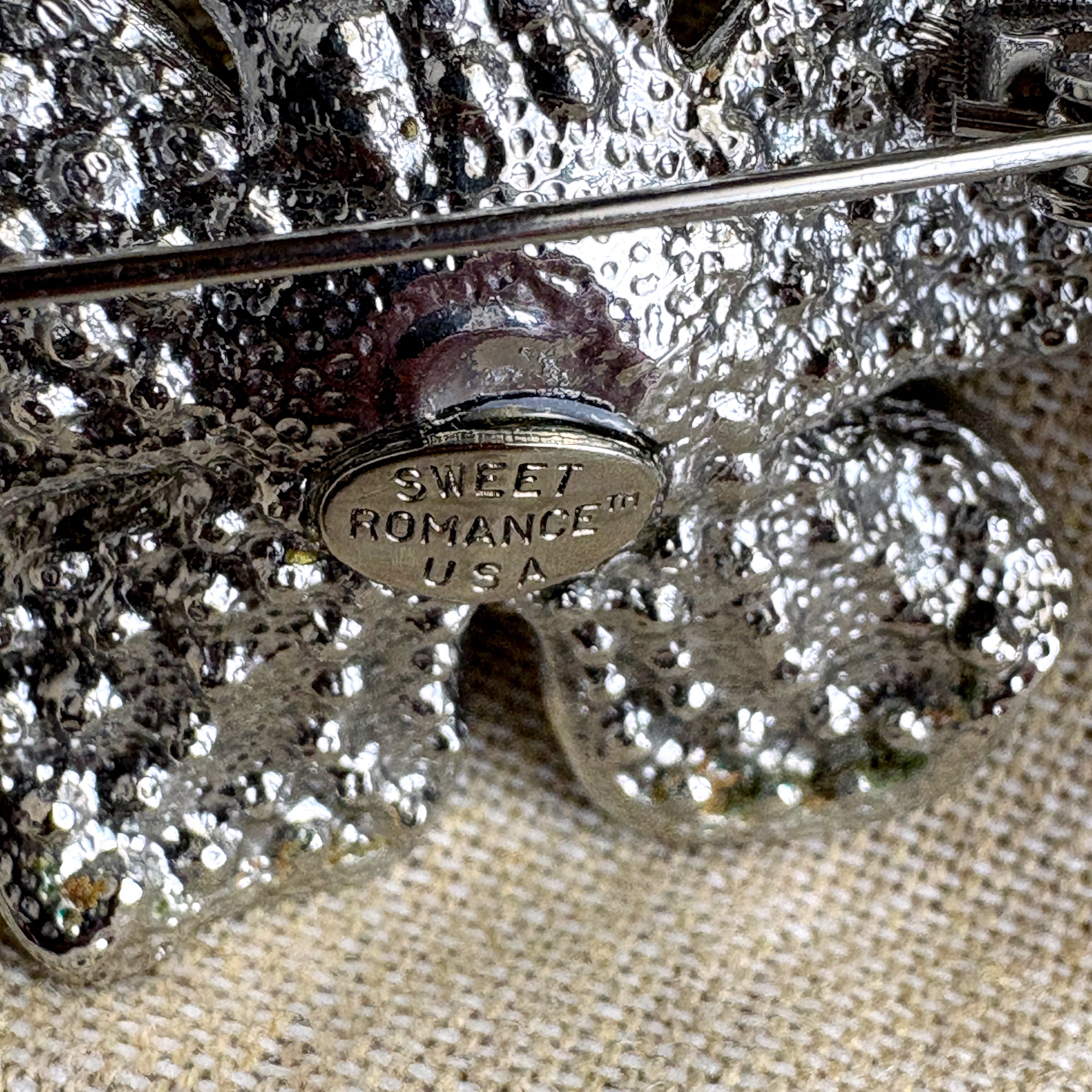 Add a bit of sparkle to your outfit with this Sweet Romance rhinestone flower brooch in blues, golds and greens with silvertone back. Marked Sweet Romance USA.