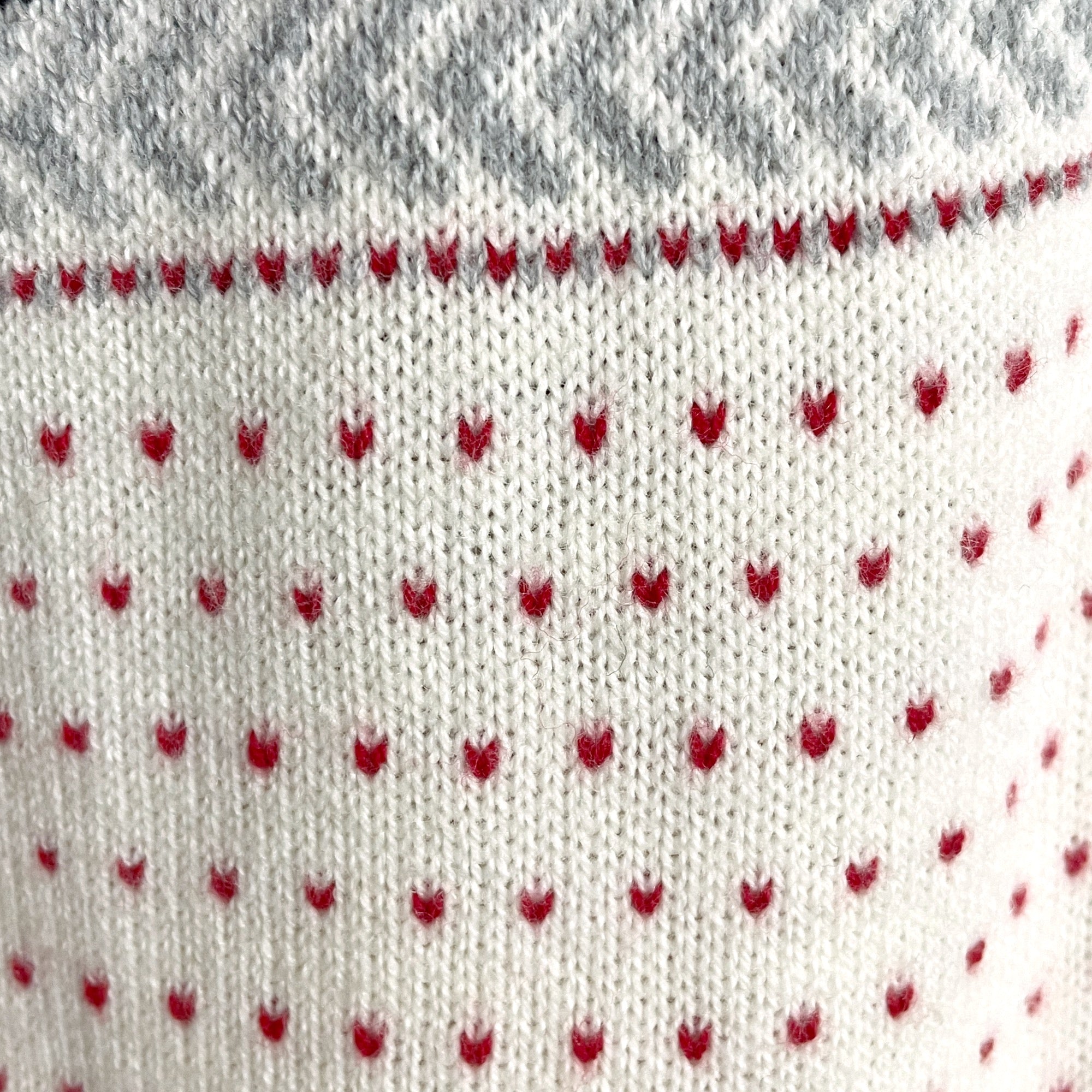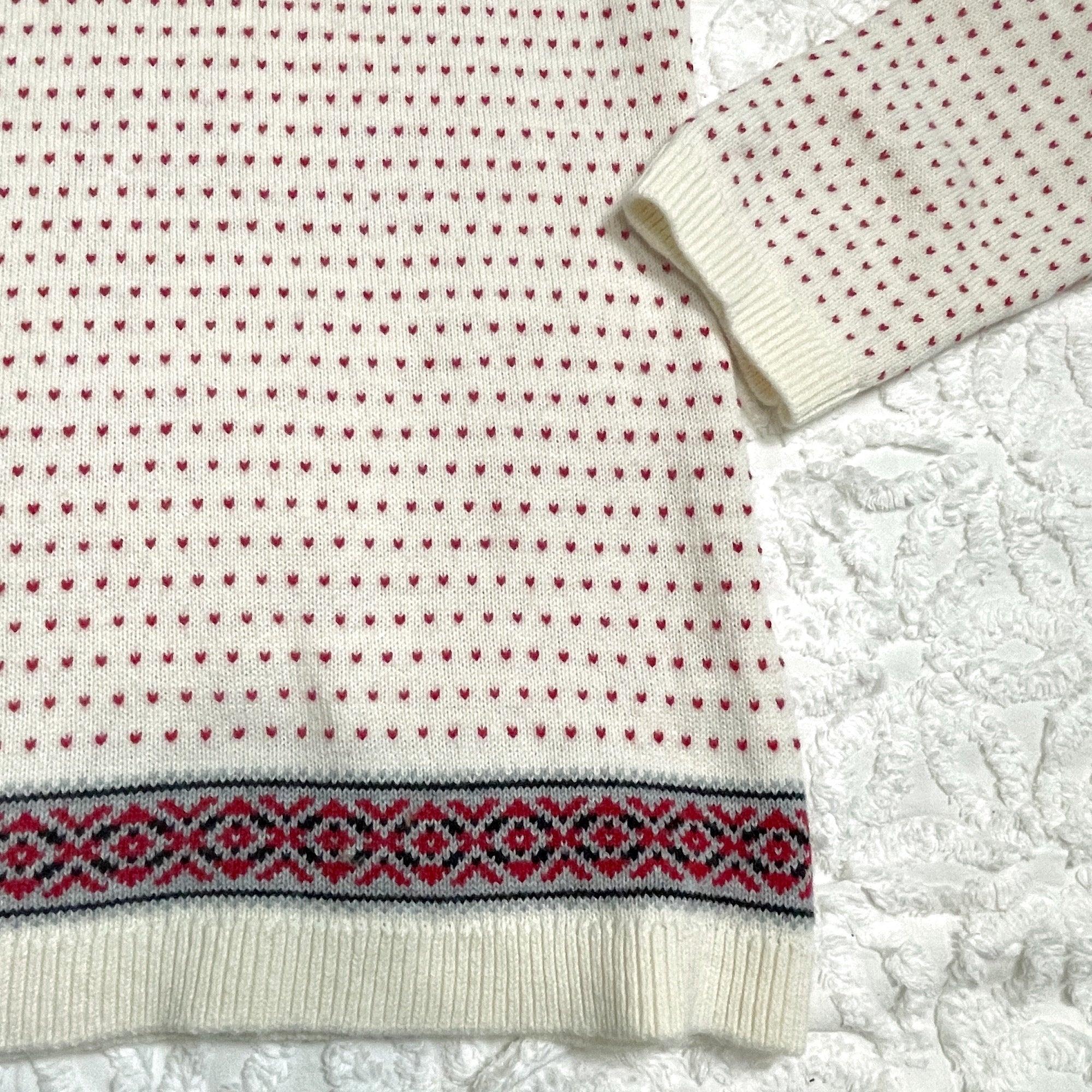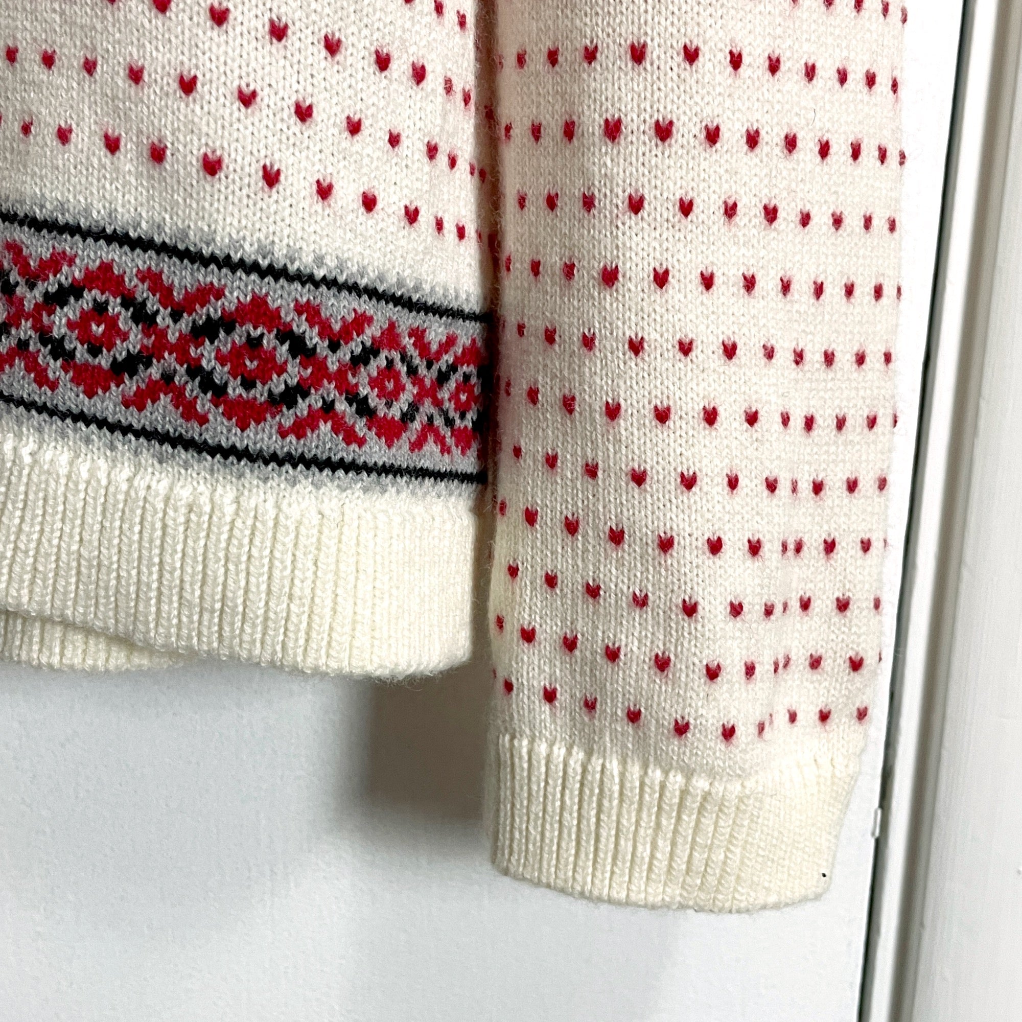 Traditional nordic sweater from Talbot's. Lighter weight sweater, perfect for layering. Raglan sleeves. Ribbing at neck, sleeves and cuffs. Cardinal red, black and cream woven in traditional patterns. Small red accent stitches look like tiny hearts (purely a function of how garments are knit, but a nice detail.)