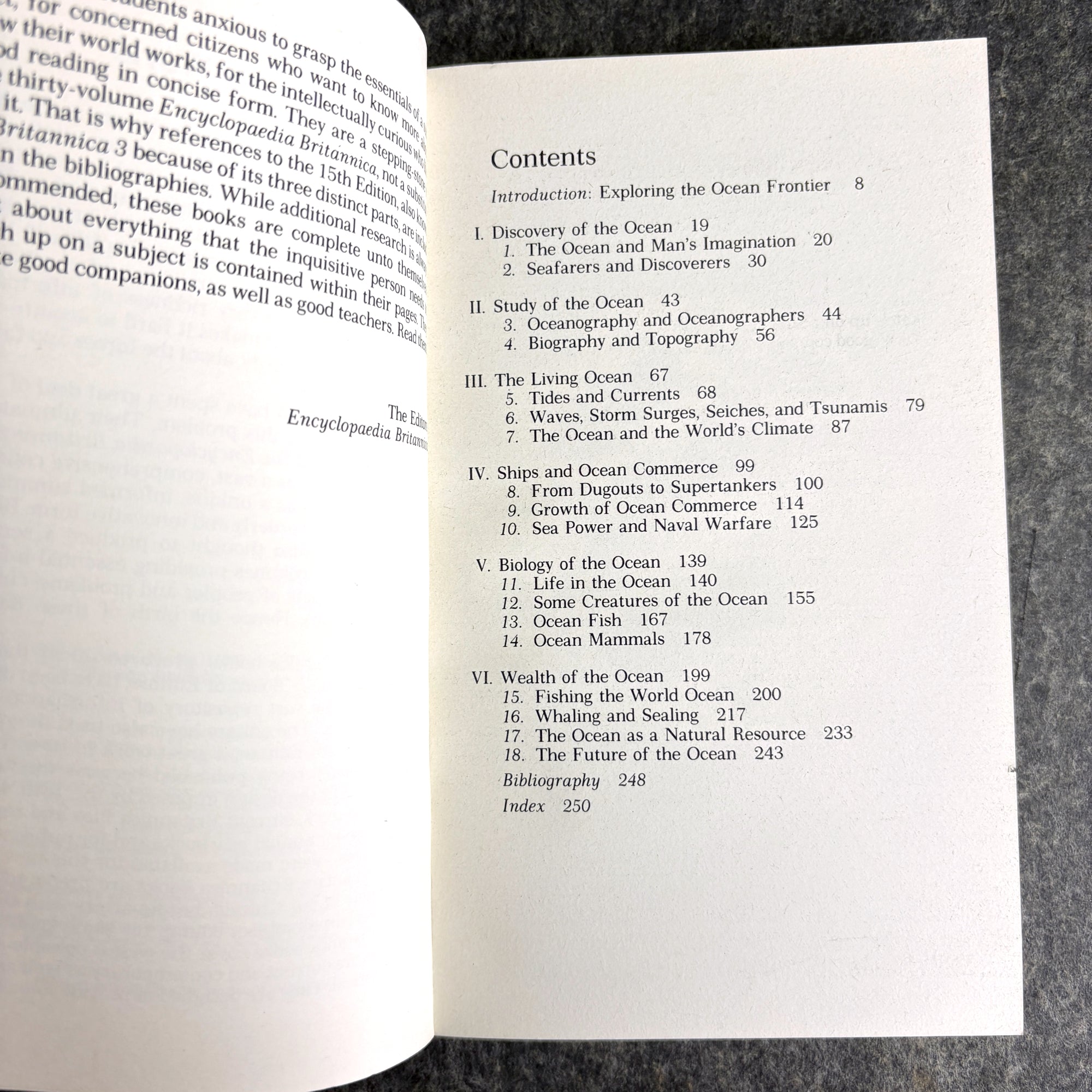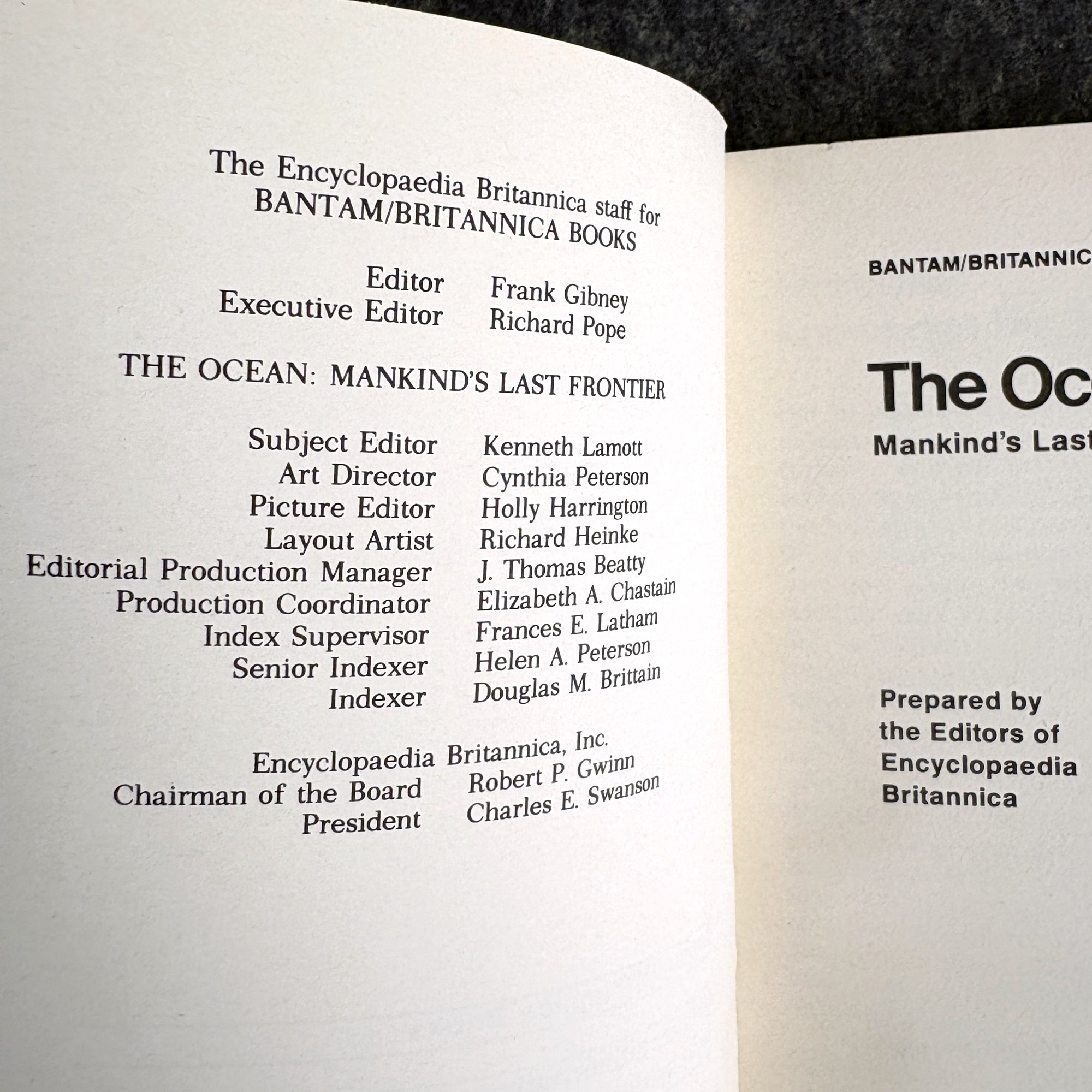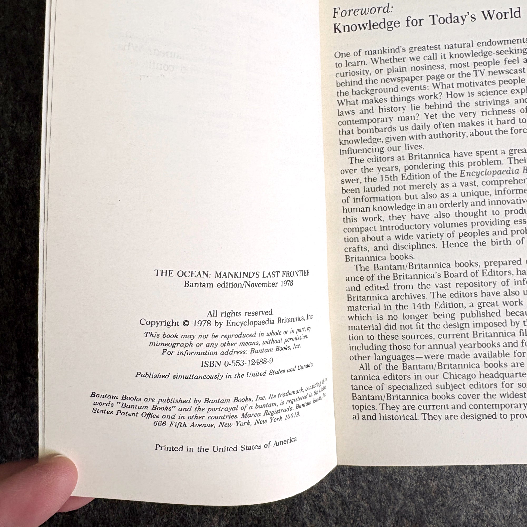 "The Ocean: Mankind's Last Frontier" prepared by the editors of Encyclopædia Britannica. 1978 Bantam paperback. Black and white illustrations and photographs