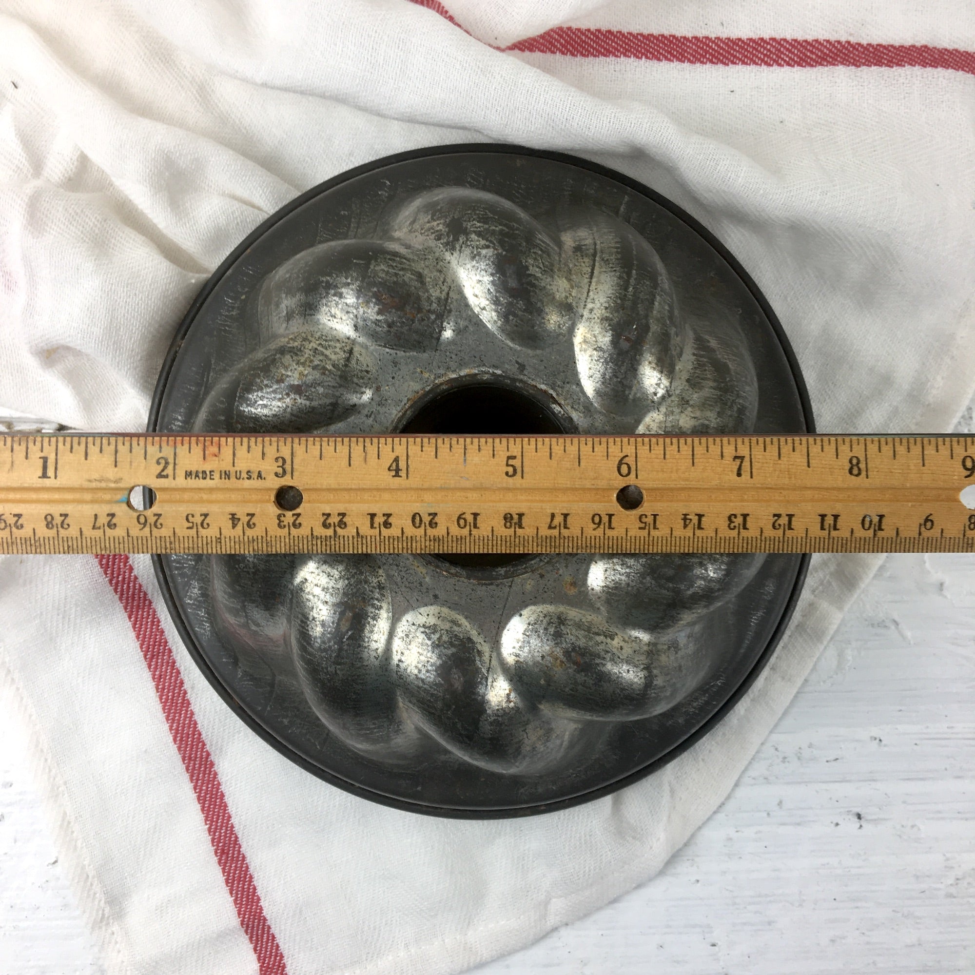 Vintage heavy tinned steel tube cake baking pan. No makers mark. Pan has substantial wear to the tin, making it suitable for decor but not baking. Center cone is slightly taller than sides.