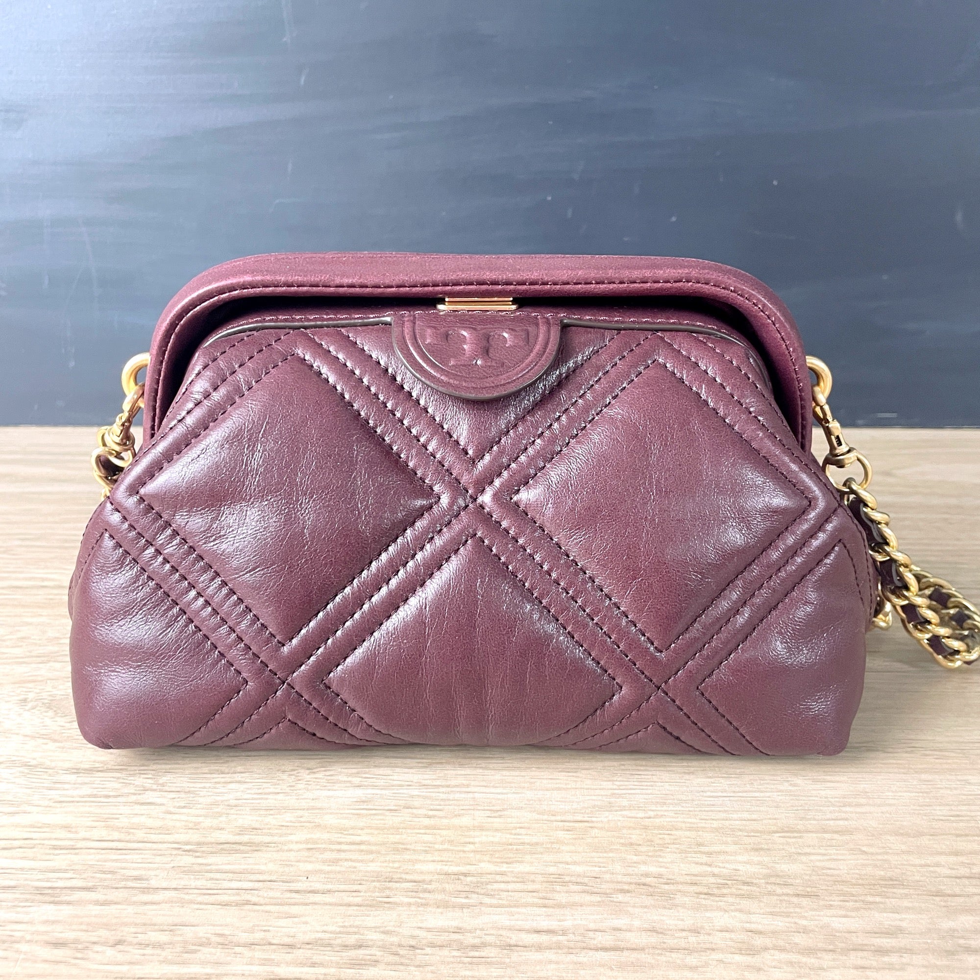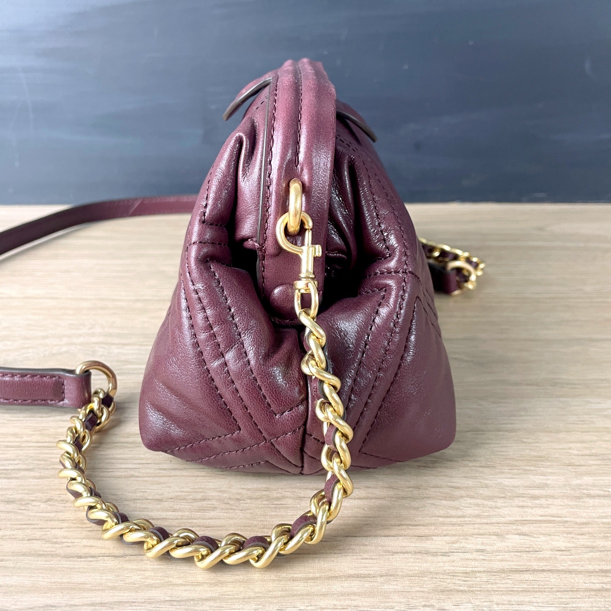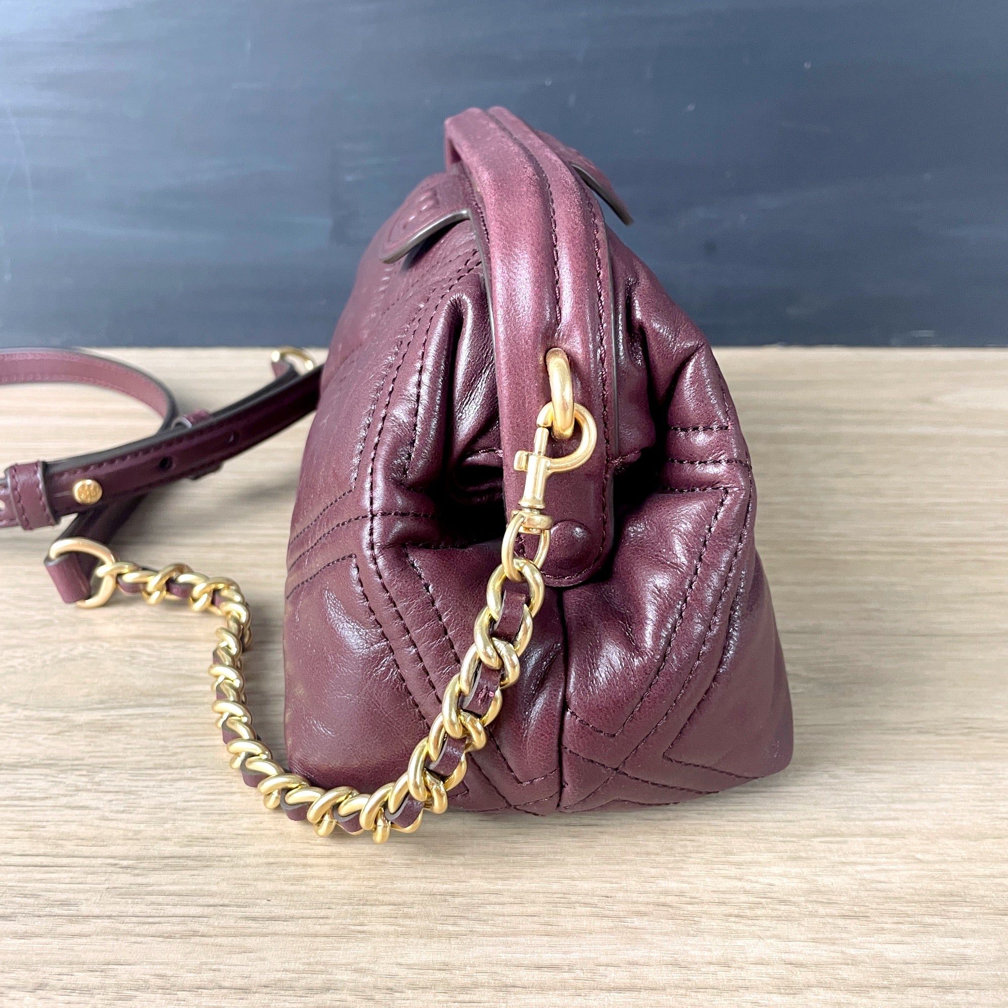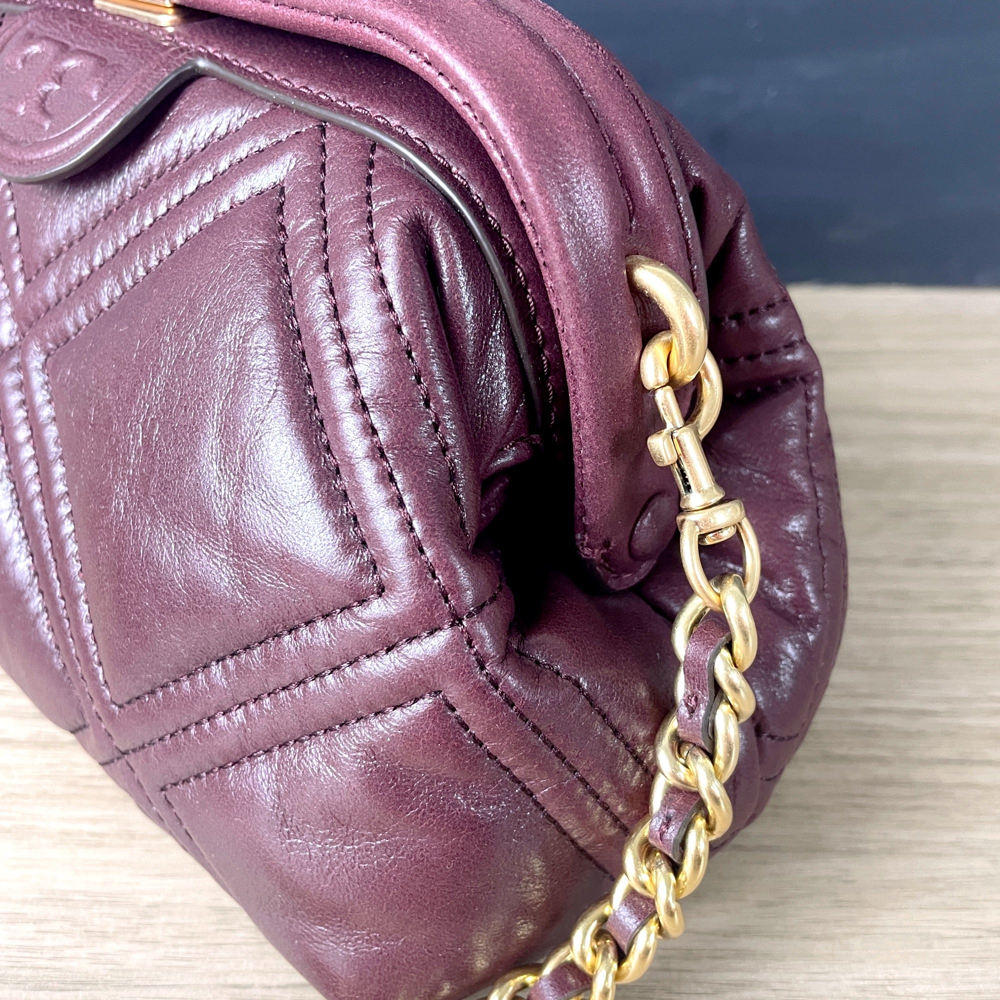 Like new Tory Burch Fleming leather soft frame shoulder bag. Pretty merlot colored quilted leather with embossed T on flaps on both sides. Magnetic snap closure. Adjustable and detachable strap, a combo of metal chain and leather. Textile lined with one zipper and one slip pocket. With dust bag. Retail $598.
